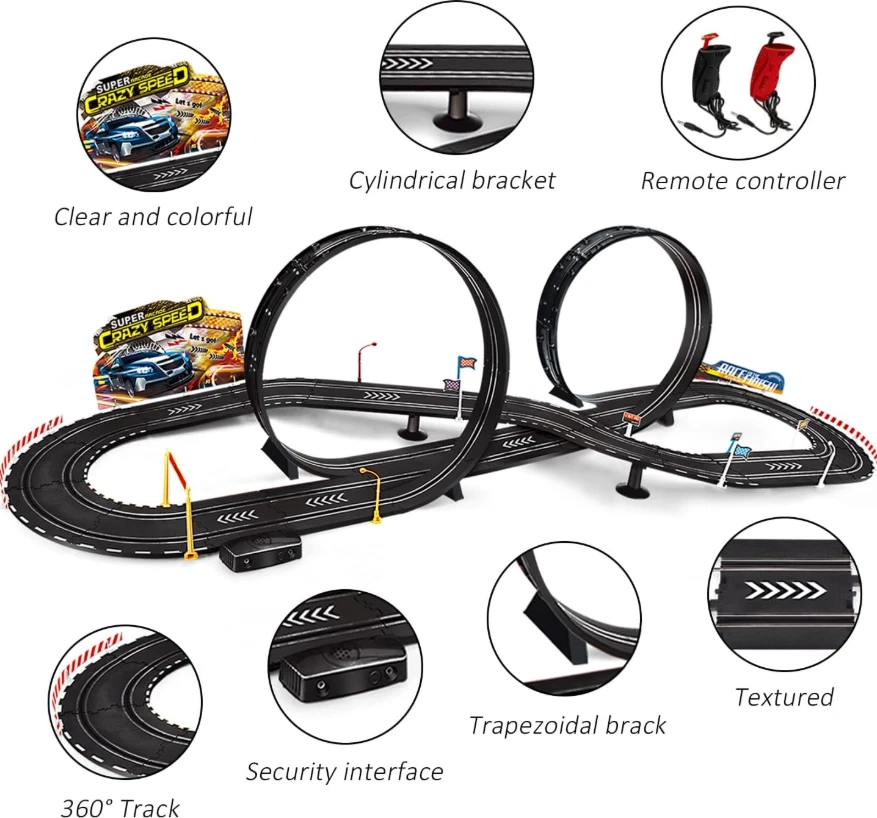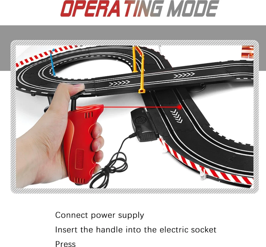 Electric Powered Slot Car Race Track Set - 2 cars of different colors - A perfect slot car set for beginner Racers,for younger kids to learn and develop racing skills at a slower speed! The loop and fly-over turn are both sturdy and easy to put together.includes a number of foundation pieces that help steady the track, along with walls for the turns to prevent the cars from flying off the track. The track goes together well, the cars are nicely detailed and substantial enough that children can handle them easily when putting them on the track. 3 types of operation method - Electric - Manual.all are very use friendly.The speed restrictor maintains a perfect speed to complete the loop and not go too fast on the curves. The electric booster button is fun too because you can add a little more push on the straights. Exciting two-player activity-enjoying the fast-paced head-to-head driving action - race to win and then do it again!Expand your racing options for hours of fun,use track expansion sets, accessories, and a wide selection of additional cars to create challenging new races! Electric Powered Slot Car The Electric Powered Slot Car includes 2x electric-powered controllers and 2x hand crank-powered controllers, with two- speed track loops. The race set includes different layout options to provide endless amounts of fun and variety, and can change the layout in a matter of minutes with the easy-to-connect track for even more racing excitement. Remote Controller Two speed controllers each with a turbo boost button. Use the turbo boost button for an extra speed burst to navigate through a loop, jump a ramp, or to pass the competition. The Track Goes Together Well Powered slot car race track set included to build layout shown or Customize Start with this set featuring tight curves, straight-away, and a junction track section for added excitement to your race. giving you endless possibilities to make the racetrack of your dreams! The Loop and Fly Includes a number of foundation pieces that help steady the track, along with walls for the turns to prevent the cars from flying off the track.