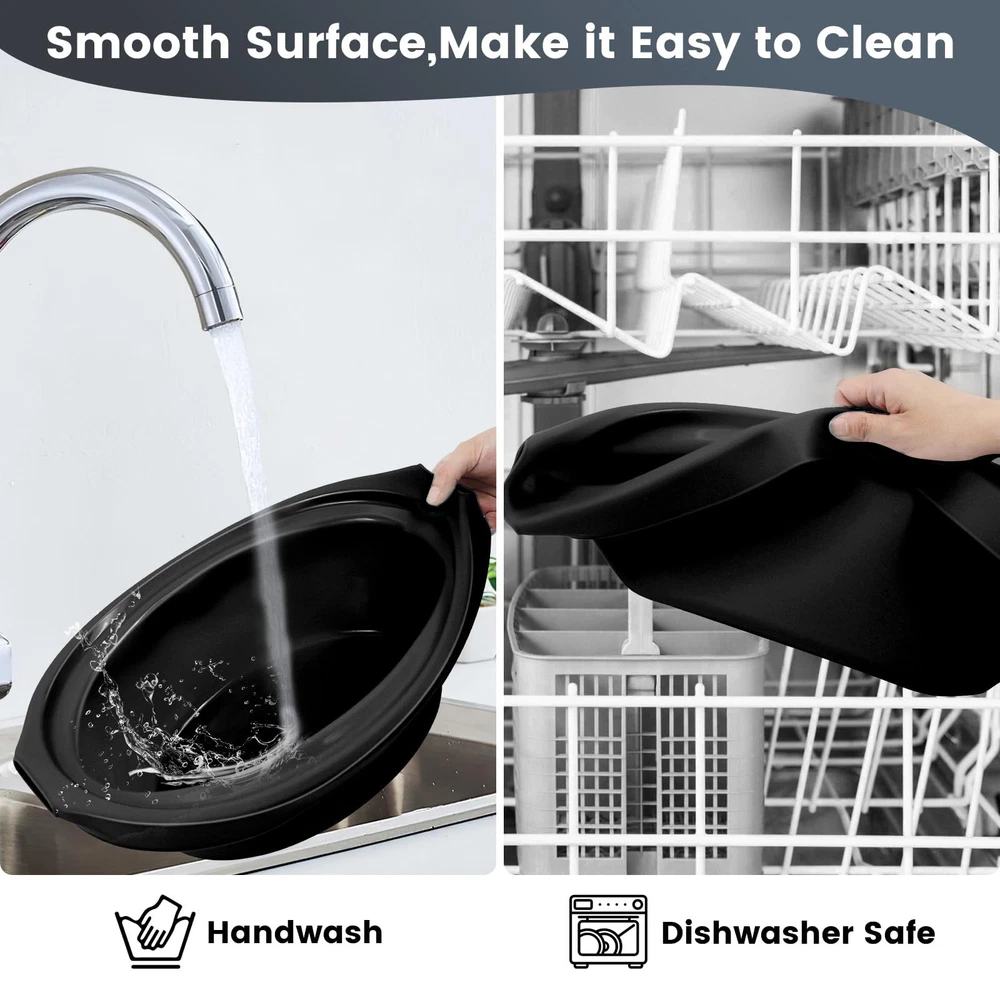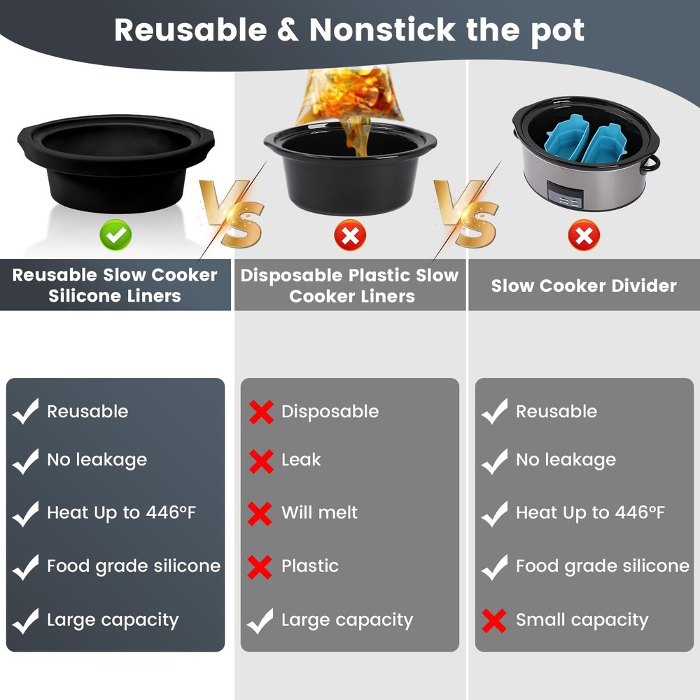 PROLONG THE LIFE OF SLOW COOKER:If you use crock pot for a long time,there will definitely be food residues in the bottom of the pot or scratches.It will reduce the service life of the crock pot.We know that cleaning crock pot is a very troublesome thing,stoneware is too heavy to wash easily.With for crock pot liners,you can keep the stoneware free from sticky,scratches and cracks.Say goodbye to the nightmare of cleaning heavy crock pots! FITS 7-8 QUARTS OVAL SLOW COOKERS:silicone slow cooker liner is designed to fit 7 to 8 quart round or oval slow cookers.Very elastic and flexible,therefore It is not just for specific size crock pots.The effect is different when you put it on different size slow cookers/slow cookers.✅If it's an 8-quart, it will fit just right, and if it's a 7-quart, there's a little room to spare.It can also be used on most 6-quart pots without a problem if you are also comfortable with a slightly looser effect. ABOUT SIZE: silicone slow cooker liner measures 8.07in (W)*11in (L)* 5.5in (H) (bottom),12.2in(W)*15.9in (L).Silicone slow cooker liners is an essential kitchen gadget for anyone who loves to cook with a crock pot or slow cooker.⭕Please double check whether the size is what you need before ordering. FOOD-SILICONE & : Unlike the disposable plastic crock pot liner, our slow cooker liner is made of food-silicone,non-melt,up to 446 ℉,BPA-free,eco-friendly,more safe.It is high-quality silicone inner lining ensures leakproof when cooking.It isn't so thin that it cracks after multiple uses and it isn't so thick that increase cooking time.It is a great way to replace disposable plastic slow cookers liners for crock pots/slow cookers. PRACTICAL DESIGN SLOW COOKER ACCESSORIES:The upgraded crock pot liners large size is intimately designed with the handle to prevent scalding and more conveniently use the liner.With it is non-stick surface design,for effortless cleaning.The inner lining is designed with water level markers for easy measurement.Good elastic and flexible,make it not easy to deform or tear.Its durability guarantees a worry-free cooking experience.It is an excellent kitchen gadgets and cooking accessories. REUASBLE & DISHWASHER SAFE: This reusable slow cooker liners can be used in microwave ovens,ovens,air fryers,and refrigerators storage at the same time.(Note: The temperature needs to be controlled between -20 to 464℉.)After using,just wash the crock pot inserts with warm water or put it into the dishwasher with click to clean it.Enjoy delicious,slow-cooked meals with ease,clean up crock pot silicone liners is a breeze! IMPORTANT TO THE EARTH: is committed to producing reusable Eco-friendly products to make our planet better.Different from other brands of cheap and inferior silicone material,we choose real quality food silicone material,which has passed various certifications including FDA certification.Support environmental protection,love the earth.Our home of the earth will thank you for your contribution to our home. WORRY-FREE SHOPPING: have been improving kitchenware quality requirements and more user-friendly functions,providing customers with the highest quality kitchen utensils.Reusable slow cooker liners is an essential kitchen slow cooker accessories for every family.If you have any questions about the crock pot liners,please don't hesitate to us,we will provide you with a satisfactory solution!