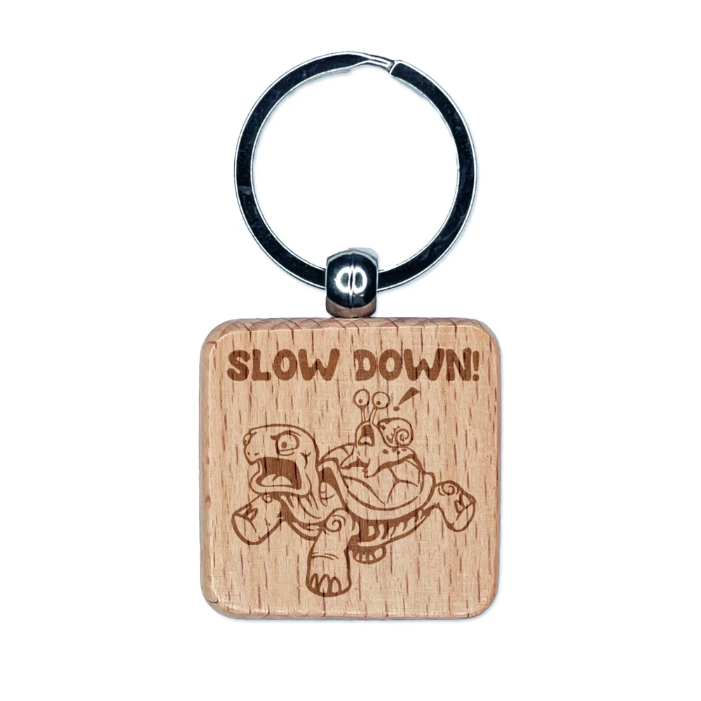 Slow Down Turtle Tortoise and Snail Engraved Wood Square Keychain Tag Charm