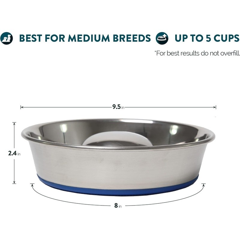 Elevate your dog's mealtime with the Our Pets DuraBowl Slow Feed Stainless Steel Dog Food Bowl. Engineered for safety, the solid centerpiece design encourages slower, mindful eating, reducing choking hazards and aiding digestion. The patented skid-proof bottom ensures stability, preventing sliding and tipping. Crafted from durable stainless steel, this bowl offers a healthier alternative to plastic, challenging your pet's mind during meals. Dishwasher-safe for effortless cleaning, it remains rust-resistant and minimizes odors. Available in three sizes (Small, Medium, Large), accommodating various breeds. Prioritize your dog's well-being and mealtime happiness with the DuraBowl's innovation and durability. Slow Feeder Dog Bowl Benefits: A slow feeder dog bowl can help reduce choking. When eating from this slow feeder dog bowl, the solid centerpiece design causes them to eat along the edge with more mental attention, resulting in a slower feeding routine. Patented Skid-Proof Bottom: The DuraPet slow feeder dog bowl is a top-of-the-line design at an affordable price. To prevent skidding, a permanently bonded ring was added to the bottom. This design prevents sliding and tipping during feeding time. Slow Feeder Made of Heavyweight, Durable Stainless Steel: Durable, long-lasting stainless steel dog bowls offer a healthy alternative to plastic. A great alternative to snuffle mats for dogs, lick mats for dogs, and dog puzzle toys. Dishwasher Safe Dog Bowls: Dishwasher-safe for easy cleaning. Our dog slow feeder bowl dog dishes are rust resistant, hygienic, and don’t hold odors. Available in Three Sizes: Small: holds up to 3 cups of dry food, Medium: holds up to 5 cups of dry food, Large: holds up to 8 cups of dry food.