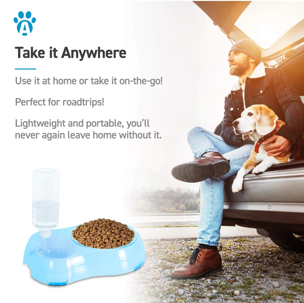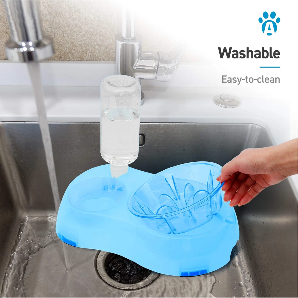 Slow Feeder System includes a gravity-feed 500 ml water bottle, removable slow feed food bowl and 2 bowl raised stand. Raised stand feature anti-slip rubber pads for secure positioning on kitchen floors and finger grooves for easy lifting. Slow feed bowl has nubs to help slow down eating for a more enjoyable healthy mealtime. Bowl can also be tilted or left level with stand. Dog bowl and stand are made using thermoplastic rubber that is BPA free and bite resistant. Measures 12.9" x 6.2" x 2.5". BETTER DIGESTION– Slow Feeder System promotes slow eating and drinking habits for a more enjoyable and healthy mealtime. GREAT FOR SMALL PETS – Pet bowl system is sized for small dogs and cats, puppies, kittens, rabbits, ferrets and other small pets. GRAVITY FEED WATER DISPENSER – 500ml water bottle is designed to automatically fill the water bowl as pet drinks. Helps provide fresh water throughout the day. BPA FREE – Eco-friendly & BPA free thermoplastic rubber is food & water safe, durable, lightweight and non-. EASY TO CLEAN – Feeding bowl and water bottle are removable for easy cleaning. Simply wash in warm soapy water and rinse well. Dry bowl well before filling with dry food.