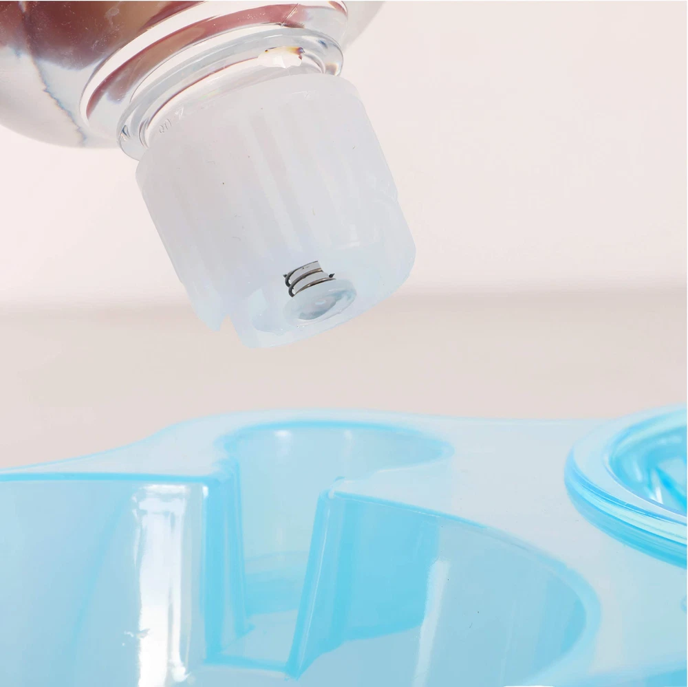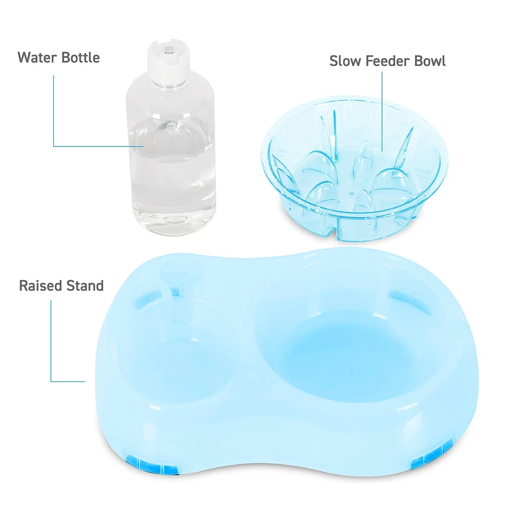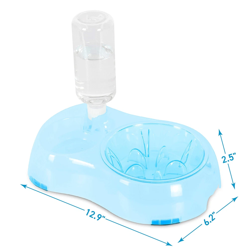 Slow Feeder System includes a gravity-feed 500 ml water bottle, removable slow feed food bowl and 2 bowl raised stand. Raised stand feature anti-slip rubber pads for secure positioning on kitchen floors and finger grooves for easy lifting. Slow feed bowl has nubs to help slow down eating for a more enjoyable healthy mealtime. Bowl can also be tilted or left level with stand. Dog bowl and stand are made using thermoplastic rubber that is BPA free and bite resistant. Measures 12.9" x 6.2" x 2.5". BETTER DIGESTION– Slow Feeder System promotes slow eating and drinking habits for a more enjoyable and healthy mealtime. GREAT FOR SMALL PETS – Pet bowl system is sized for small dogs and cats, puppies, kittens, rabbits, ferrets and other small pets. GRAVITY FEED WATER DISPENSER – 500ml water bottle is designed to automatically fill the water bowl as pet drinks. Helps provide fresh water throughout the day. BPA FREE – Eco-friendly & BPA free thermoplastic rubber is food & water safe, durable, lightweight and non-. EASY TO CLEAN – Feeding bowl and water bottle are removable for easy cleaning. Simply wash in warm soapy water and rinse well. Dry bowl well before filling with dry food.