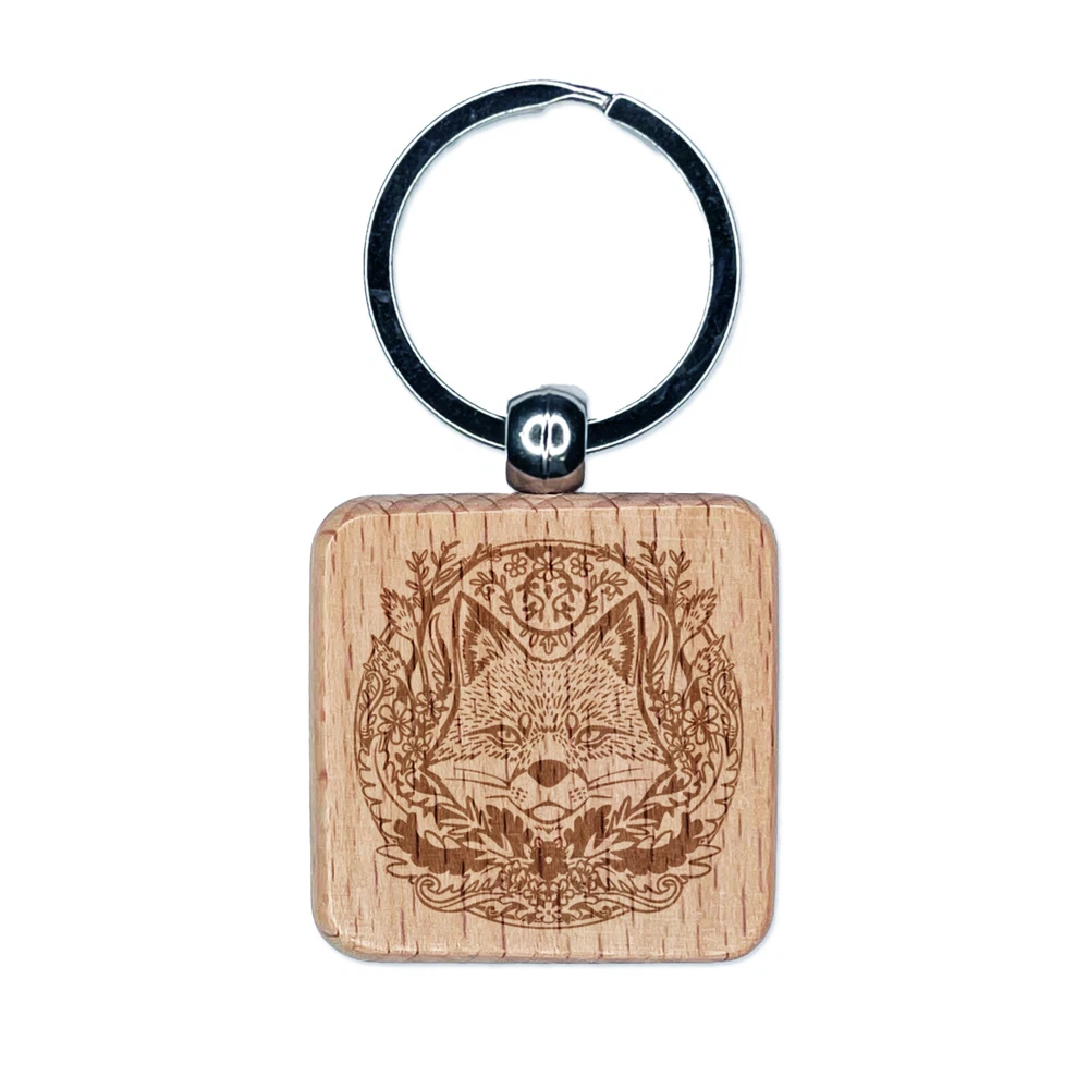 Sly Fox Hiding in Floral Wreath Engraved Wood Square Keychain Tag Charm