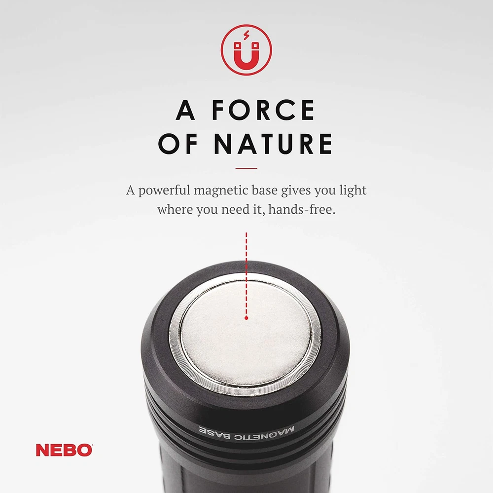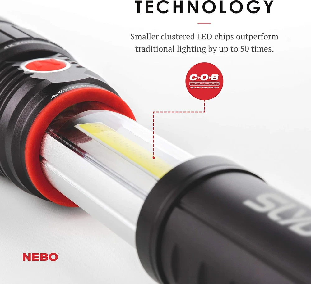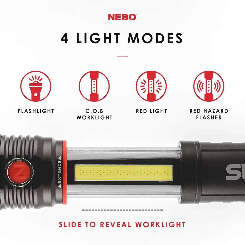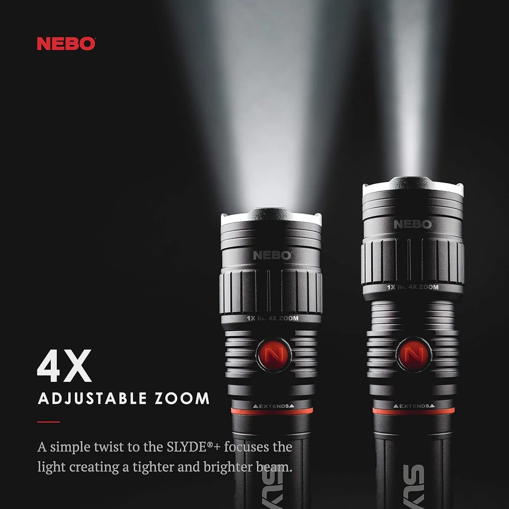 Slyde Rechargeable Flashlight with Work Light | Rechargeable Flashlight 4 Light Modes: The flashlight provides you with 300 lumens that shines for 3 hours out to 135 meters; While the COB LED work light provides you with 200 lumens that shines for 3.5 hours out to 21 meters; the Red light provides you with 35 lumens that shines for 2 hours out to 8 meters; while the Red Flash provides you with 35 lumens that shines for 9 hours out to 8 meters SLYDE Plus Design: The NEBO Slyde+ comes standard with programmable memory power settings for each light mode; it has a new COB red light function, a 4x adjustable zoom and is powered by 4x AAA batteries which are included; We have included a Direct-to-Red feature that is initiated by holding the power button down while simultaneously sliding the flash light open Operation Of The NEBO Slyde +: Slyde+ is operated by a side positioned ON/OFF buton; to dim the light you simply hold down the power button until the light reaches your desired brightness; COB LED work light will automatically turn on when you slide the light open, and will also turn off when you slide the light closed Details Of The Slyde Plus: The NEBO Slyde+ is constructed from anodized aircraft-grade aluminum; it is impact-resistant and IPX4 weather-proof; Slyde+ comes standard with a tactical edge and convex lens on the front and a powerful magnet built in to the base; it is powered by 4x AAA batteries; How many other electronics in your house take AAA batteries, buy the value pack from the big box store power up your other electronics Perfect Gift With Multiple Uses: the NEBO SLYDE+ is the perfect gift for anyone that you know for any type of occasion; it is a great addition to your shop, garage, RV, car, truck, boat, jeep, emergency kit, camping gear, etc.; 300 lumens of bright white light coupled with the option of Red Light and Red Strobe light provide you with options in the event of an emergency situation; you can rest assured that you have the ideal light for any situation that life throws at you 1.77 inches x 6.85 inches x 1.73 inches. Weight: 0.5 lb Light Source Type LED Style SLYDE + 300 Lumen Number of Items 1 Power Source Battery Powered Battery Cell Composition Alkaline Warranty Description N/a. Package Weight 0.33 Kilograms Product Dimensions 7.25"D x 1.38"W x 1.62"H Material Aluminum Pattern Name Light Number of Batteries 4 AAA batteries required. (included) Item Package Dimensions L x W x H 6.85 x 1.77 x 1.73 inches White Brightness 300 Lumens Brightness 300 Lumen Water Resistance Level Water Resistant Item Weight 0.5 Pounds Special Feature Adjustable,Led Part Number 6525 Item Dimensions LxWxH 8 x 10 x 6 inches Color Red Recommended Uses For Product camping, shop, garage, RV, car, truck, boat, jeep, emergency situations, outdoor activities Included Components 6525 300 Lumen LED Flashlight Worklight Dual Light Model Year 2018