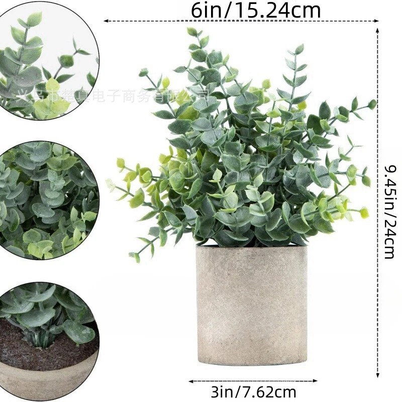 D esc ript ion : 【Small Fake Plants】 Safe and durable material, the eucalyptus leaves of fake plants are made of environmentally friendly plastic.Vivid colors and realistic leaves making these fake plants more life-like and look natural.After receiving the fake plants, it is necessary to adjust the branches and trunks of the simulation plants to a perfect angle to achieve a perfect appearance. 【Natural Look】 The eucalyptus fake plants are made of plastic,comes with gray paper pulp pots.No daily care needed, the potted eucalyptus plant is easy to maintain, always remain green and fresh.It's very classic looking,suitable for those who like plants but have no time to take care.esh.Suitable for those who like plants but have no time to take care. 【Multiple Decor】 Small fake plants can be placed on tabletop, window, office desk, shelf ,farmhouse,bathroom and dining table. They easily match everywhere of your home.We have perfect after-sales service. If you have any questions about the items you received, please contact us for return or refund. Thank you. 【Dimension】 The hole artificial plants measure 9.45" tall and 6" wide,pots measure 3" tall and 3" diameter .The package includes 2 packs, you can place them anywhere as you like.Note:Those artificial plants are made of paper pulp, please don't put it in water. 【Simple Relaxation】 Potted artificial plants for those who wanna enjoy the overflowing of greenery in their daily life but have a busy schedule, our eucalyptus artificial plants are a good choice since it needs no trimming or watering. The artificial plants come already set in their own paper pulp pot for easy displaying. CONT ACT US : If you have any comments or questions about merchandise, please contact us by sending us a message. We will hold orders for as long as you need. We respond to all emails within 12 hours.