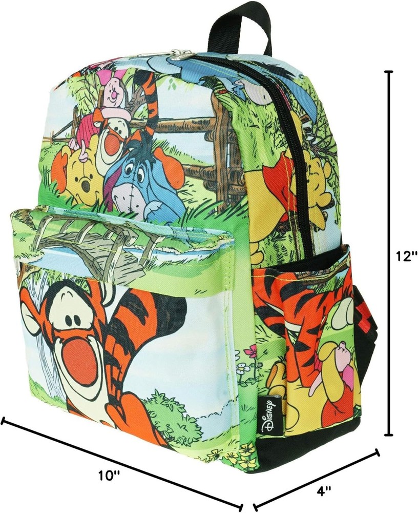 Durable 600-denier polyester exterior with full nylon interior lining Secondary front zipper pocket, Two side pockets Front organizer pocket for addition storage Adjustable shoulder straps, Fully padded back panel Backpack Measures: 12"H x 10"W x 4"D Official Licensed Product/ Manufacturer Minimum Age 3 years and older