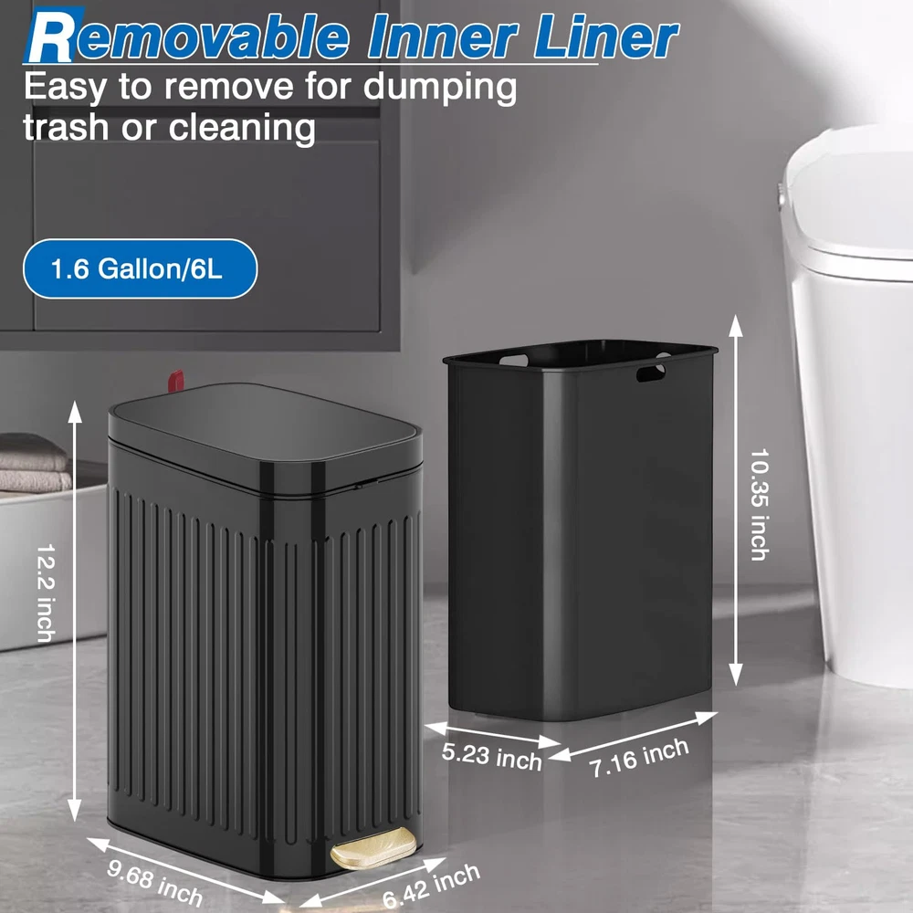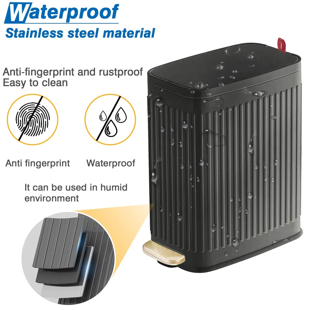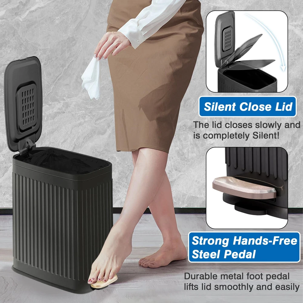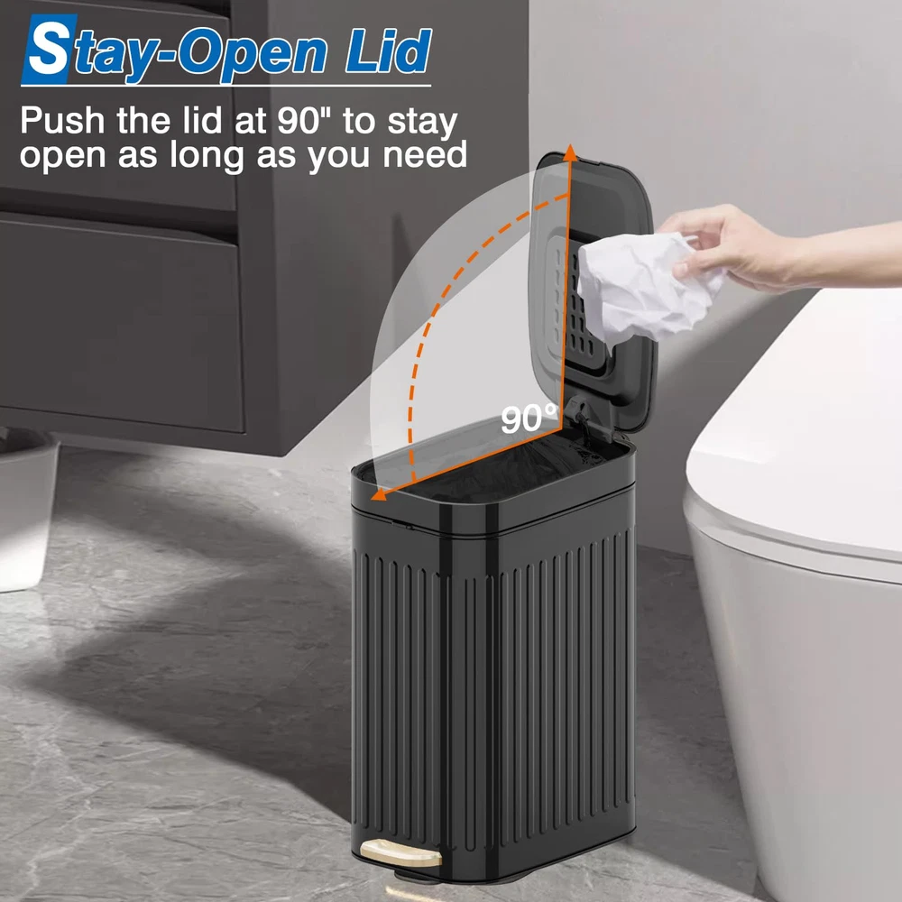 Embossed Metal Surface - Crafted from thick, premium stainless steel, this small bathroom trash can features a truly embossed stripe design that exudes a vintage and elegant charm. Every time you step into your bathroom or kitchen, it's an eye-catcher. Plus, are there accidental stains? Just a gentle swipe of a wet cloth, leaving it looking brand new. No-Hands Pedal- No more touching trash cans with your hands! Our ergonomic pedal ensures durability and comfort. We put the Pedal test of these garbage bins through over 7000 times during the upgrade, and they passed with flying colors, boasting impressive non-slip, and comfortable performance. Odor Worries, Be Gone! - Fed up with unpleasant odors wafting from your kitchen trash can? Say hello to our odorless trash can with a lid and aroma . The odor control trash can with lid expertly seals in odors, while the aroma work wonders to neutralize those pesky trash smells. We include 10 scent pads for you, with 2 to be used at a time. Keep your living space fresh and clean! Effortless Operation - Embrace a trash can experience like no other. With a gentle press of the pedal, the lid opens and closes with a whisper, just as quiet as turning in a book. All thanks to our awesome Descent Control Device. What's more, you can push the lid to 90° to keep it wide open for as long as you need. Sleek Rectangular Shape - It's as slender as it gets, the slim trash can measuring 6.4 inches in width. Perfect for those tight spaces between your toilet and cabinet. This small garbage can measures 9.68 x 6.4 x 12.2 inches (L x W x H), the Ideal device for any corner or cranny in your bathroom, bedroom, and more! Say Goodbye to Bag Struggles - Our bathroom trash can boasts a removable inner bucket that streamlines disposal. It even features a retainer hole to securely hold your trash bag and discreetly hide away extra liners. Experience a cleaner, more convenient way to manage your trash.
