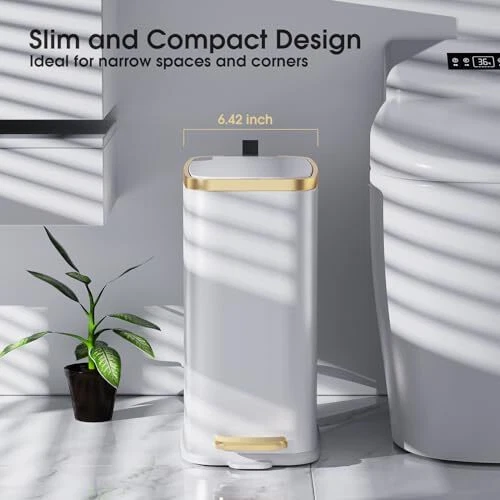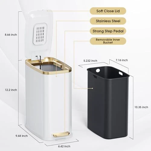 30 Days Return Policy Fast Delivery Trusted seller Small Bathroom Trash Can with Lid Soft Close-5L/1.3 Gal Slim Garbage Can-Metal Step Wastebasket-Rectangle Narrow Waste Bin for Office, Bedroom, Toilet, Live Room-White Product Description Silent Soft Close & Stay Open Lid: The Stainless steel trash can is made with a stay-open Function that Pushes the lid at 90° to stay open; The lid has a damper arrangement that retards the close of allows the lid to close quietly and safely by itself every time Slim Design: The small rectangular trash can is easily fitting into Narrow spaces and Bathroom corners with its slender profile; such as bathroom, bedroom, office, toilet, kids room, powder room, farmhouse, apartments, campers, RVs, dorm rooms, etc Removable Inner Bucket: The step trash can has a durable plastic liner bucket that can be easily lifted out for easy dumping of trash and rinsing quickly when needed; T is a carry handle on the back of the slim trash can to move it easier Durable Pedal & Non-Slip Bottom: This small metal trash can has a metal pedal that is anti-rust, durable, and Ergonomically designed to open with minimal force; The step design means you can operate it hands-free Deodorizing Function: The included odor filter absorbs trash odors, 360° sealed space prevents odors from escaping from the can, leaving your space smelling fresh and clean High-Quality Material: The body of this garbage can is made of Stainless Steel, thick and durable, and anti-fingerprint; The inner barrel is made of pp material, and the inner barrel is equipped with a garbage bag fixing ring to prevent the garbage bag from falling Excellent Customer Service: If you received a small trash can that is dented, broken, or the wrong color, please feel free to contact us and we will answer within 24 hours, your satisfaction is the encouragement of us to chase high-quality products Shipping Returns Payment Shipping Shipping is FREE to all addresses other than APO/PO boxes in the lower 48 states. All our stock ships from US-based warehouses. Shipped via USPS or UPS (depending on location and package weight) Unless stated otherwise, all orders will ship within 24-72 hours of your payment being processed. Check our feedback to see the great reviews of FAST shipping we offer. Returns As our valued customer, we will do our best to make sure the product you receive arrives to you on time and as expected. If you are not satisfied with your purchase, please contact us within 30 days of receiving your order to process a return. Payment We currently accept payment via eBay managed payments only. Once payment is cleared, we will dispatch your shipment within 1-3 business days. Please refer to the "Shipping" tab for more information regarding shipping speed to your destination.
