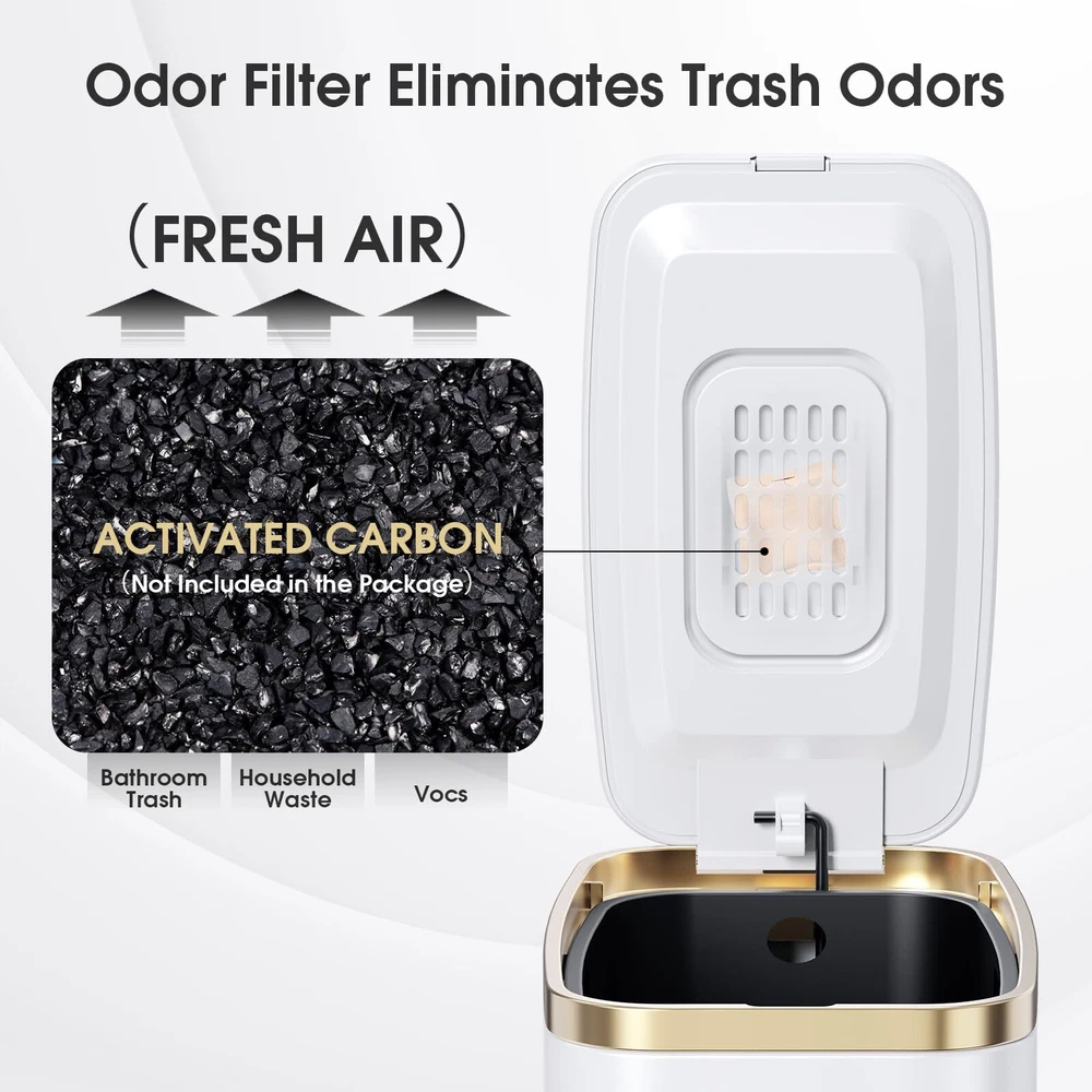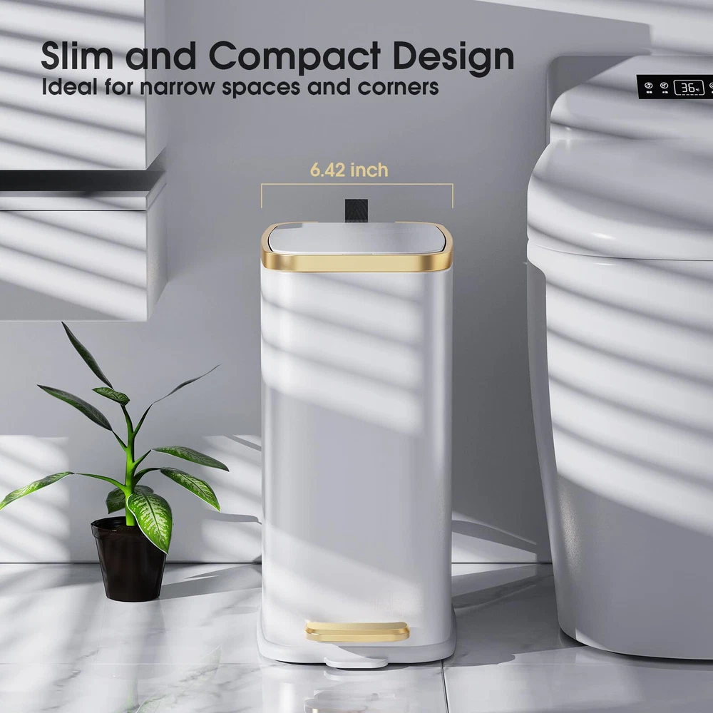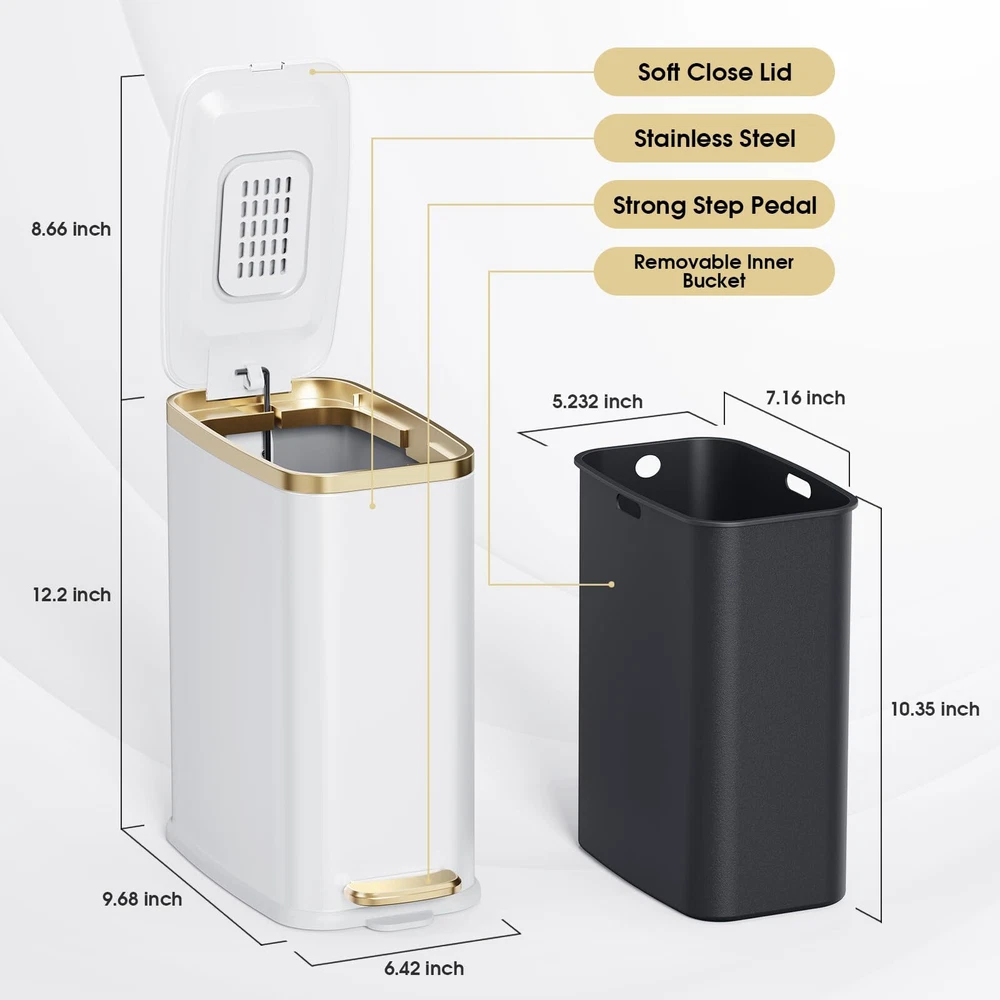 Silent Soft Close & Stay Open Lid: The Stainless steel trash can is made with a stay-open Function that Pushes the lid at 90° to stay open; The lid has a damper arrangement that retards the close of allows the lid to close quietly and safely by itself every time Slim Design: The small rectangular trash can is easily fitting into Narrow spaces and Bathroom corners with its slender profile; such as bathroom, bedroom, office, toilet, kids room, powder room, farmhouse, apartments, campers, RVs, dorm rooms, etc Removable Inner Bucket: The step trash can has a durable plastic liner bucket that can be easily lifted out for easy dumping of trash and rinsing quickly when needed; There is a carry handle on the back of the slim trash can to move it easier Durable Pedal & Non-Slip Bottom: This small metal trash can has a metal pedal that is anti-rust, durable, and Ergonomically designed to open with minimal force; The step design means you can operate it hands-free Deodorizing Function: The included odor filter absorbs trash odors, 360° sealed space prevents odors from escaping from the can, leaving your space smelling fresh and clean High-Quality Material: The body of this garbage can is made of Stainless Steel, thick and durable, and anti-fingerprint; The inner barrel is made of pp material, and the inner barrel is equipped with a garbage bag fixing ring to prevent the garbage bag from falling Excellent Customer Service: If you received a small trash can that is dented, broken, or the wrong color, please feel free to contact us and we will answer within 24 hours, your satisfaction is the encouragement of us to chase high-quality products