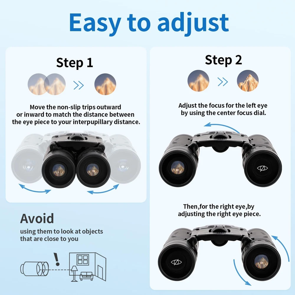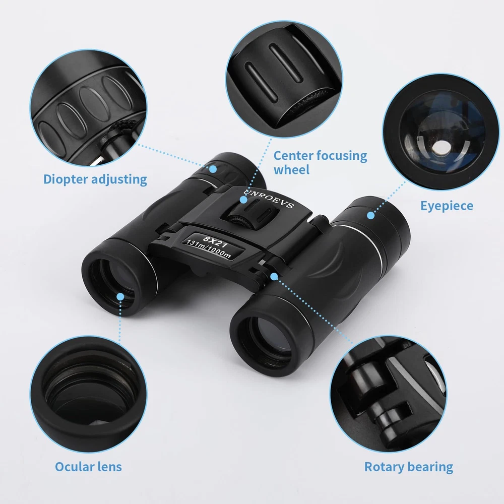 Compact Lightweight Binoculars:You won’t hesitate to take this small,lightweight,foldable binoculars into your backpack when every outdoor activities. Small Binoculars with Clear Vision:Designed with real 8x magnification and a 21mm objective lens. Esily to Focus:Just adjust by Smooth "center-focus knob" and right eye lens. The folding binoculars suitable for both adults and binoculars. Pocket Binoculars with BAK4 prism:Enjoy your great outdoors with a bright and wide image. Pull the Bond of Parent-Relationship:Bring cute and this pocket binoculars to explore the wonderful world.