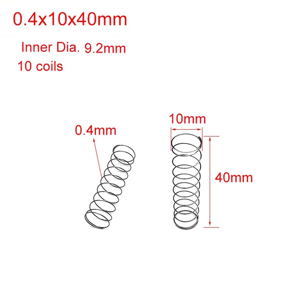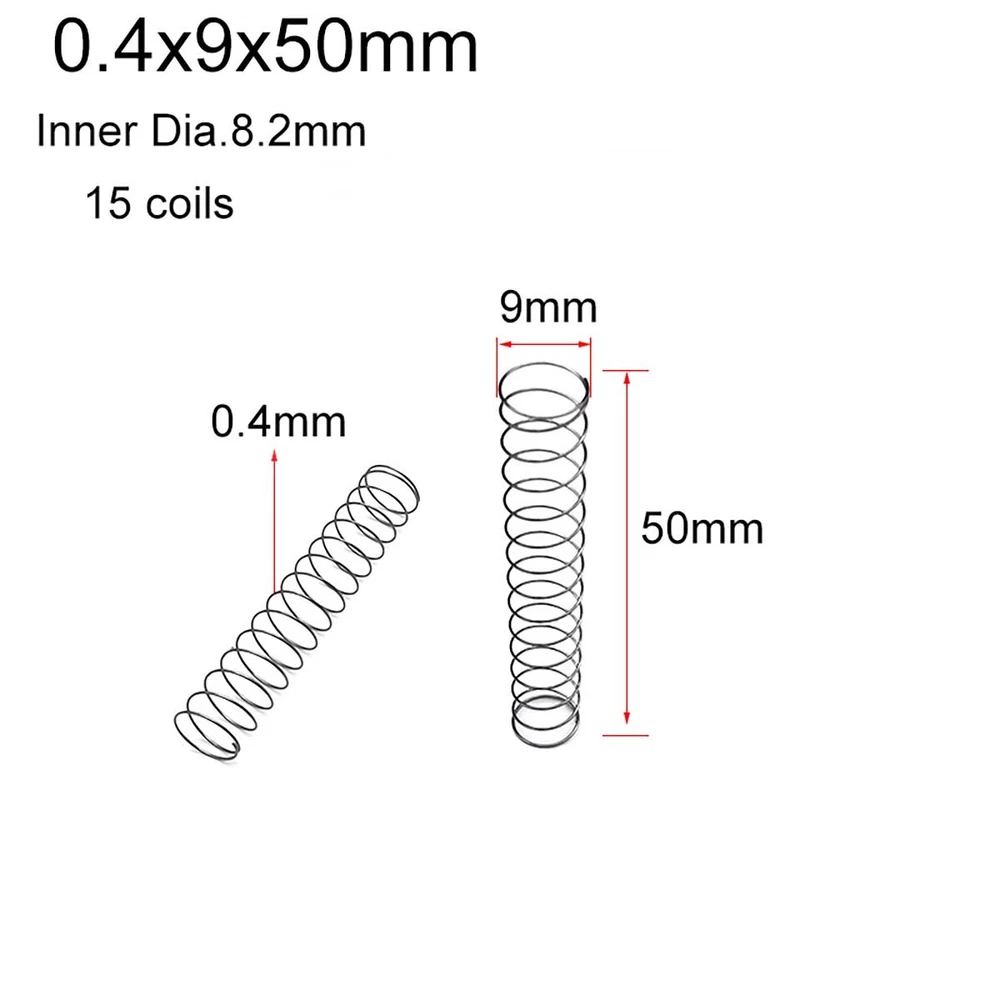 Description Material: 65Mn Spring Steel Size: Wire diameter*Out Diameter*Length Internal Diameter =Out Diameter - 2 * Wire Diameter ( For example ,Size 0.5*9*40mm,means the wire diameter is 0.5mm,the out diameter is 9mm,the length is 40mm, the inner diameter is 8mm.) Package including: According to your choice.
