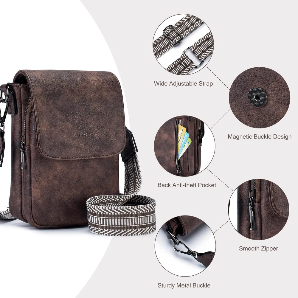 [Soft leather Phone Purse] Small crossbody bags for women is selected soft vegan leather,feels soft to the touch. With simplistic body, sliver hardware, and front double zipped compartments make this bag practical and functional.This small purse with smooth zipper, no need to worry about getting stuck, keep your phone and items safe.This stylish phone purse is great to carry with you everywhere you go. [Phone Pouch & Wallet in One] Exterior] 1 Front Phone Pockets with magnetic closure( fits up to 6.7" phone);1 Zippered Back Pocket for cards or coins; Interior - 2 Main Compartment for cash, cards, tickets, passport or another small item; 4 RFID Credit card slots ; Small but also roomy space to hold daily essential. [Compact Size] Size:5.51"(L) x 2.36"(W) x 7.08"(H); Cell phone purse small size is ideal size to fit the smart mobile phones with a big screen of 6.7 inch and below. Come with unique adjustable & removable guitar strap; Adjustable shoulder strap length (32" to 51"). Lightweight & Wide Strap aim to the comfortable to carry in each day. Small crossbody bag ideal option for outdoor use (walking,camping,shopping etc) and travel,daily life use as well. [Upgraded-Version Phone Purse] Cell phone purse With a flat front magnetic snap phone space,design for keep phone in right place salely & convenient access your phone when in outside .Interior size could better fit most cell phones (With Slim Case) Not larger than 6.7 inches. The back has a vertical anti-theft zipper pocket for items you want to keep out of sight and protected. [Ideal Choice] Small crossbody purse ideal option for outdoor use (walking,camping,shopping etc) and travel,daily life use as well.Crossbody phone bag is a fashionable,practical and multi-function design and comfortable to wear. Cell phone purse crossbody also a best idea as a small birthdays, holidays present for women.