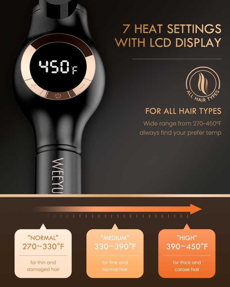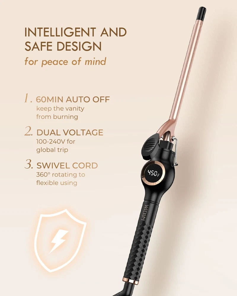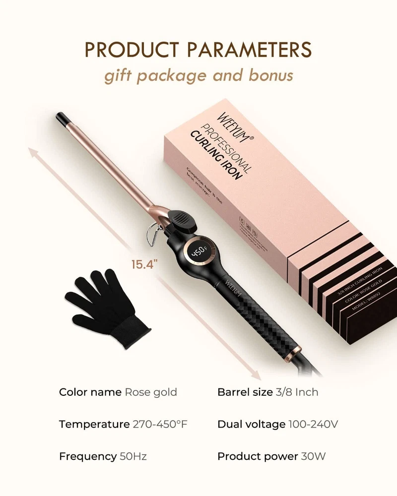 Small Curling Iron 3/8 Inch Barrel, Tiny Curling Wand for Short Hair, 9mm Thin Curling Iron Ceramic Tourmaline CREATE PERFECT CURLS: The 3/8 inch curling iron easily creates retro ringlet small curls, effectively adding volume to hair, make it soft and natural, as if it were a salon-like professional effect. REDUCE HAIR DAMAGE: Enhanced ceramic dual PTC heating to reduce 60% hair damage. It provides uniform heat to hair, more suitable for thin fine hair without causing heat damage. ULTRA FAST HEAT-UP: Using the powerful fast heating technology, the curling iron can reach 270℉ in just 30 seconds for fast styling, which will be the best blessing When you’re in a rush in the mornings. 7 TEMPERATURE SETTINGS& LCD DISPLAY: professional curling iron boasts the widest range of temperature settings from 270℉ to 450℉. Whatever thin fine hair or thick coarse hair, it will give you full control over your styling results. AUTO SHUT-OFF& DUAL VOLTAGE: The iron has 60 minutes auto shutdown, never worred about overheating. 100-240V dual voltage for globle travel . The rotating cord, secure clamp, and extra-long barrel are all features that make curling fine hair a breeze!