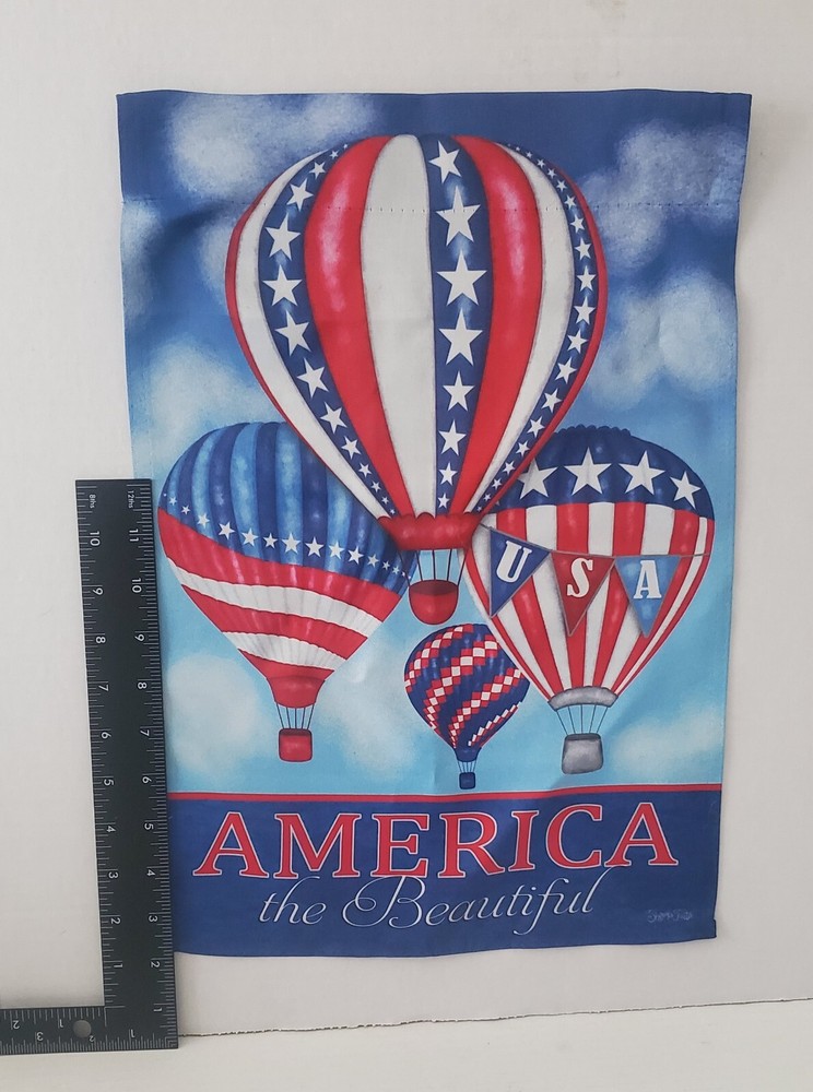 This small, patriotic flag shows multiple red white & blue hot air balloons & states "America the Beautiful" at the bottom making it perfect for celebrating the Fourth of July & Memorial Day. Made from 100% polyester, it features a design that is visible from both sides, so it's a versatile and festive decoration for your yard, window, office door or really any space.