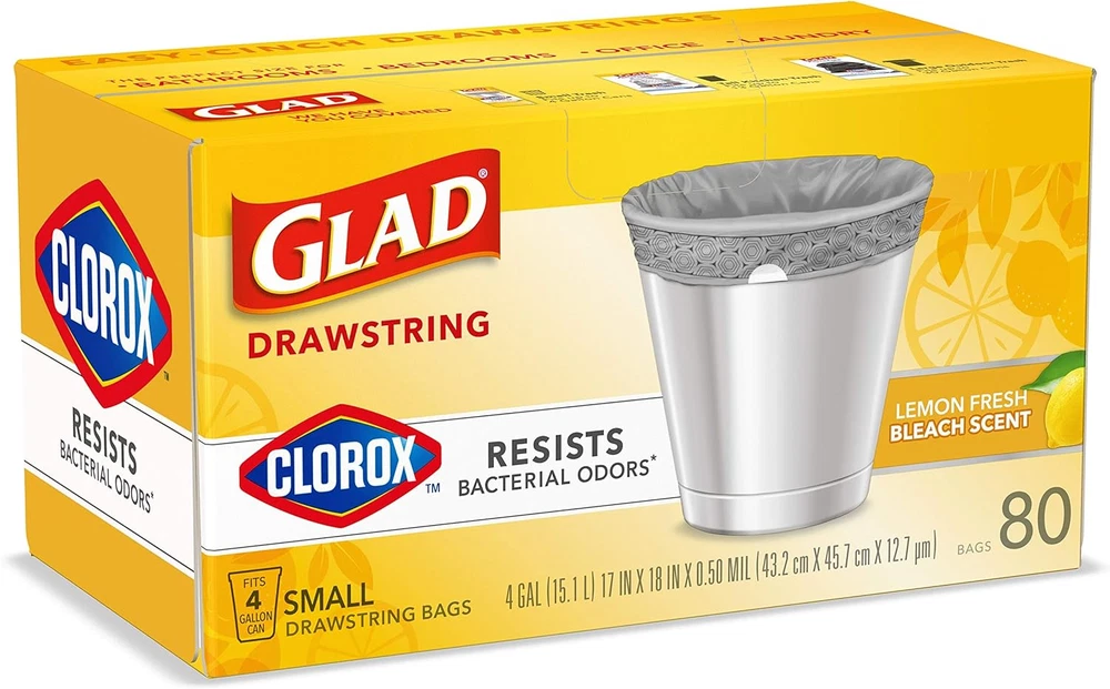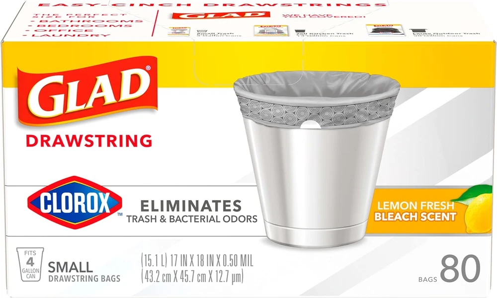 ELIMINATES TRASH AND BACTERIAL ODORS: Glad with Clorox helps you take control of odors by eliminating trash and bacterial odors on the garbage bag; packaging may vary EASY-CINCH DRAWSTRING: Handle all your daily household demands with small trash bags that tie with a quick cinch of the drawstring for easy trash removal CLEAN-SMELLING SCENT: These small drawstring trash bags feature a Lemon Fresh Bleach scent that gently freshens your home with just a hint of sparkling clean scent 4 GALLON GREY SMALL TRASH BAGS: Glad wastebasket liners are great for small garbage cans, general household needs and just the right size for cars and on-the-go messes CLEANING MADE EASY: Glad with Clorox garbage bags work as hard as you do to help maintain a clean and healthy feeling home with a versatile design for bins around the home Glad and Clorox have joined forces to create a trash bag with the strength of Glad and the odor-fighting power of Clorox. Glad with Clorox Small Drawstring Trash Bags eliminates trash and bacterial odors on the bag to help keep your home feeling fresh and healthy. These 4 gallon garbage bags fit small size trash cans and are ideal for bathrooms, bedrooms, offices, nurseries and laundry rooms. Featuring a grey bag and printed hexagon design on the hem of the bag, these trash bags add a design detail to any room when they are folded around the edge of the can. Just a quick cinch of the durable drawstring makes trash removal simple. These versatile trash bags feature the clean smell of Lemon Fresh Bleach Scent. Glad with Clorox garbage bags work as hard as you do to help maintain a fresh and healthy feeling home with a versatile design for bins around the home. Glad 4gal bags are comparable to Simplehuman A, B, C, or R trash bags*. *Simplehuman is a trademark of Simplehuman, LLC. Glad is not sponsored by or affiliated with Simplehuman.
