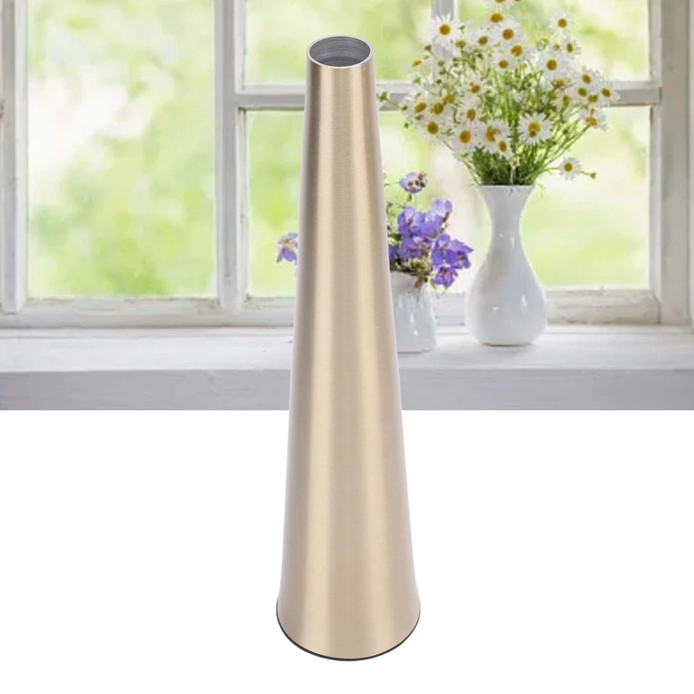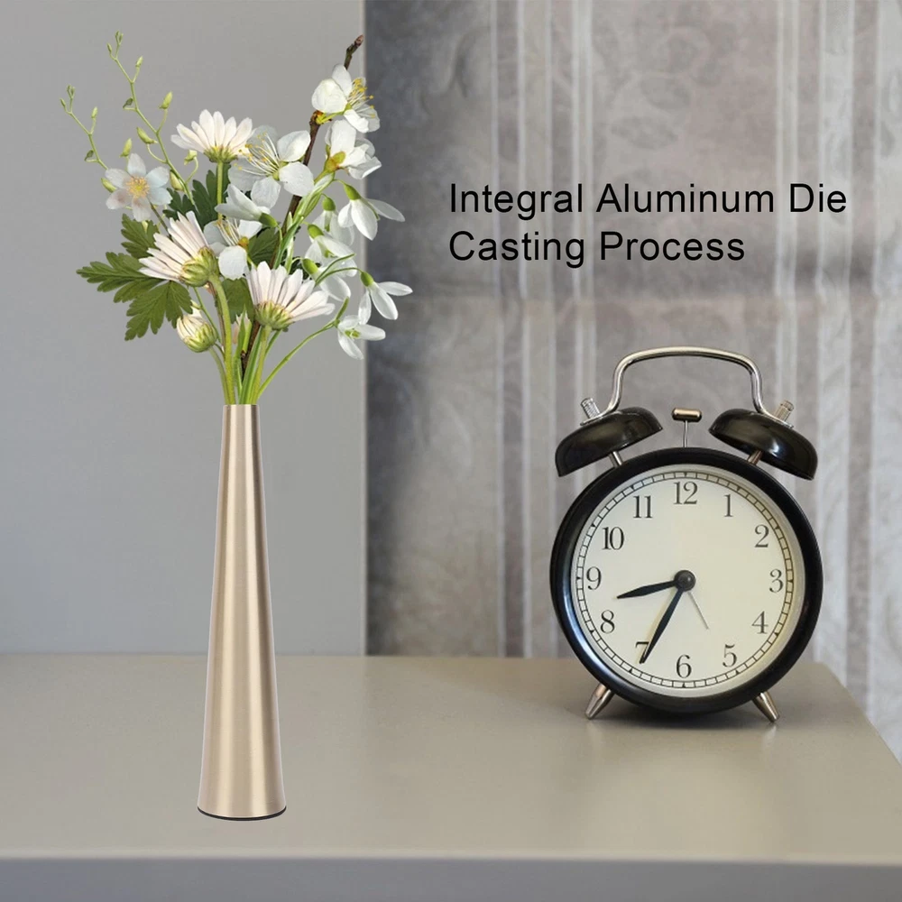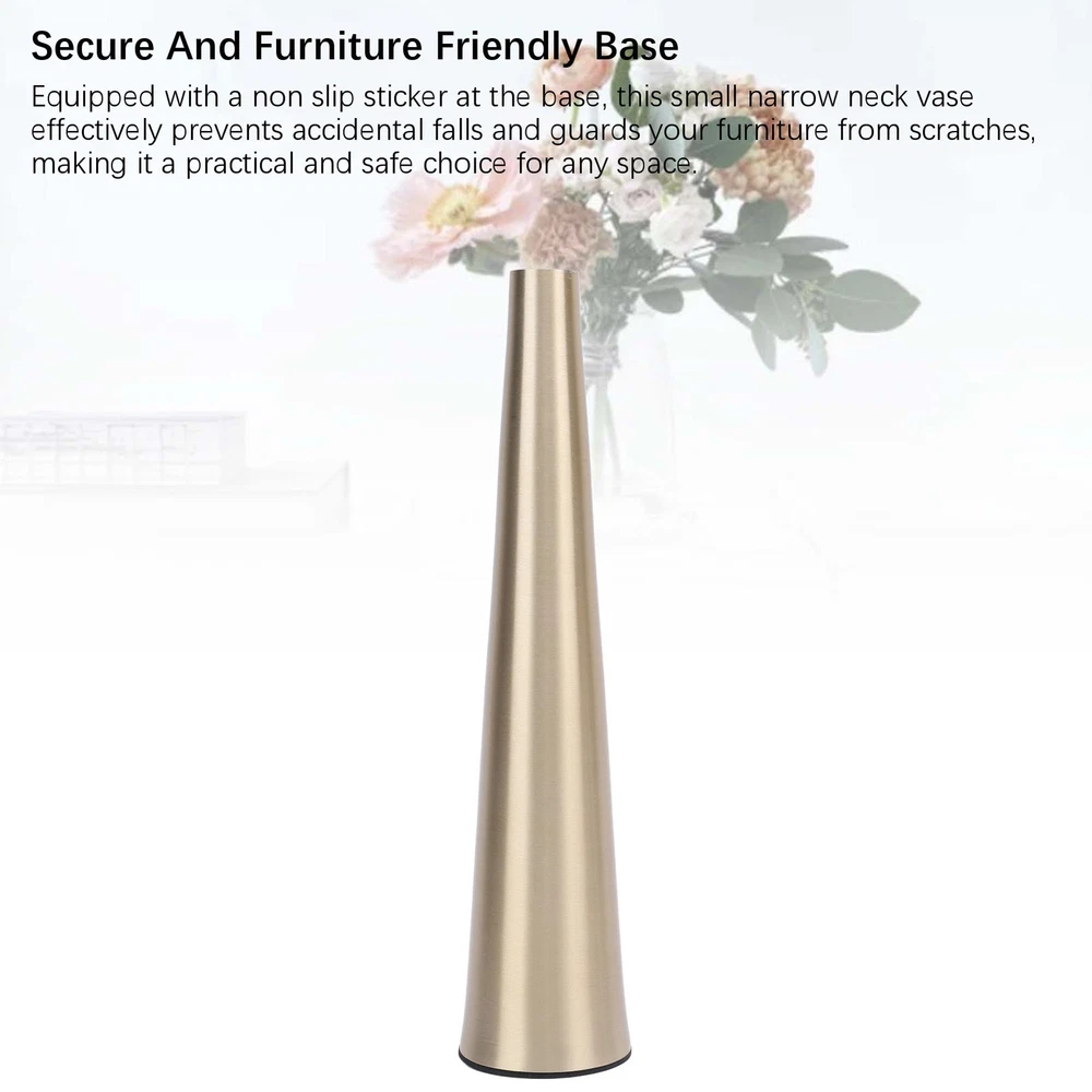 Feature: 1. Rugged And Textured Design: Crafted from excellent aluminum material, this decorative floral vase features a brushed finish, adding texture and elegance. It is built to last, ensuring that it remains a centerpiece for years to come. 2. Secure And Furniture Friendly Base: Equipped with a non slip sticker at the base, this small narrow neck vase effectively prevents accidental falls and guards your furniture from scratches, making it a practical and safe choice for any space. 3. Versatile Decor: Suitable for farmhouse or office decor, fireplace displays, and home decoration for living room and kitchen countertops. It is suitable for weddings, birthdays, events, and can be given as a gift to Xmas, anniversaries, or housewarmings. 4. Multifunctional: Showcase your individual style with this minimalist small flower vase by filling it with various plants, freshing flowers, artificial florals, or greenery, creating a refined and rustic, yet elegant and aesthetically pleasing environment in your home. 5. Compact And Elegant Cylinder Design: This small cylindrical container is suitable for both home and office decor. Its golden finish beautifully complements a variety of plants, while the tapered metal vase design includes a non slip pad to prevent slipping and guard the finish it rests on. Specification: Item Type: Small Flower Vase Material: Aluminum Size: Mouth Diameter: Approx. 2.2cm / 0.9in Base Diameter: Approx. 5cm / 2in Package List: 1 x Vase