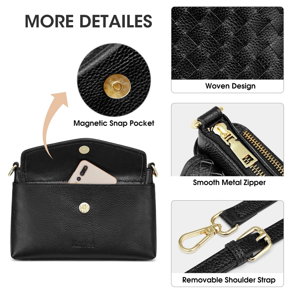 Soft Top Grain Pebbled Cowhide Leather: Our small Crossbody Bag is made from high quality leather. The flap is hand-woven and looks more fashionable. Made with high-quality gold hardware, smooth zipper, durable, stain-resistant and fade-resistant Perfect Size: 25*6*15cm/ 10*2.5*6inch (L*W*H). Weight: 0.93 lbs. Fits up to 6.9” phone. Comes with a detachable shoulder strap that can be adjusted from 90.2-113.5cm/35.5-44.7" Versatile Use: This leather purse has 5 pockets. Features 1 main pocket, 1 inner slip pocket, 1 inner zip pocket, 1 outer flap pocket, 1 outer RFID pocket. Converts seamlessly between clutch and crossbody bag, making it a great choice for any occasion Best Designer Gifts: Roomy and comfortable Wallet Purse is a nice gift on Thanksgiving Day, Christmas Day, New Year, Birthday, Valentine's Day, Mother's Day, or any other holidays or anniversaries AFTER-SALES SERVICE: Any questions or are not satisfied with our services or products, please get in touch with us via email, we will provide you with satisfactory service