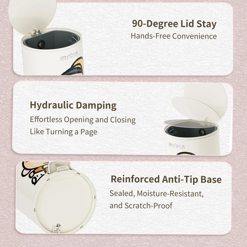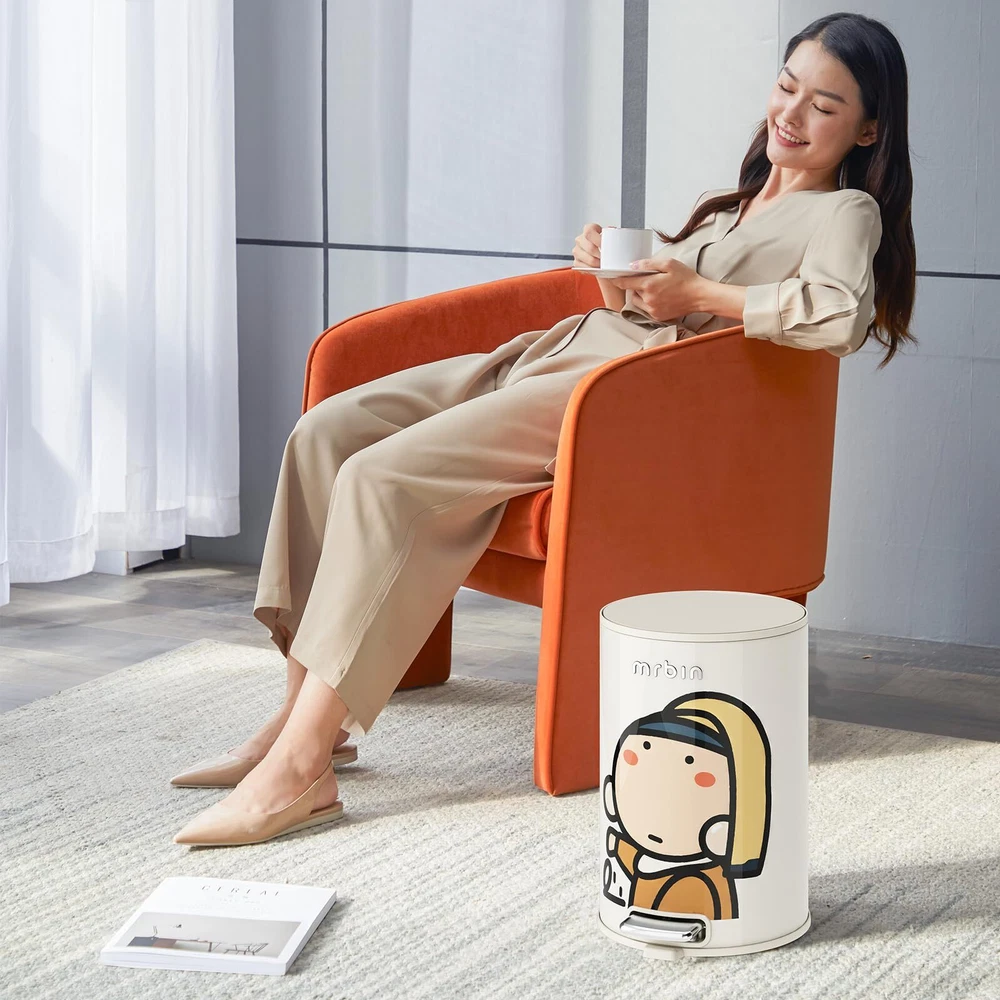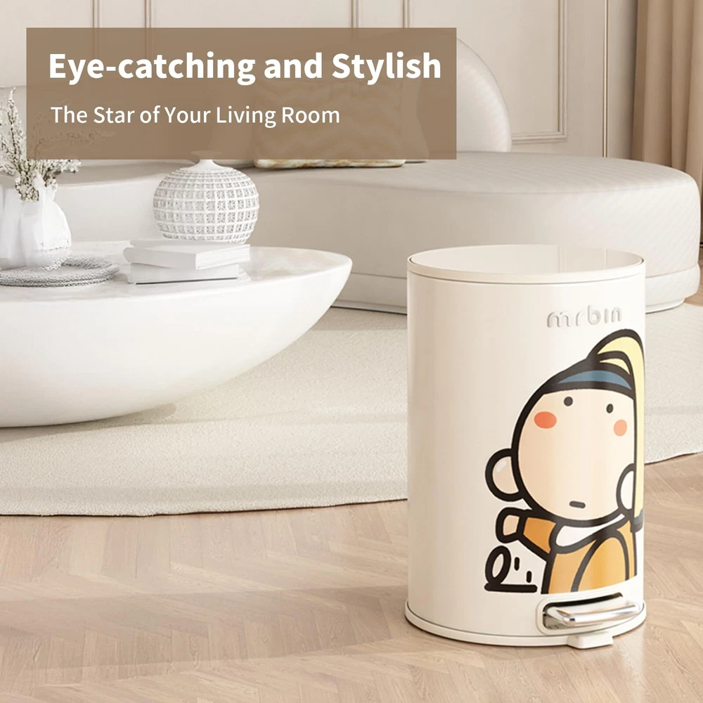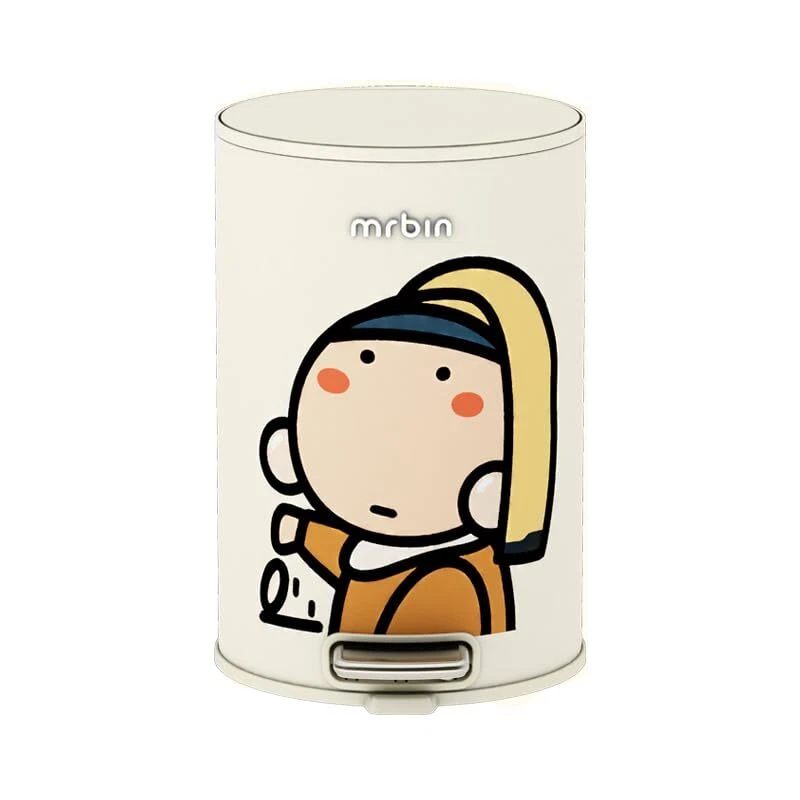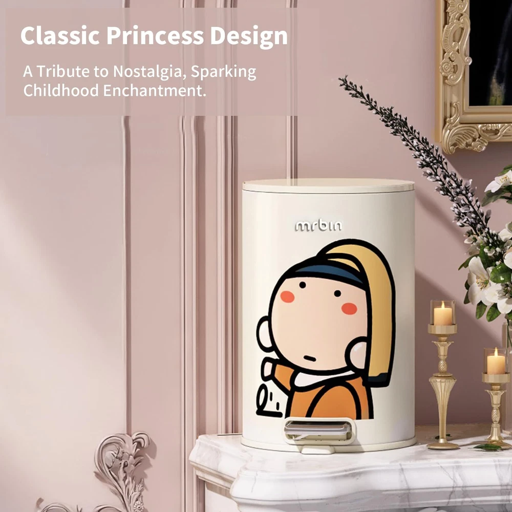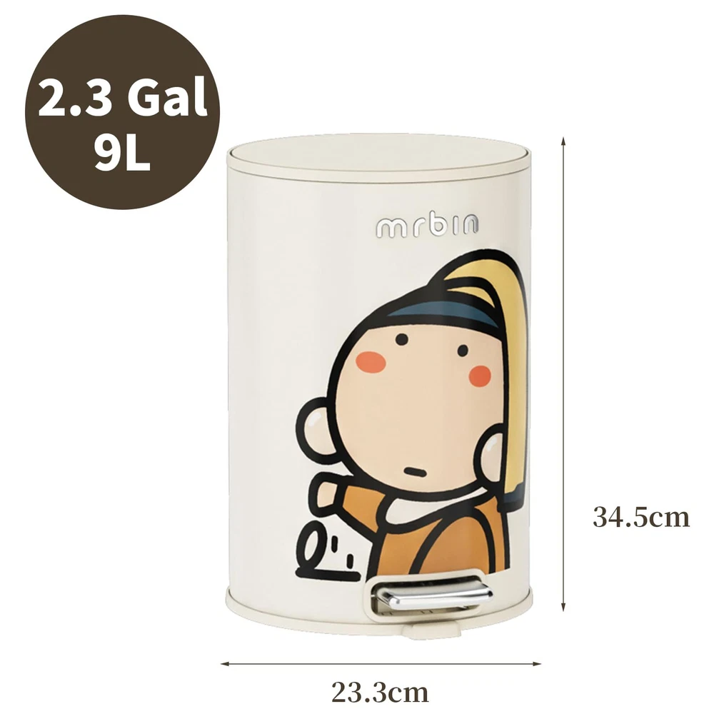 Elegant Art-Inspired Decor Accessory: Infuse your home with artistic flair and sophistication with this decorative trash can featuring the iconic "Girl with a Pearl Earring". It's not just a container for waste but a statement piece that elevates the aesthetics of any room, from the living room to the vanity, reflecting your taste in fine art and home decor. Moisture-Proof Durability: A wastebasket fortified with a thickened metal construction, offering a durable and rust-resistant solution for your bath or toilet, delivering reliable performance for long-term use. Silent Covered Disposal: Enjoy the tranquility with our covered trash can, designed with a quiet closure system that offers low-noise, slow lid descent, ensuring a peaceful environment. Premium Plastic Inner Bucket: This waste container boasts a removable premium plastic inner bin with a built-in handle for easy cleaning and disposal. The integrated bag retention ring keeps trash bags tidy and concealed, ensuring your can remains clean and presentable. Portable Compact Design: Equipped with a convenient rear handle for easy movement, this 2.4 gallons capacity waste container, with its compact dimensions of 9.2*9.2*13.58 inches, serves as an ideal accessory for restroom essentials and a practical office trash can for placement near desks.