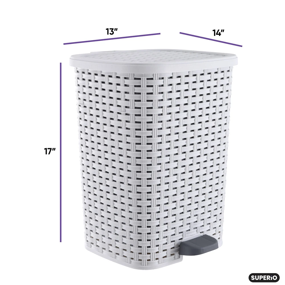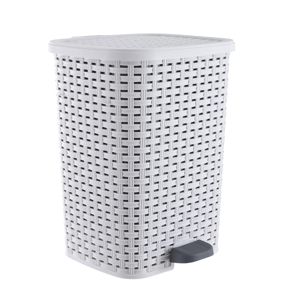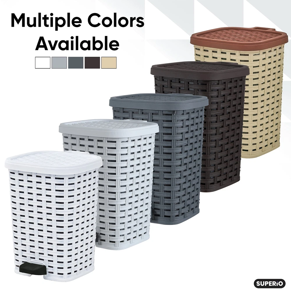 Give your office, bathroom or kitchen a new stylish look with this basket-weave designed compact trash can. Comes with a strong foot-pedal that opens it easy with a step of your foot. It is made with a separate interior can which smoothly slides out for easy wash and use. It's also available in smaller sizes. Decorative and functional - Step up to a step-on trash can that's both functional and decorative! This attractive collection of wicker patterned step-on trash cans will give you a fresh new look in your kitchen, bedroom, office, or bathroom. It is also available in other colors.