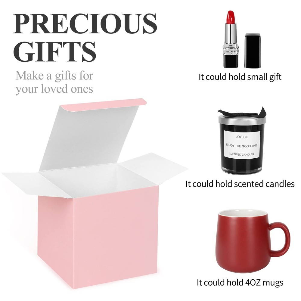 100pcs Wedding Favor Boxes, Paper Gift Boxes 4x4x4 Inches Small Gift Boxes with Ribbons Small Boxes for Gifts, Crafting, Cupcake, Candy, Bridesmaid Proposal Boxes,Easy Assemble Boxes Application: Imagining that what a romantic and elegant wedding gift when you present to your guest with this favor box. Perfect for wedding/ baby shower/ birthday/ kids party/ bridal shower/ christmas /garden party and holiday celebrations or other special event decorations etc. Specifications: Size: 4 x 4 x 4inch (L x W x H) Material: High Quality Oily Kraft Boxes Package including: 100 x Pink favor boxes 100 x Pink ribbons 100 x Thank you stickers Easy to DIY and personalize your gift ,decorate your treat presentation, a pretty displaying box for desserts, and take-out package from wedding or celebrations. Size:Wedding gift boxes :4"x 4"x 4" ,cube shape ,prefect size for homemade cupcakes ,candies, chocolates, cookies, jewelry, soaps ,and other small gifts. Material:The small boxes are made of high quality oily kraft boxes, ultra thick.and come with free Ribbons for gift bows. assembled easily. These exquisite party favors boxes will make your party memorable. Wide Occasions: Paper boxes are great for wedding/ baby shower/ birthday/ kids party/ bridal shower/ christmas /garden party and holiday celebrations.They also can be use as a cupcake box ,favor boxes ,candy boxes or gold gift boxes. Create your own unique small gift box for your family and Ffriends ,They will remember and cherish forever.Leave a good memory! What You'll Get: 100pcs pink favor boxes,100pcs pink ribbons and 100pcs Thank you stickers. you can tie a bow knot on top, which will be more elegant and romantic for party. Easy to Assemble :They are come in flat and pre-folded,easy to be assembled, and are strong enough to hold small glass jars or cups. The neat box design makes them the ideal solution for awkwardly shaped gift items.