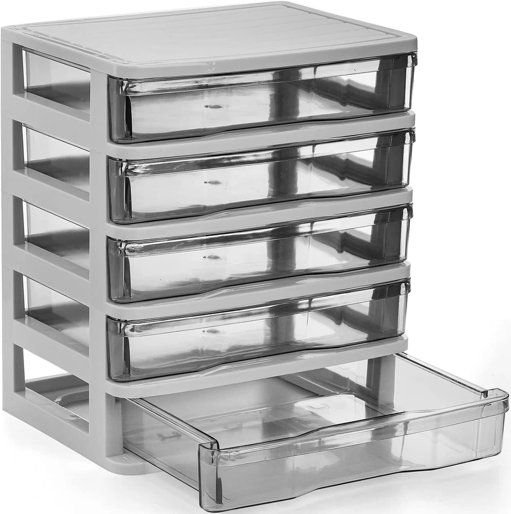 DEAYOU 5 drawer desktop storage bin unit is perfect for storing and organizing a wide range of personal arts, crafts, accessories, papers, documents, vinyl, scissors, pens, stationery and other equipment, making the most of a cluttered space Our clear desktop storage bin with 5 drawers is made of high-quality strong polypropylene plastic, non-toxic and odorless, durable and stain resistant, resilient and well-balanced, safe to use and easy to clean This plastic 5 drawer organizer measures approx. 9.3" L x 7.1" W x 10.3" H, ideal size to store office supplies, cosmetics, jewelries, sewing supplies, hair supplies, nails, screws, bolts and other small items. The simple contemporary design in classic white color also makes it a nice gift to your families and friends Our small storage container features with white frame and clear drawers, allows you to not only keep your items orderly, but find the things you need easily and quickly. The smooth integrated pulling handles offer easy using. And the buckles can effectively prevent drawers falling This mini plastic bin with drawers offers vertical storage that fits under a desktop surface or on the counter in your home or office, helps to reduce clutter and improve work efficiency. The simple modular design makes it suitable for any home decorations Product Description DEAYOU 5 Drawer Desktop Storage Bin Unit, Small Plastic Drawers Organizer White Frame with Clear Drawer, Mini Storage Bin Container Case with Drawers for Desk Our 5 drawer desktop storage bin unit is perfect for storing and organizing a wide range of personal arts, crafts, accessories, papers, documents, vinyl, scissors, pens, stationery and other equipment, making the most of a cluttered space. The simple contemporary design in classic white color also makes it a nice gift to your families and friends Compact Size and Clean View Our plastic 5 drawer organizer has ideal size to store office supplies, cosmetics, jewelries, bolts and other small items. The simple contemporary design also makes it a nice gift to your families and friends. It features with white frame and clear drawers, allows you to not only keep your items orderly, but find the things you need easily and quickly Sturdy Plastic and and Thoughtful Design This clear desktop storage bin with 5 drawers is made of high-quality strong polypropylene plastic, non-toxic and odorless, durable and stain resistant, resilient and well-balanced, safe to use and easy to clean. The smooth integrated pulling handles offer easy using. And the buckles can effectively prevent drawers falling Versatile and Space-Saving Our 5 drawer desktop storage bin unit is perfect for storing and organizing a wide range of personal arts, crafts, accessories, vinyl, scissors, stationery and other equipment, making the most of a cluttered space. It offers vertical storage that fits under a desktop surface or on the counter in your home or office, helps to reduce clutter and improve work efficiency