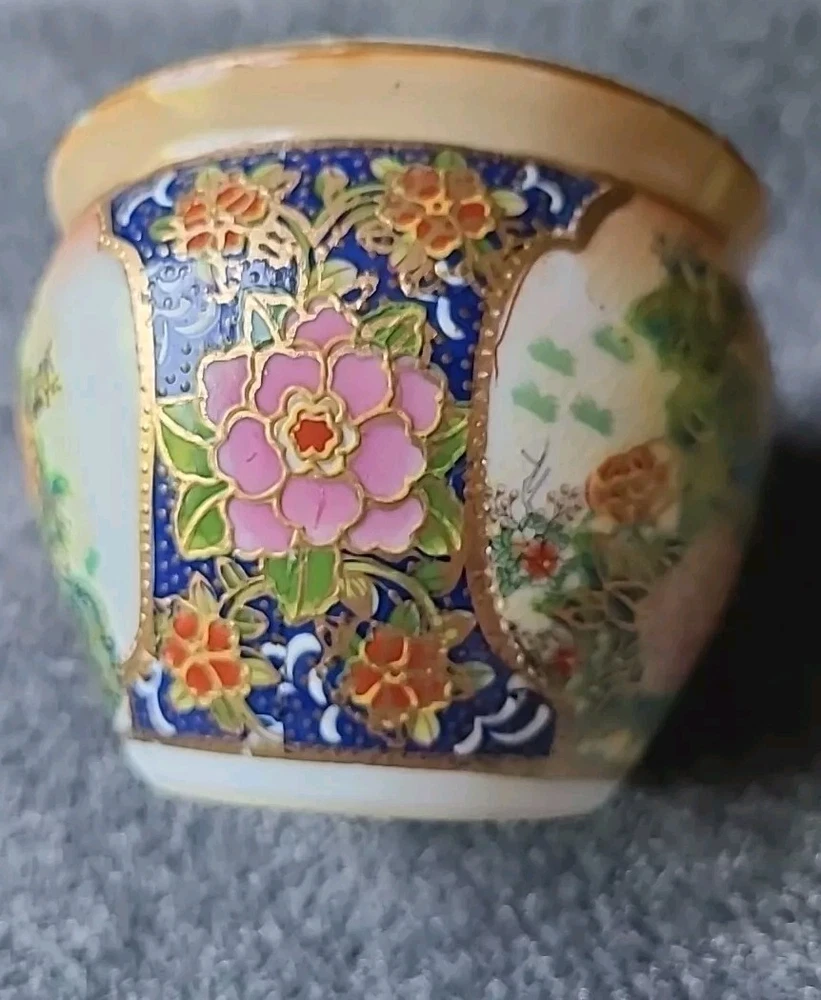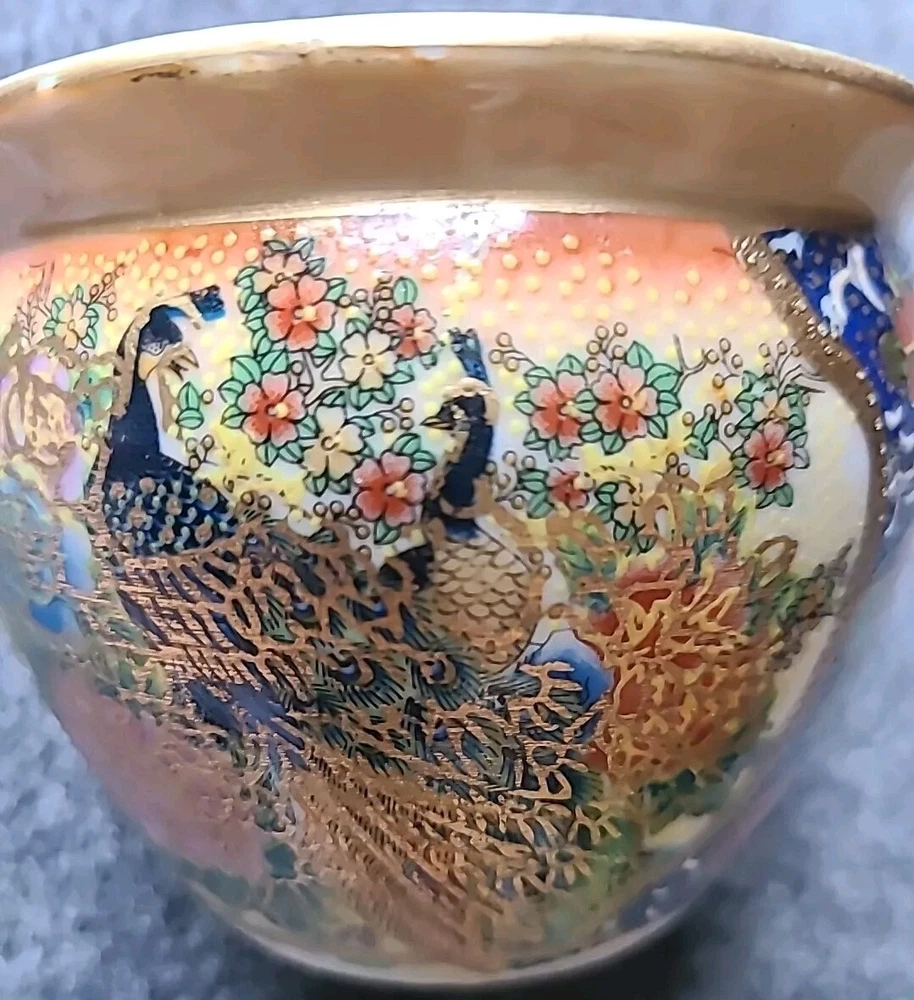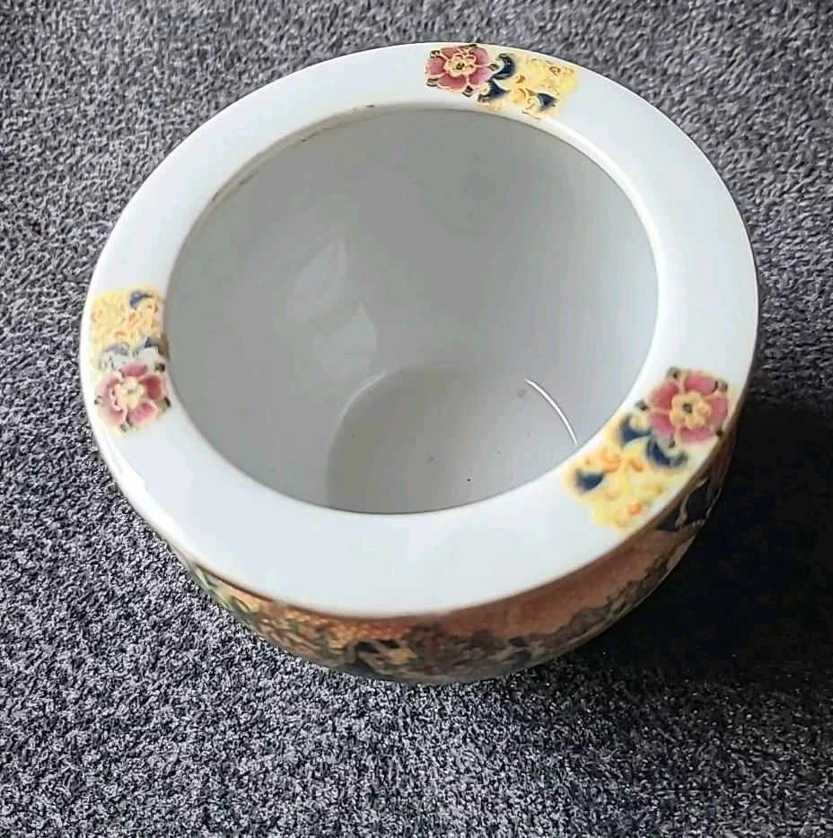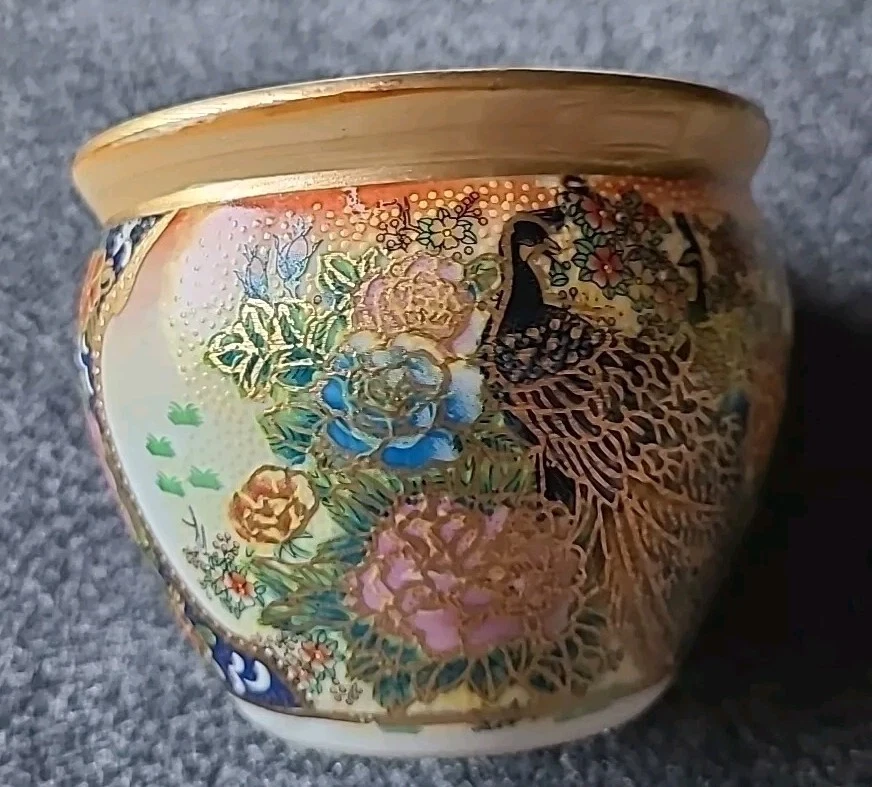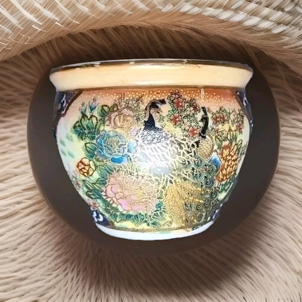 This small pot/vase features a peacock and nature scene design in multi-color porcelain. It is inspired by vintage Oriental aesthetics, with gold-like accents. The height is 3.5 inches, originating from China. The theme includes peacocks and flowers. The specific Chinese dynasty and age are unknown, as well as the maker of the item.