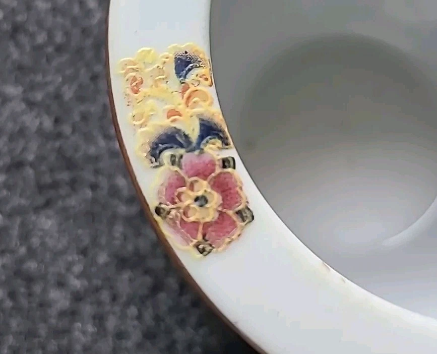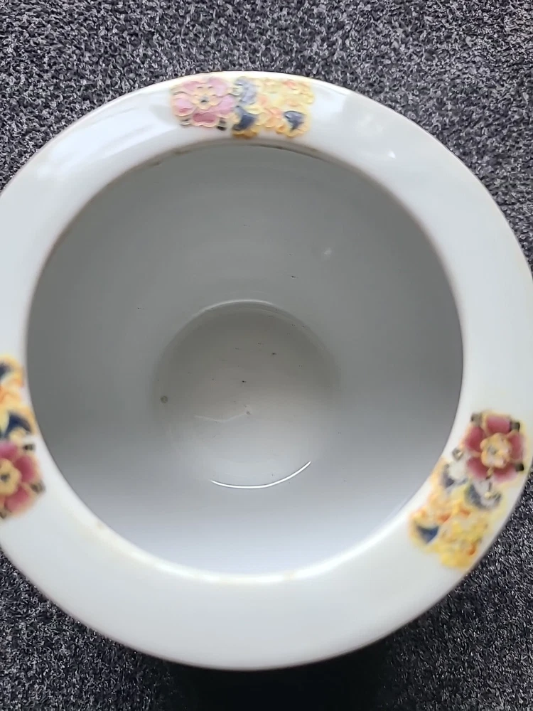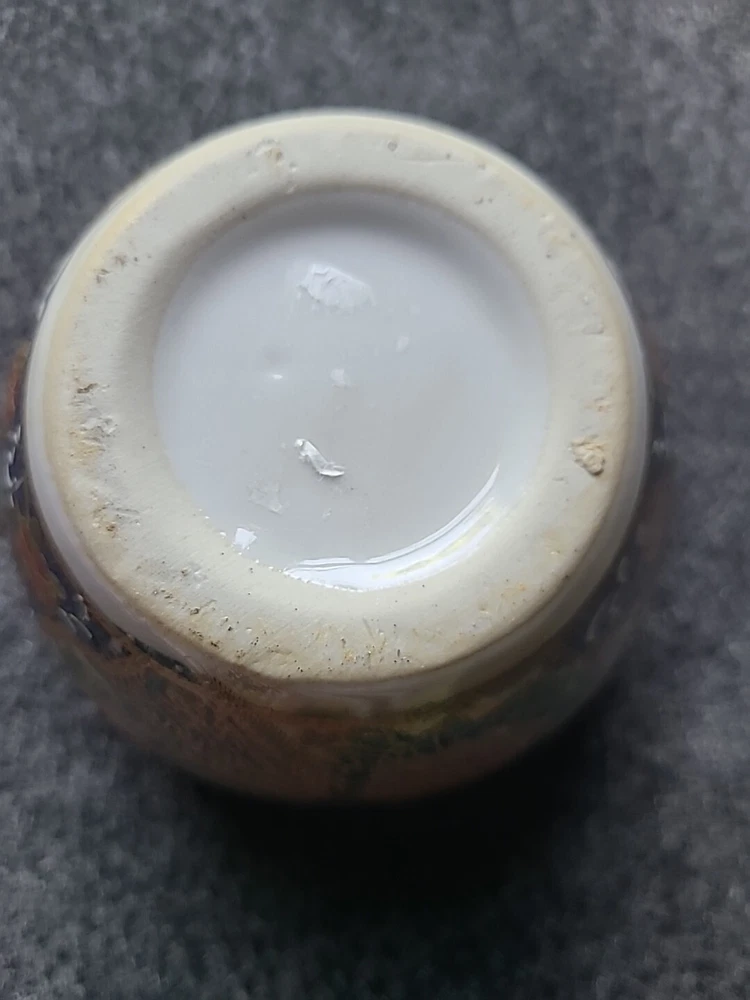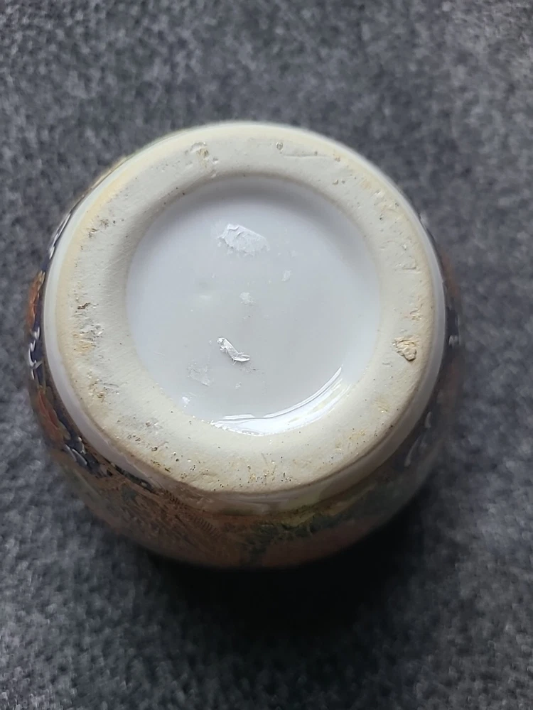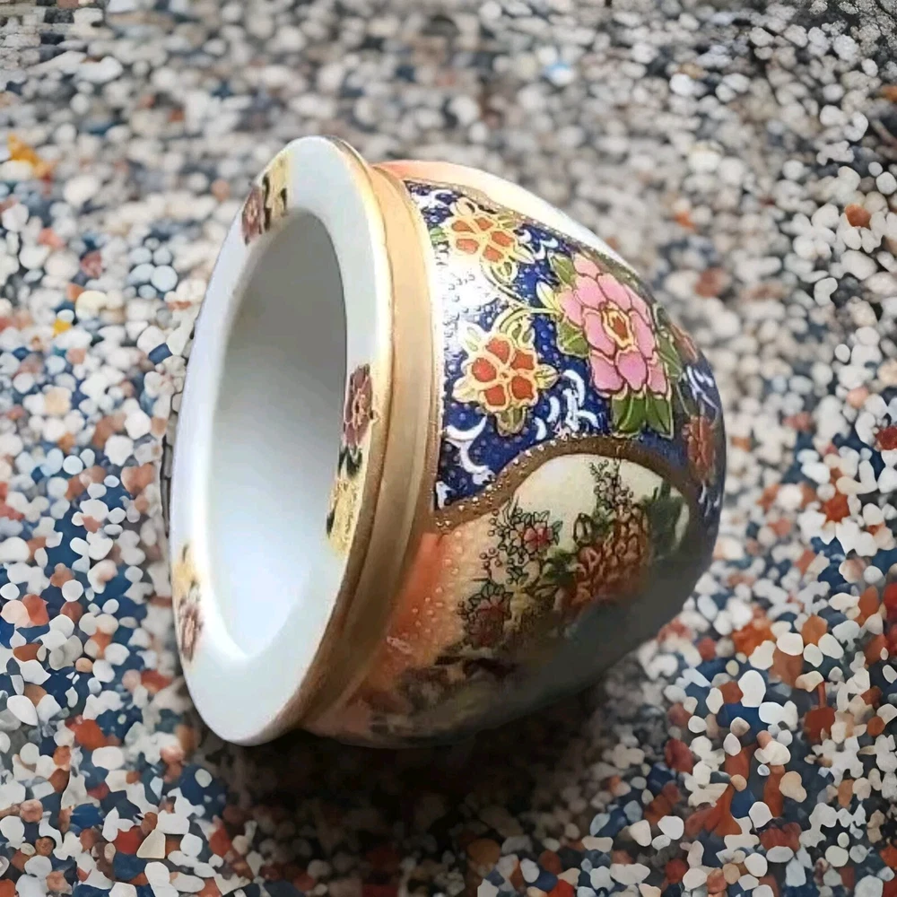 This small pot/vase features a peacock and nature scene design in multi-color porcelain. It is inspired by vintage Oriental aesthetics, with gold-like accents. The height is 3.5 inches, originating from China. The theme includes peacocks and flowers. The specific Chinese dynasty and age are unknown, as well as the maker of the item.