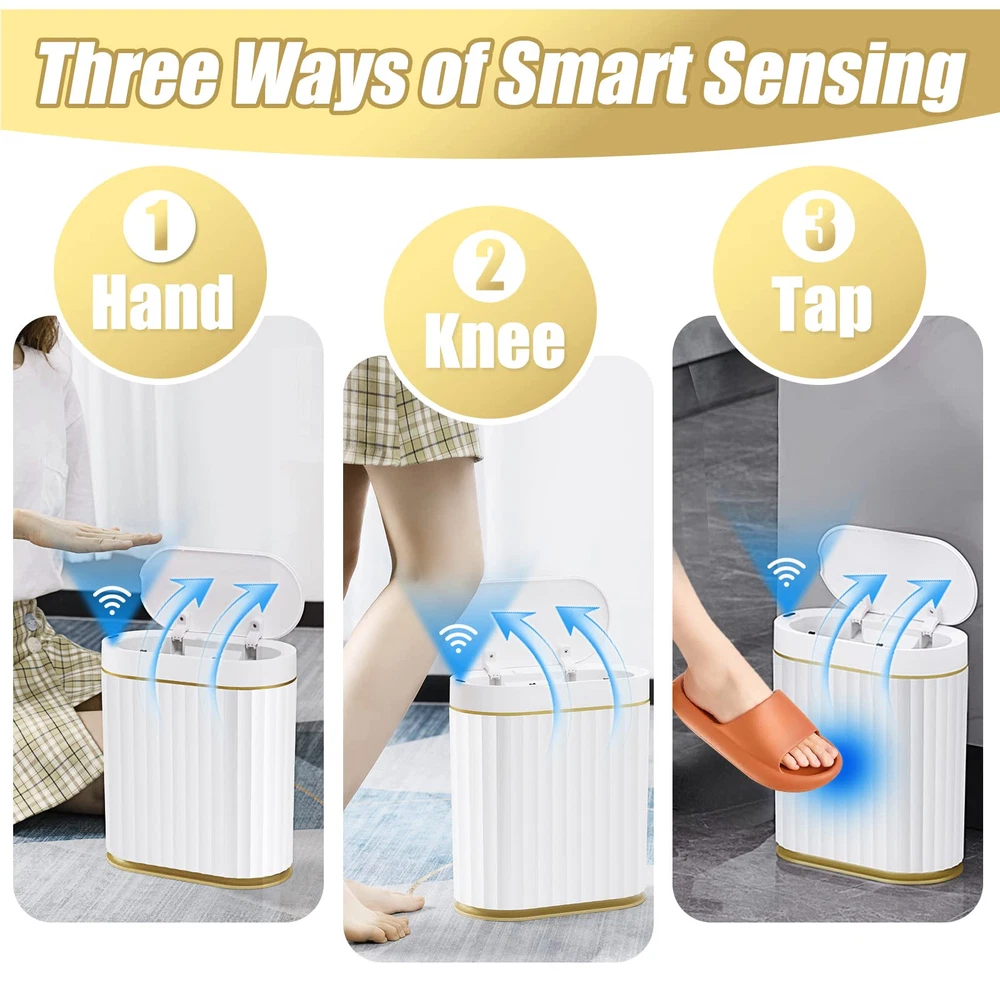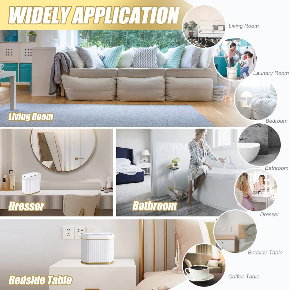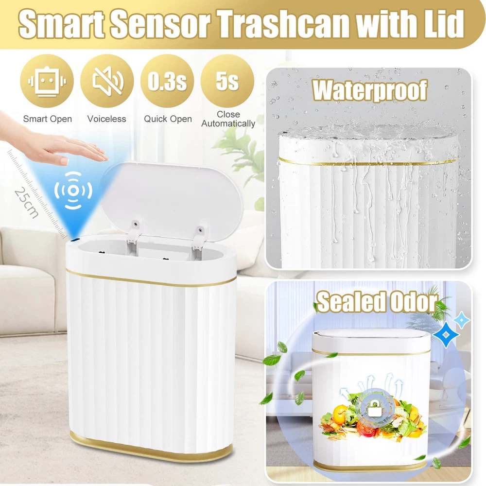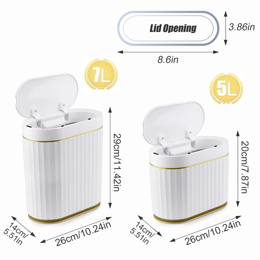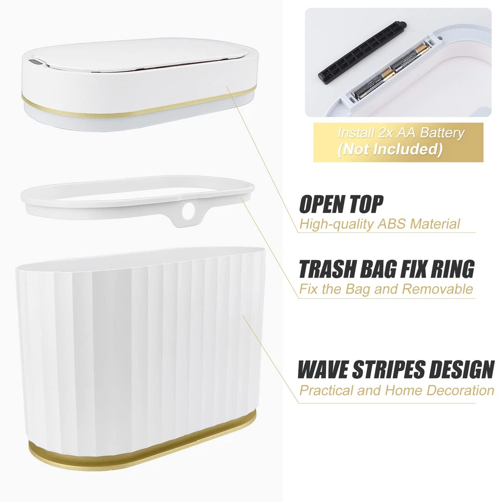 AUTOMATIC OPEN AND CLOSE LID - Our trash can uses Smart Infrared Sensor Technology, the lid will automatically and quietly open within 0.3 seconds through a wave of the hand for a hands-free way to throw away the garbage. And close it after staying for 5 seconds. ELEGANT & SPACE-SAVING - Our trash can combines a modern oval-shaped design with novel wave stripes and white & gold simple elegant color, giving it a good decorative effect on your house. And the compact and slim size makes it ideal for small spaces like a Bathroom, Dresser. SEALING & WATER-RESISTANT DESIGN - Advanced IPX5 waterproof technology prevents water or humid environment from damaging the unit. And touchless smart lid has good Sealing that helps keep garbage out of sight and hides odors. DURABLE & EASY TO CLEAN - Made of ABS engineering plastics and treated with polished. Sturdy and easily remove the dirt on the surface of the trash can with just 1 touch. Ideal for use in the Office, Kitchen, Bathroom, Bedroom Room Desk/Floor, etc. SMALL CAPACITY & LARGE OPENINGS - 7L Size: 10.24x5.51x11.42inches , great for put it on the floor; 5L Size: 10.24x5.51x7.87inches, great for put it on the table. Height of lid open: 4.61inches, Caliber size: 8.66x3.82inches, Powered by 2 AA batteries(not included).