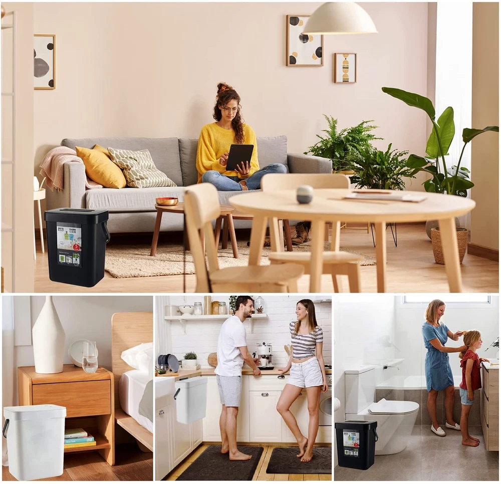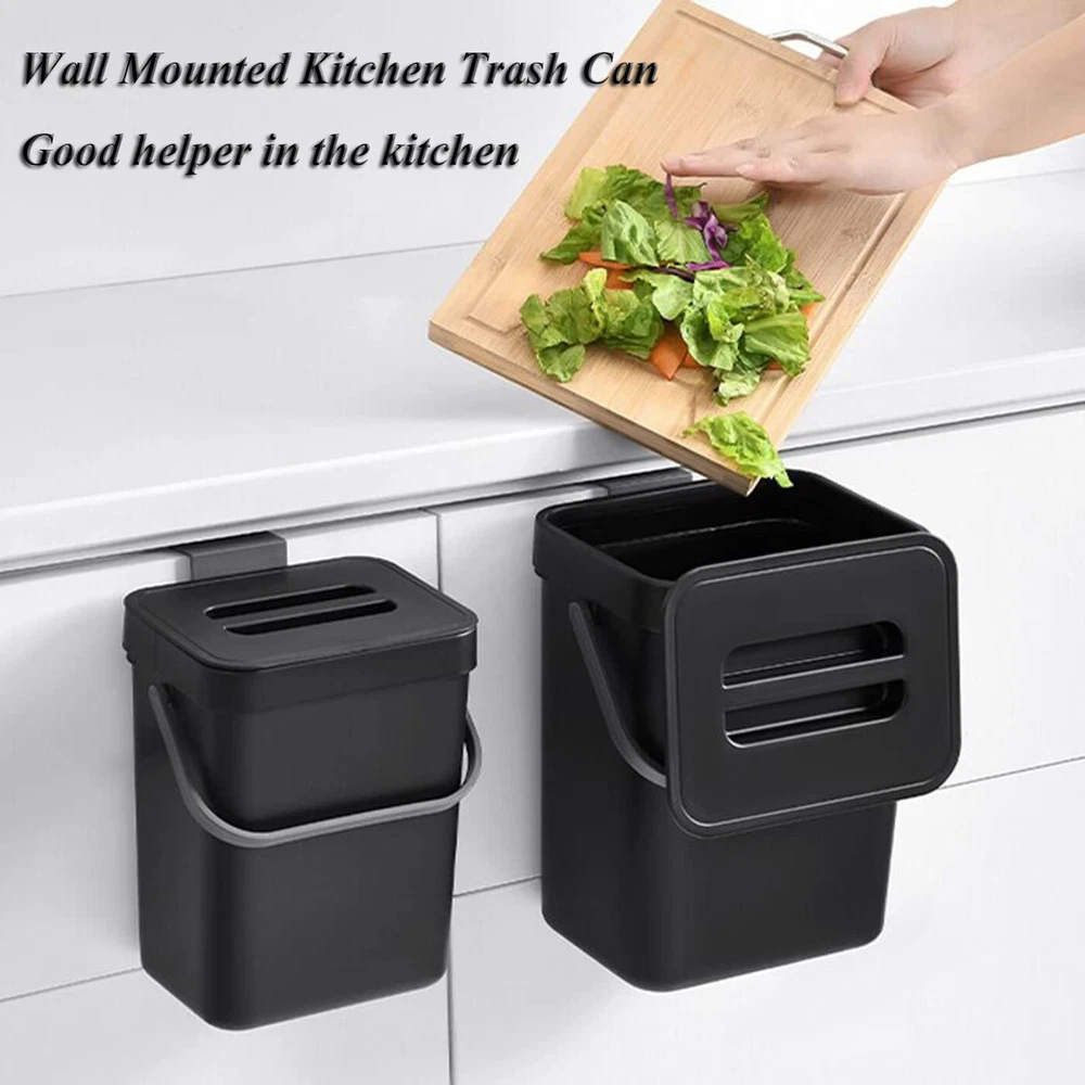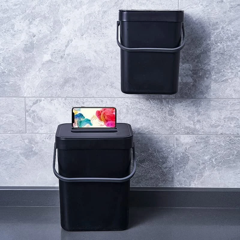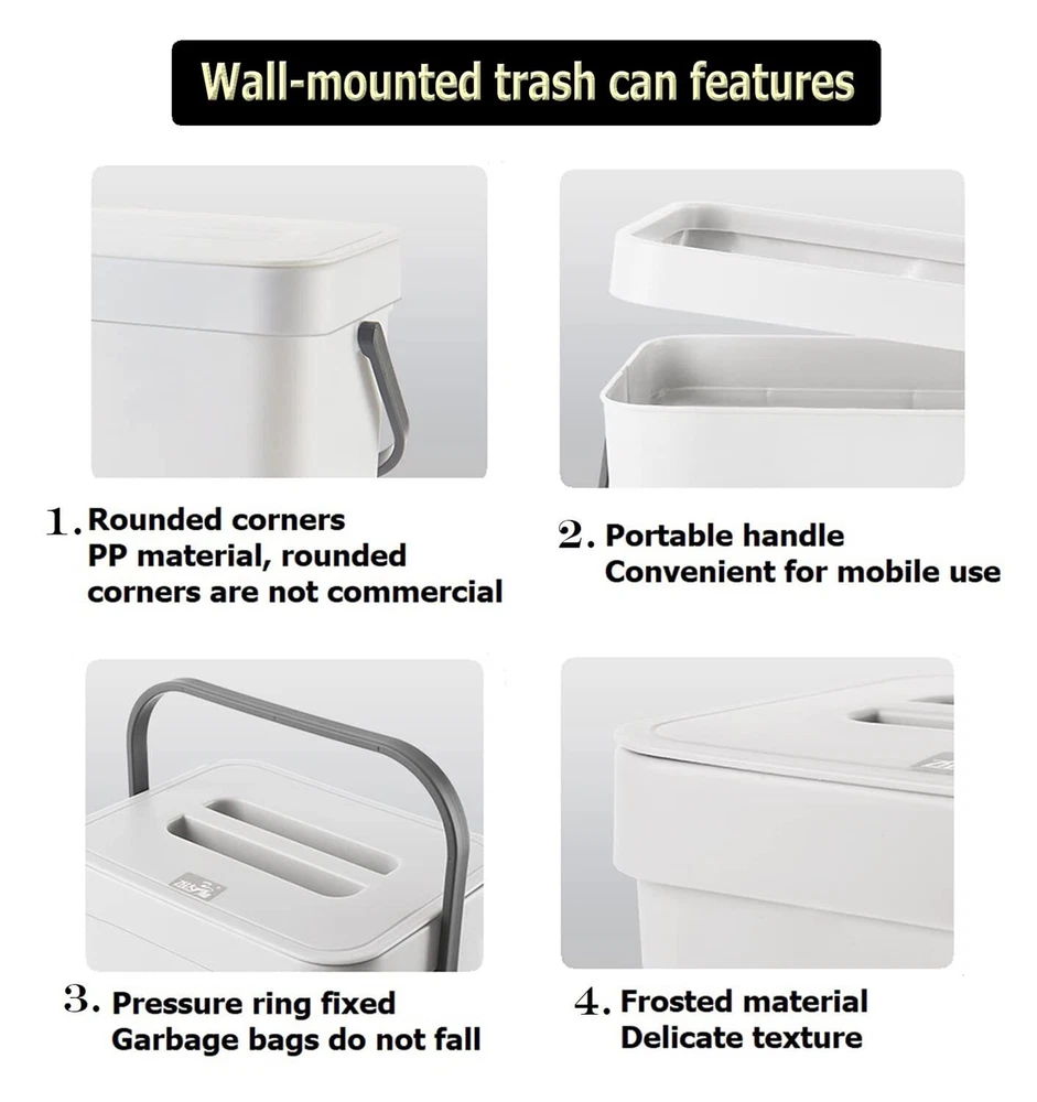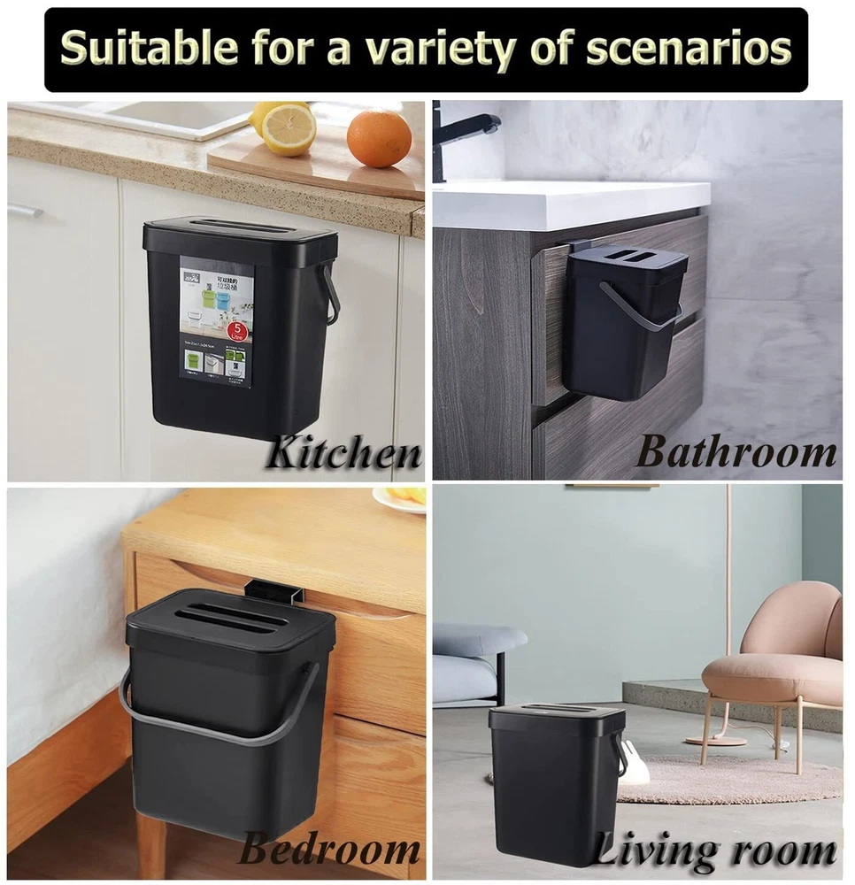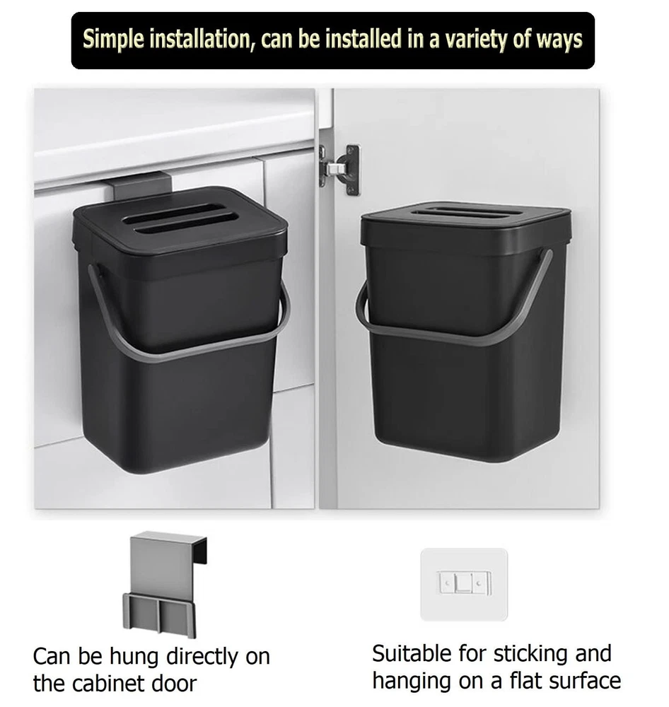✅【High Quality】: kitchen trash can with lid is made up with high quality plastic. The sturdy handle makes it easy to carry the filled bin. Perfect for everyday counter-top use.Indoor compost bin with lid designed specifically as a hidden non smelling fruit fly free. Super easy access for load and unload. ✅【Two installation methods】: Provide two installation methods: door hanging with over-the-door-hook ,wall-mounted with adhesive hooks.Can be hung over your kitchen cabinet door to manage scraps efficiently, easy to slide scraps directly into trash can. Can be attached to the wall or cabinet doors drawers.Can stand on the floor when needed. ✅【Wide Application】 : This trash can can be perfectly hung on your cabinet door, Drawer, Bedroom, Dorm Room door, car etc.There is a fixed bracket at the bottom of the trash can, you can also put it on the ground if you want. Widely used in Kitchen, Home, Room,Office, Bathroom, Bedroom, Car, Indoor, Outdoor, Garden, Yard, Camping and anywhere it is needed. ✅【Compact Kitchen Trash Can】Trash bin is easy to install hanging, mount accessory ( 1 hook, 1 adhesive hooks ) included.1.3 Gallons / 5 Liter. 8.3 inch*6.8 inch*9.6 inch. The trash can doesn't take up too much countertop space. Fits on a countertop, under the sink, or in the pantry, and works well for small living spaces like dorm rooms, apartments, condos, RVs, cabins and campers. ✅【After-sale 】: We focus on high quality products and provide favorable clients experiences, if you have any suggestion about our trash can, please us, we will reply to you within 24 hours, wish you a happy shopping.