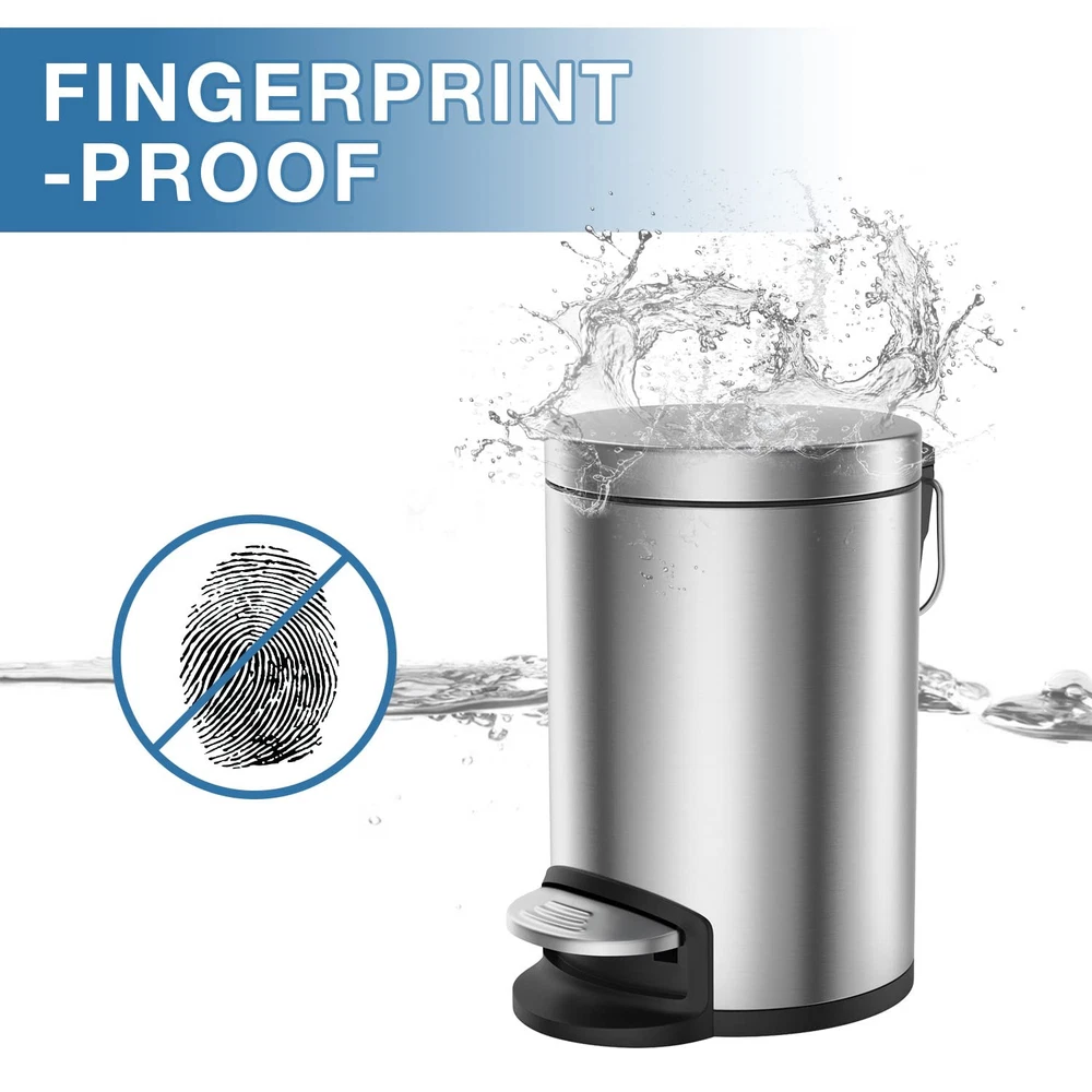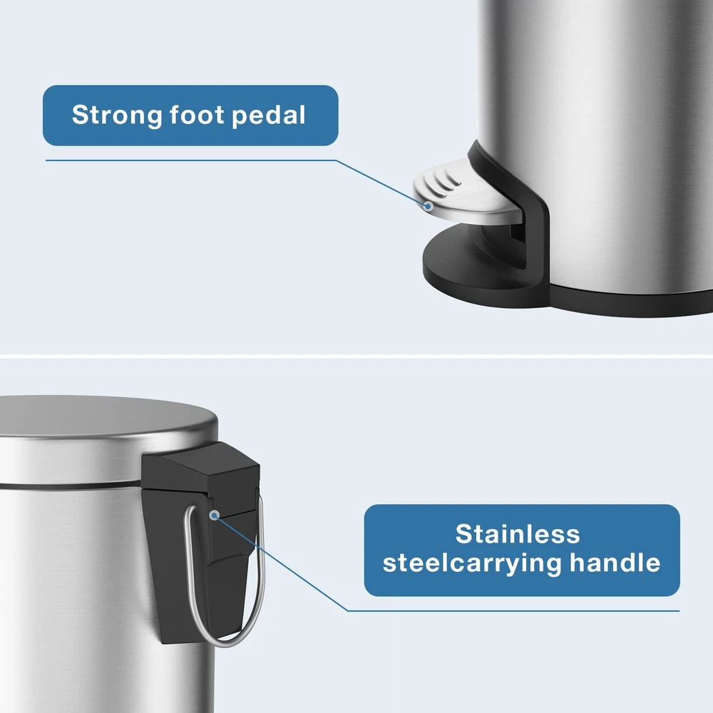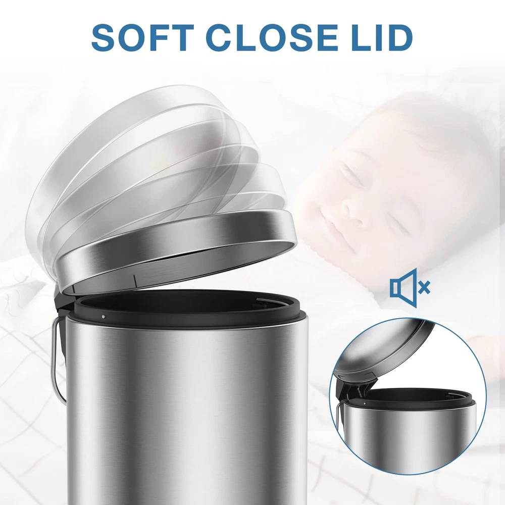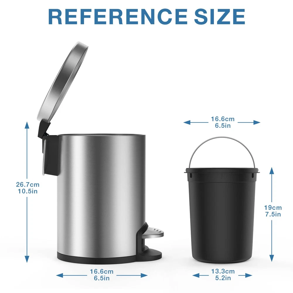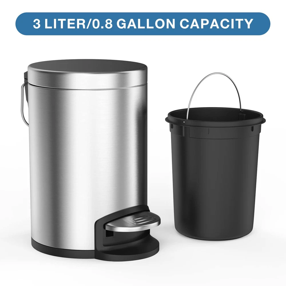 Removable Inner Bin: Removable inner liner with a stainless steel handle lifts out for easy dumping garbage without using grocery plastic bags and easy rinsing the whole small garbage can. Soft Close Lid: Lid shox technology makes the lid automatically, slowly and softly close with controlled closure, so it doesn't slam down and make a sound. Size and Capacity: This is a mini trash can, 3L/0.8Gal mini trash can is suitable for narrow areas, such as bedroom, kids room, office, toilet, desk, countertop or corner.Please check the product size from the picture before ordering it. The foot pedal with rubber surface has been upgraded to stainless steel foot pedal. Anti-Fingerprint : The trash can with lid is made out of high-quality commercial-grade carbon steel to resist fingerprint and rust. Hassle Free Purchase: 1 year and 30 days money back and . If the trash can you received is damaged or the color is wrong, please us for a new .