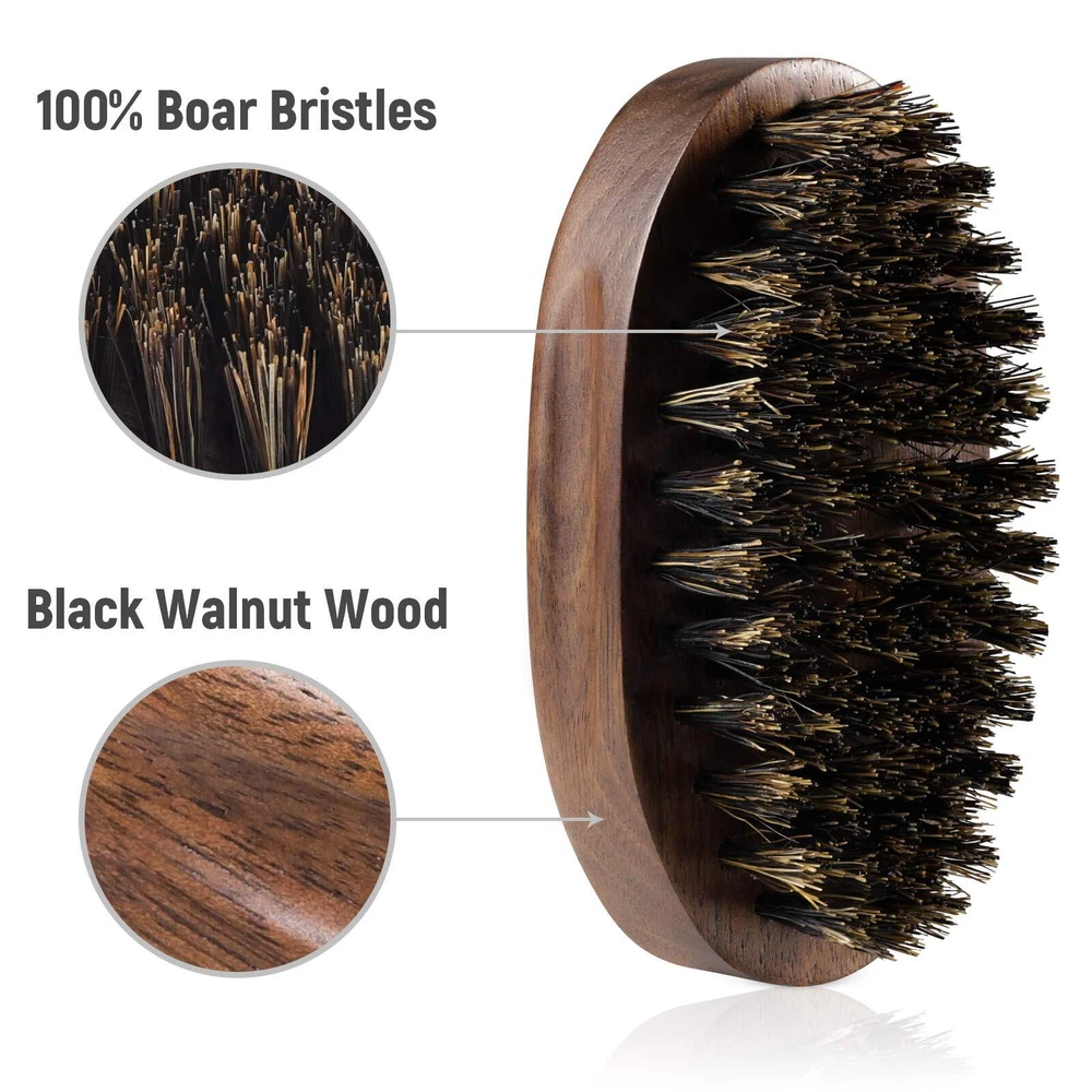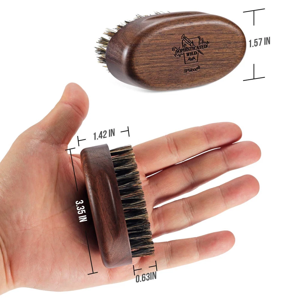 Dimensions: 1.57 x 3.35 x 1.42 in; Bristle Length: 0.59 in Oval shape, thick base, indentations on the side for better grip. Medium-stiff boar bristles evenly distribute oils throughout the facial hair to prevent dryness and itchiness. Pocket-sized beard brush fits into any bag; ideal for on-the-go beard care. How to clean: First pull out any remaining hair from the brush, then place the brush, bristles down, into a shallow soapy bath. Be careful NOT to immerse the wooden part of the brush in water or it damage the wood. Finally, rinse with clean water, place the brush on a cloth with the bristles facing down, and let it dry overnight.