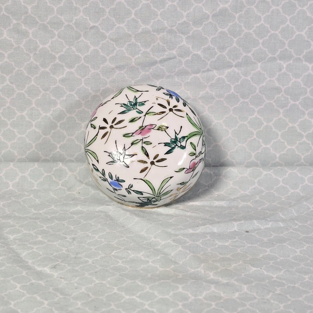 This small trinket dish features a floral painted design on a white ceramic or porcelain material with a gold rim. It is perfect for holding small items like jewelry or keys, adding a decorative touch to any space.