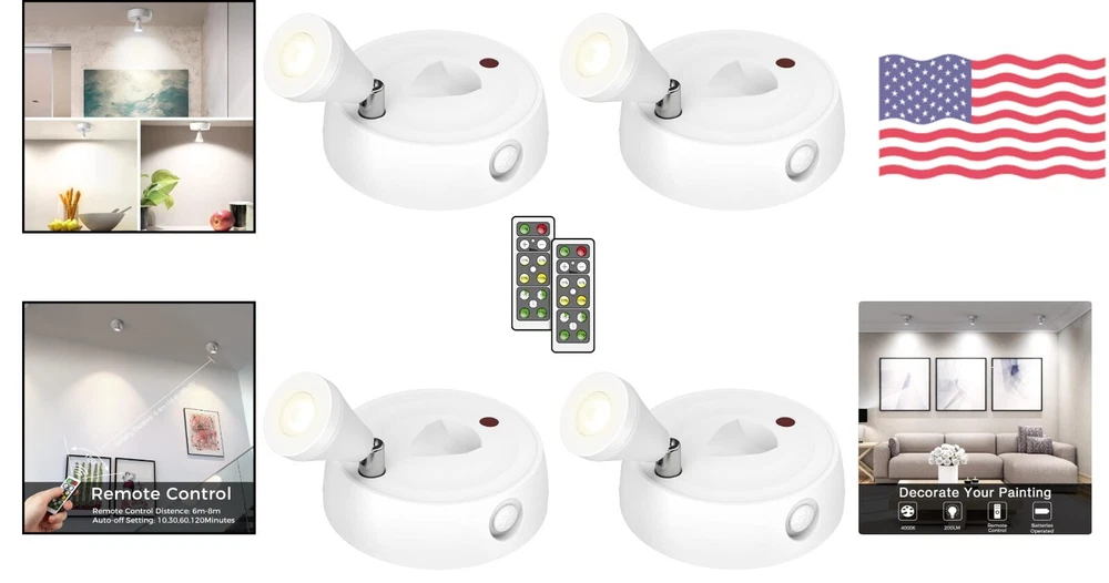 Small Uplights Battery Mini Spotlights - Dimmable LED Accent Light - 4 Pack ‹ › ‹ › ‹ › ‹ › ‹ › ‹ › ‹ › ‹ › ‹ › Small Uplights Battery Mini Spotlights -Dimmable LED Accent Light -4 Pack Features: Safe and easy to use 200 lumens, 4000K neutral white Comes with 2 remote controls for ON/OFF, Timer, and Dimmer functions Adjustable heads that rotate 360 degrees Easy installation with sticky back tape or screws Includes 4 neutral white wireless spotlights, 2 remote controllers, double-sided tape, screws, and user manual Battery powered (3 AA batteries per spotlight) Benefits: Perfect wireless spotlight for artwork, painting, photographs, closets, kitchens, living room, hallways Timer function helps preserve battery life Dimmer options for customizable brightness Adjustable heads allow for precise lighting direction Easy installation on any clean and smooth surface Convenient remote control operation Why choose our Small Uplights Battery Mini Spotlights? Enhance the beauty of your artwork and create the perfect ambiance with our Small Uplights Battery Mini Spotlights. With their dimmable LED accent light and adjustable heads, you can easily highlight your favorite pieces and set the desired brightness. The included remote controls make it convenient to control the lights from a distance, and the timer function helps preserve battery life. Plus, with easy installation and battery-powered operation, you can place these spotlights anywhere in your home without the need for wires or outlets. Don't settle for ordinary lighting - choose our Small Uplights Battery Mini Spotlights and transform your space into a work of art! Shipping Free & Fast Shipping - We offer free shipping to most of the USA with a normal delivery time of 3-7 days. However, due to the current situation, additional delivery time (up to 3 weeks) may be required for some items. Alternative Carriers - We may use alternative carriers (e.g. USPS, FedEx, UPS, etc.) to ensure your package arrives safely and on time. Due to the use of multiple carriers, we are unable to provide a tracking number automatically. Handling Time - Orders are processed and shipped within 1-2 business days of receiving cleared payment. Shipping Restrictions - Shipping to Alaska, Hawaii, Puerto Rico, Guam, and other US territories may incur shipping charges or delivery restrictions. Please contact us before ordering, or your order can be refunded/cancelled. State Restrictions - There may be restrictions based on your state of purchase. For example, certain items may not be shipped to California due to state regulations. Contact for Tracking Updates - If you require tracking updates or have any concerns about the delivery of your order, please feel free to contact us, and we will be happy to assist you. Return 30-Day Hassle-Free Returns - We want you to be completely satisfied with your purchase. If you are not, you can return the item within 30 days of receiving it for a full refund or exchange. Easy Return Process - To start a return, simply contact us and we will provide you with a prepaid return shipping label and detailed instructions. Restocking Fee - There are no restocking fees for returns. However, the buyer is responsible for return shipping costs if the return is not due to a seller's error. Refund Processing Time - Refunds will be processed within 5 business days of receiving the returned item in its original condition. Payment We accept all major credit cards, PayPal, and Apple Pay for your convenience. Your payment information is secure and encrypted to ensure a safe and seamless transaction. Please complete your payment within 3 days of purchase to avoid any delays in shipping. Feedback Your feedback is extremely important to us. We strive to provide the best products and customer service possible. If you are satisfied with your purchase, please take a moment to leave us a positive review. If you have any concerns or issues with your order, please contact us before leaving negative feedback. We are committed to resolving any problems and ensuring your satisfaction. Contact Us If you have any questions or concerns, please feel free to reach out to our customer support team. You can contact us through the eBay messaging system. We are available Monday to Friday, 9:00 am to 5:00 pm EST, and we will do our best to respond to your inquiry within 24 hours. Thank you for supporting our small family business!