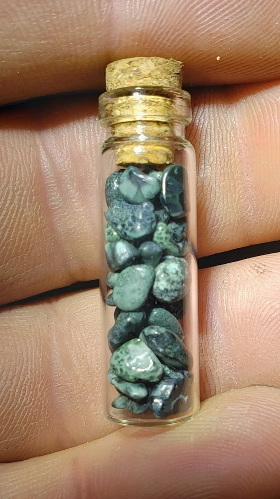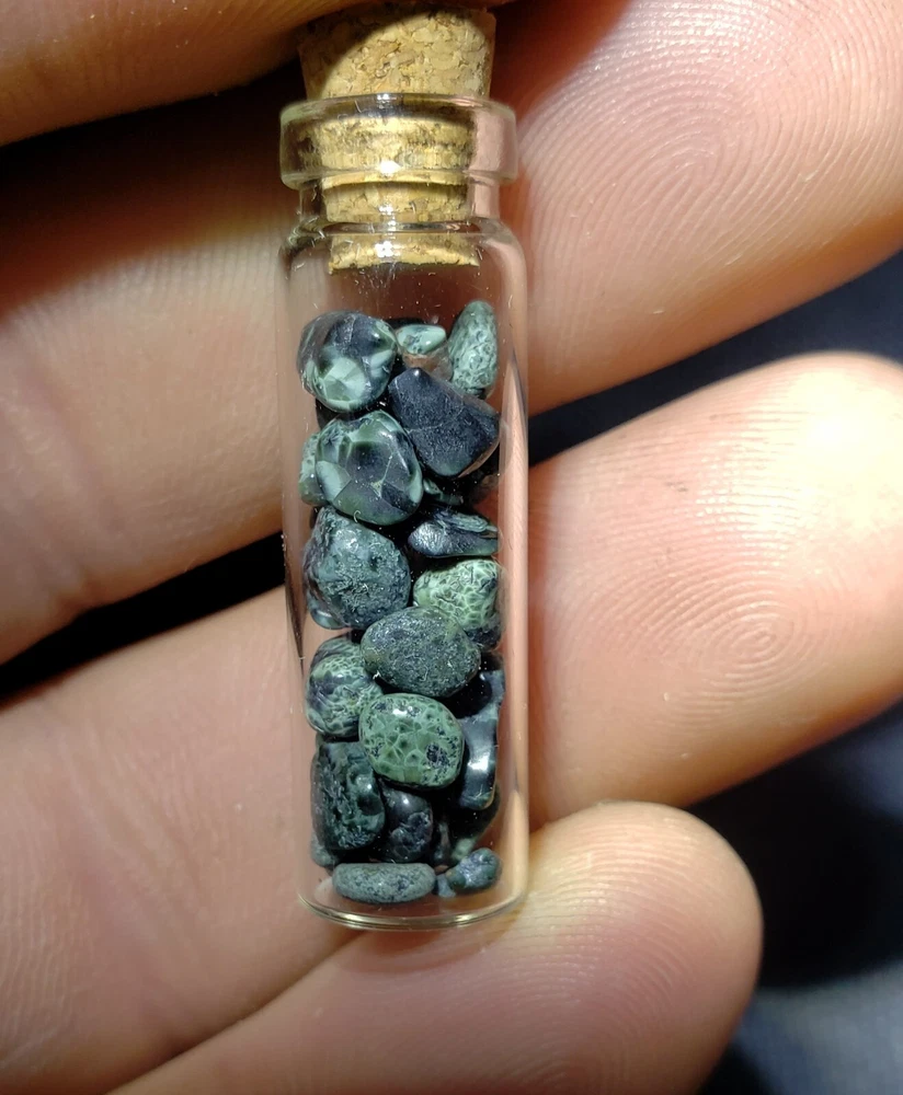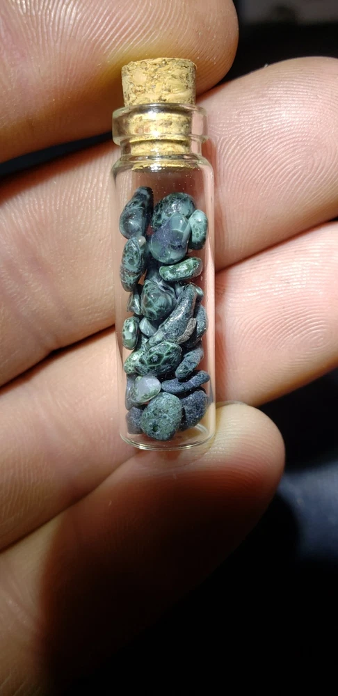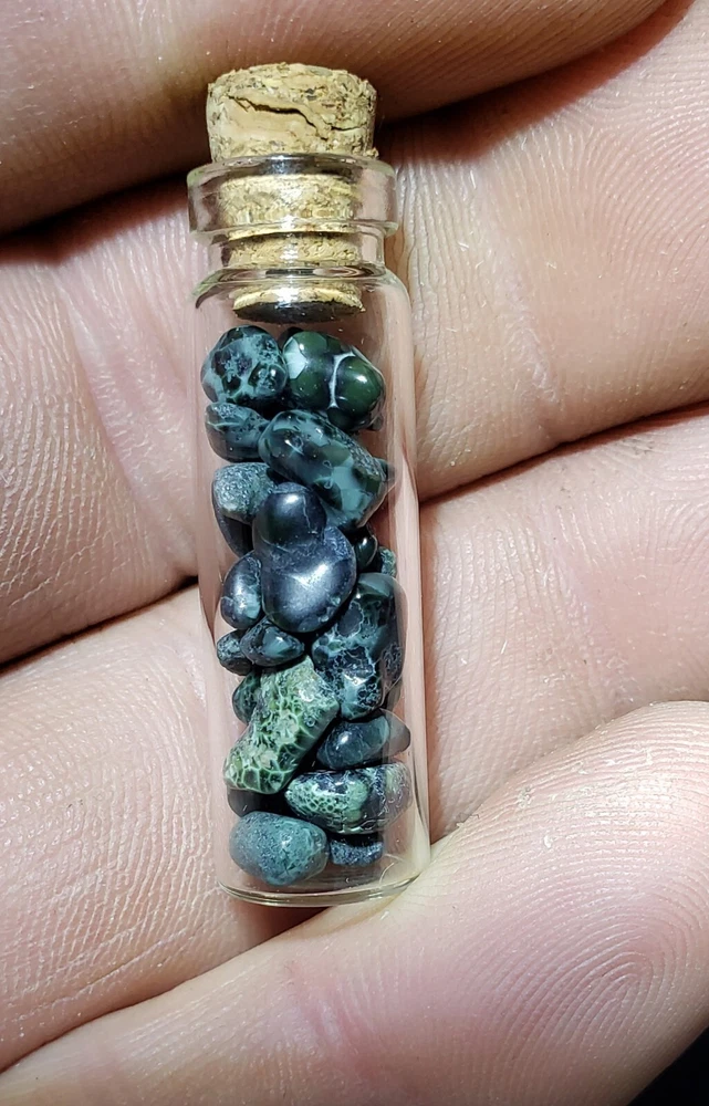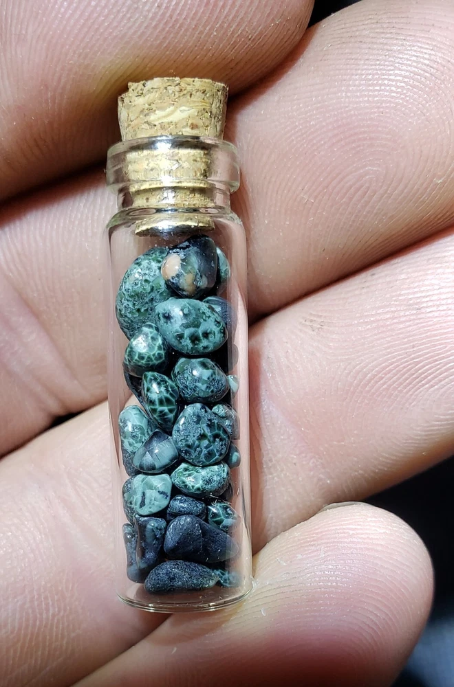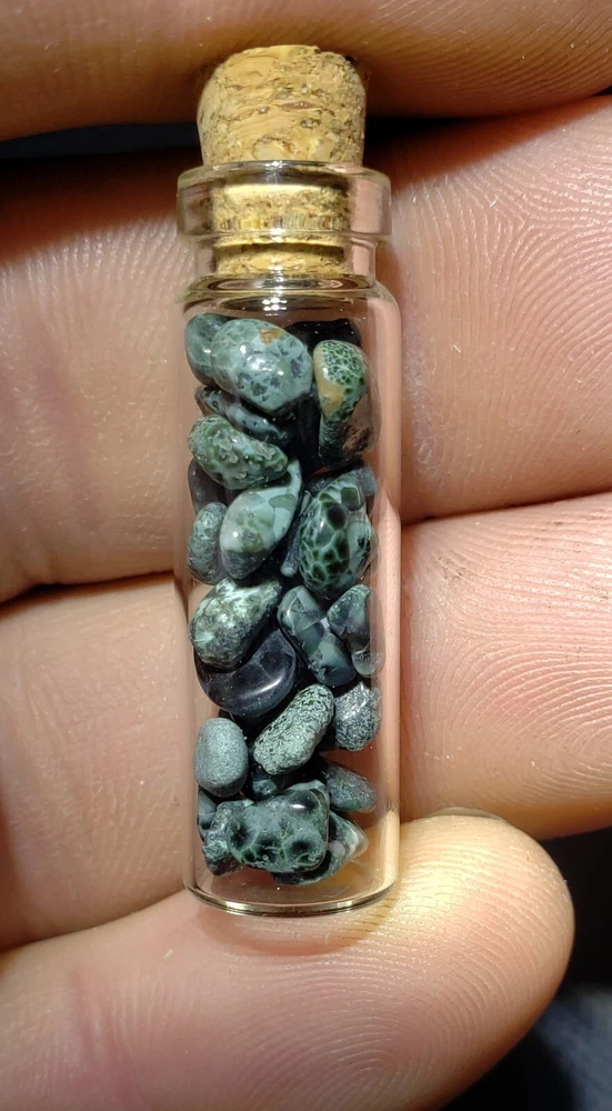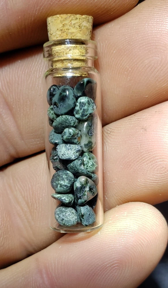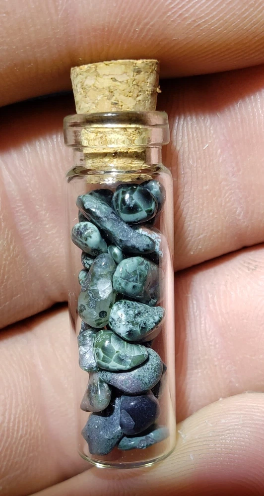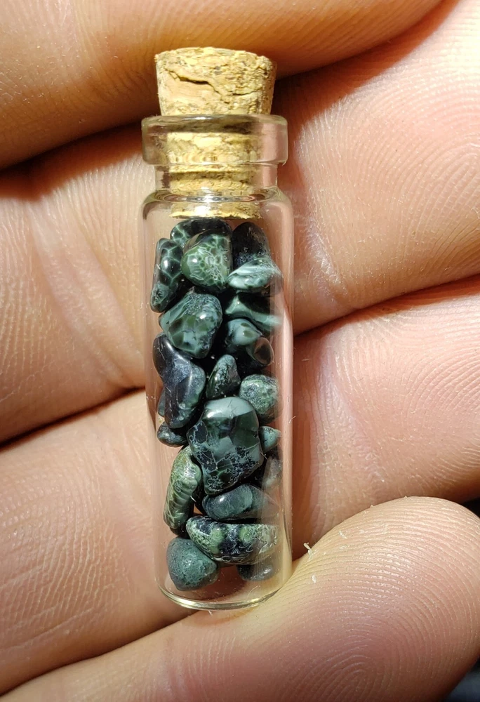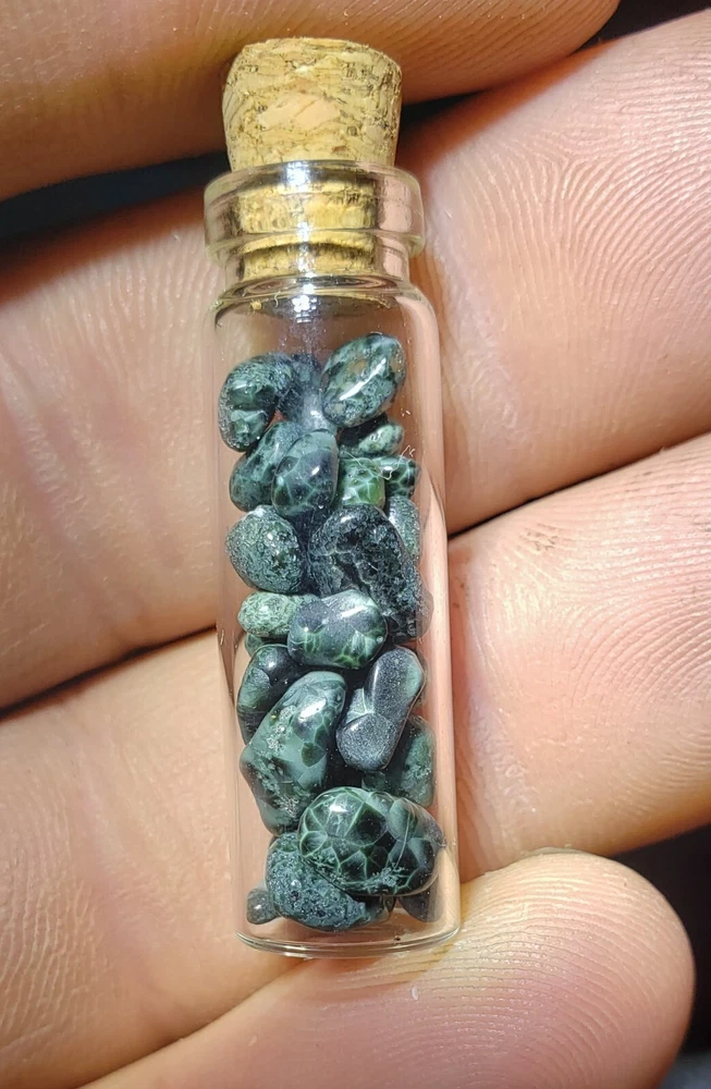 Beautiful Michigan State gem chlorastrolite aka greenstone. This listing is for one vile of polished greenstones vile is 1.5 inches tall by .42 inches wide. There is 3 grams of beautiful gems in each. I specifically hand selected a gram of nice stones for each one to just to make sure that there were some really nice ones in each one. The pictures that you see are what i put togather for this listing , u will receive one at random , I am not listing each one separately so please don't ask for a specific one. These stone have a beautiful light turtle back pattern, some have darker pattern that are very chaytoyant , some are from the island and some are from the mainland. This is a big mixture which shows you what all these gems can look like from all kinds of different localities from the keweenaw peninsula. This really is a great deal , and would make a great gift for anyone to own a little piece of michigan. If you have questions about this listing please ask. I usually respond rite away.