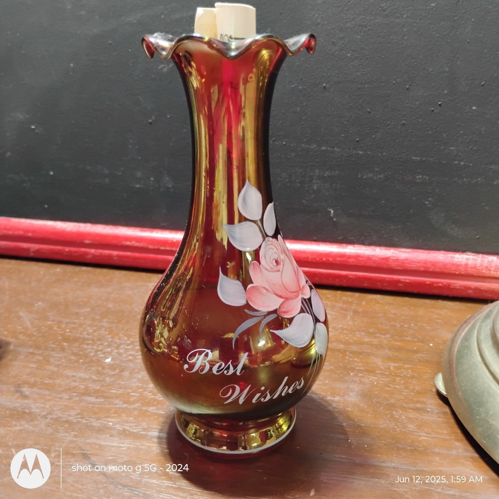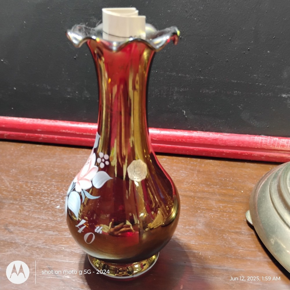 This product is a small Westmoreland 40th Anniversary vase, hand painted in amber glass. It comes with a certificate of authenticity and was made in the United States. The vase is a special edition model celebrating the 40th anniversary of Westmoreland's craftsmanship, making it a unique and collectible piece for pottery and glass enthusiasts.