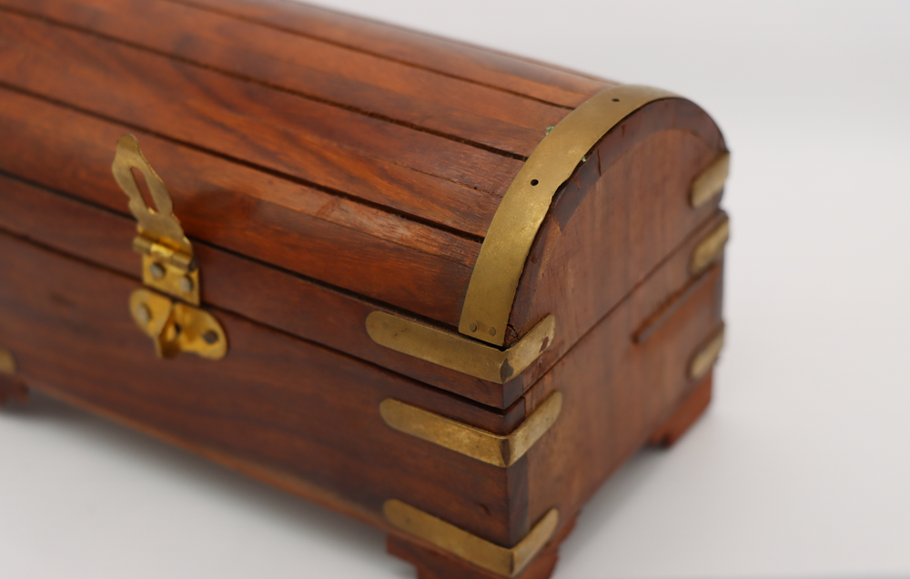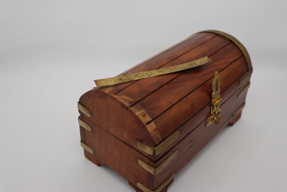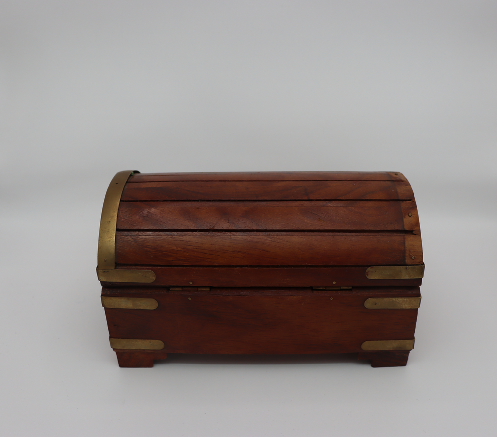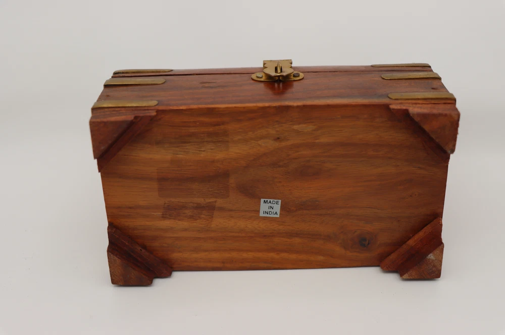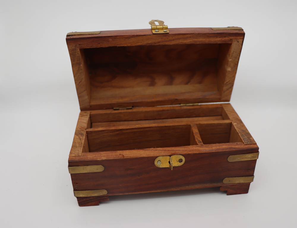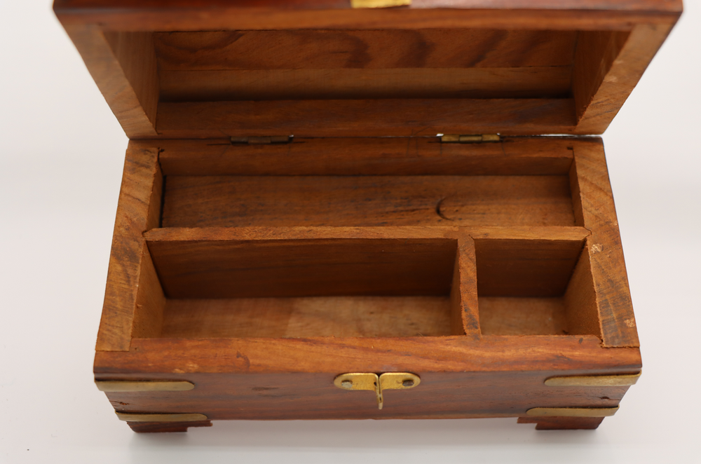 Small Wooden treasure chest and brass jewelry box with hidden drawer, small flaw, Made in India In condition EXCEPT for brass edging fell off top left corner/edge. Piece included, just needs to be reattached. It doesn't affect functionality so you could use it without it. This would be great for a small jewelry box, or a mini treasure chest for a child. Description Own a piece of craftsmanship with this small wooden and brass jewelry box, made in India. Featuring intricate brass inlays and a hidden drawer for discreet storage, this box is perfect for holding your cherished trinkets, rings, or keepsakes. Its rich wooden finish and elegant brass detailing exude a timeless, rustic charm. While it has a small flaw that adds character, this handcrafted piece remains a functional and stylish addition to your decor. Ideal as a gift or for personal use, it showcases the artistry of Indian woodworking traditions. Keywords wooden jewelry box brass jewelry box hidden drawer jewelry box handcrafted jewelry box Made in India jewelry box small wooden box brass inlay box rustic jewelry box vintage-style box intricate design jewelry box storage box keepsake box ring box elegant jewelry box decorative storage box Indian craftsmanship small trinket box handmade jewelry box unique jewelry box wooden decor box brass detailing jewelry holder compact jewelry box gift jewelry box artisan jewelry box Indian wooden box brass accents jewelry storage rustic charm box small flaw wooden keepsake box