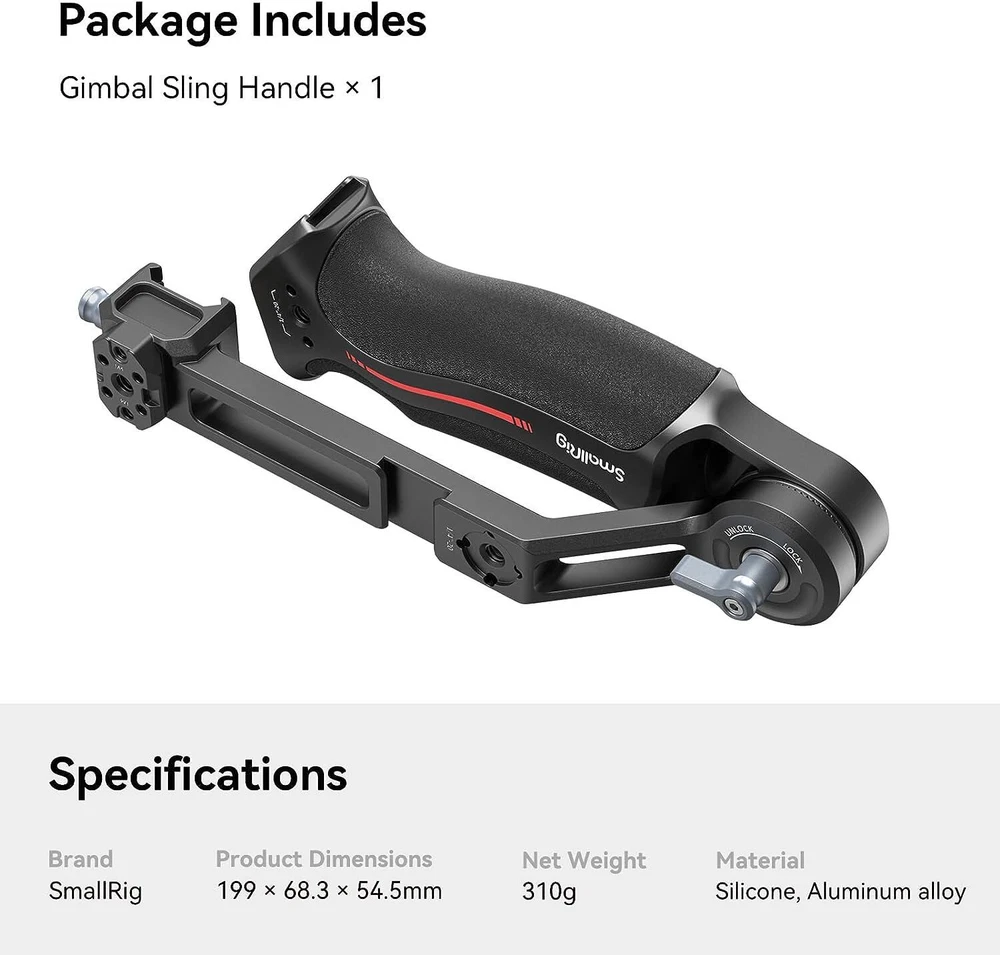 SmallRig Sling Handgrip for DJI RS 2|RSC 2|RS 3|RS 3 Pro|RS 3 mini 3028 About this item For DJI RS 3 Mini / RS 3 / RS 3 Pro / RS 2 / RSC 2 : SmallRig Sling Handgrip 3028C designed for the DJI RS series reduces arm fatigue and adds stability to low-angle gimbal shots. It can support up to 8 kg / 17.6 lbs and adopts a longer arm bracket, making it more versatile for RS 3 Pro and larger camera setups. Optimized Ergonomic Design : This gimbal sling handle has been updated with a curved design that better fits ergonomics. Its grip length has been increased with finger stops, providing a more comfortable and secure grip for larger hands. Constructed with a combo of silicone and aluminum alloy, it is lightweight but strong. Its sleek design and compact structure match perfectly with the stabilizer. Quick Release Features : It securely attaches to your gimbal with a NATO clamp, with anti-removal stud for safe and quick operation. On this version we integrate a NATO rail on the side, allows for mounting SmallRig 3026B to provides a good spot for your monitor. Additionally, a QD socket is added, providing the option to mount a QD neck or shoulder strap for additional support. 180 Degree Adjustment : SmallRig gimbal handgrip offers 180° adjustment through its built-in rosette joint, giving you the flexibility to shoot from various angles and reducing the strain on your arm. The rosette joint can be detached, allowing you to use the handgrip on its own as a rosette handgrip. Abundant Mounting Points : It features multiple 1/4"-20 and 3/8"-16 threads for ARRI, enabling you to mount magic arms 2115/3874 or monitor mounts 2903B. Besides, two cold shoe mounts are situated on top and side, allowing you to attach a wireless mic or video transmitter. \ Notice: Max Payload: 6 kg Compatibility: DJI RS 2 DJI RSC 2 DJI RS 3 DJI RS 3 Pro DJI RS 3 Mini In the Box: Handle × 1 Specifications Product Dimensions: 199.0 x 68.3 x 54.5mm Package Dimensions: 221.0 × 112.5 × 40.0mm Net Weight: 310.0 ± 5.0g Package Weight: 375.0 ± 5.0g Material(s): Aluminum Alloy, Silicone Compatible Model for DJI RS 2 / RSC 2 / RS 3 / RS 3 Pro / RS 3 mini Country/Region of Manufacture China MPN 3028B Compatible Brand For DJI Brand SmallRig Features Quick Release, Adjustable Material Aluminum, Silicone To Fit Camera Type Handgrip Model 3028B Item Weight 0.65 lbs