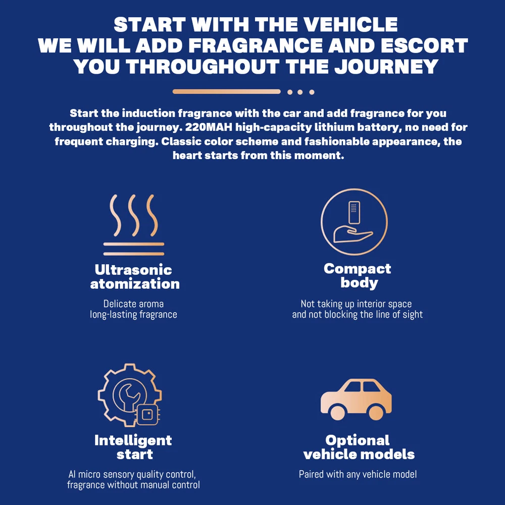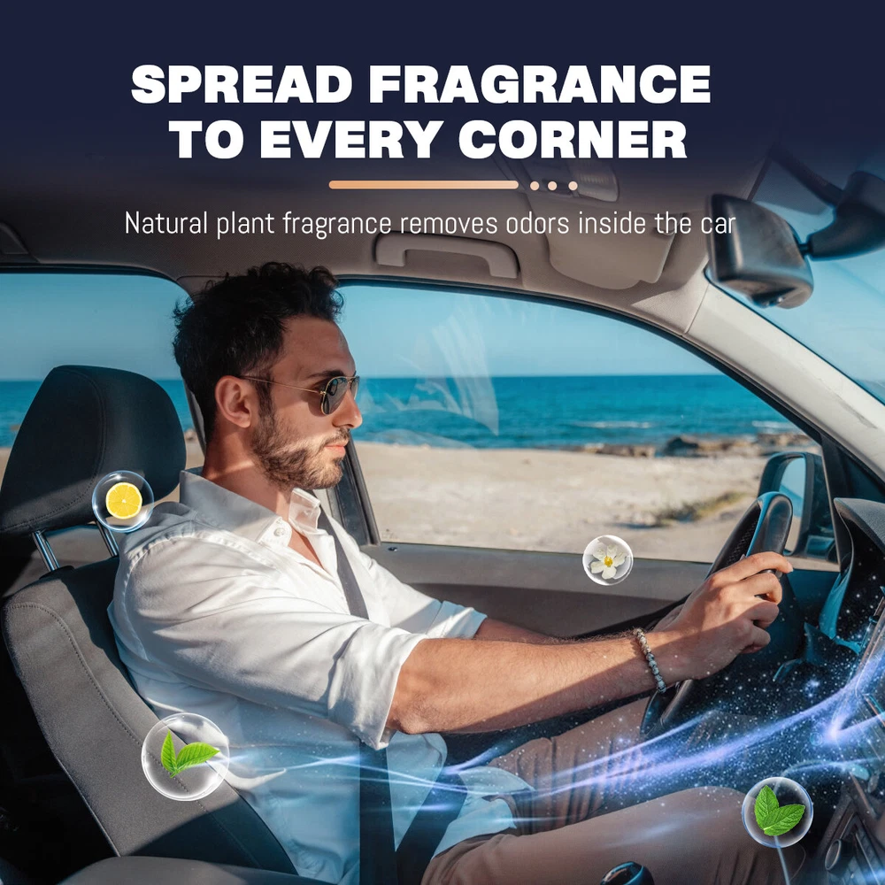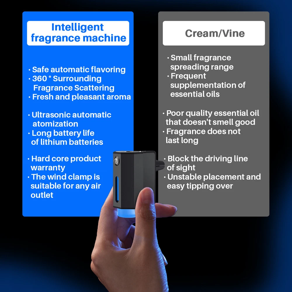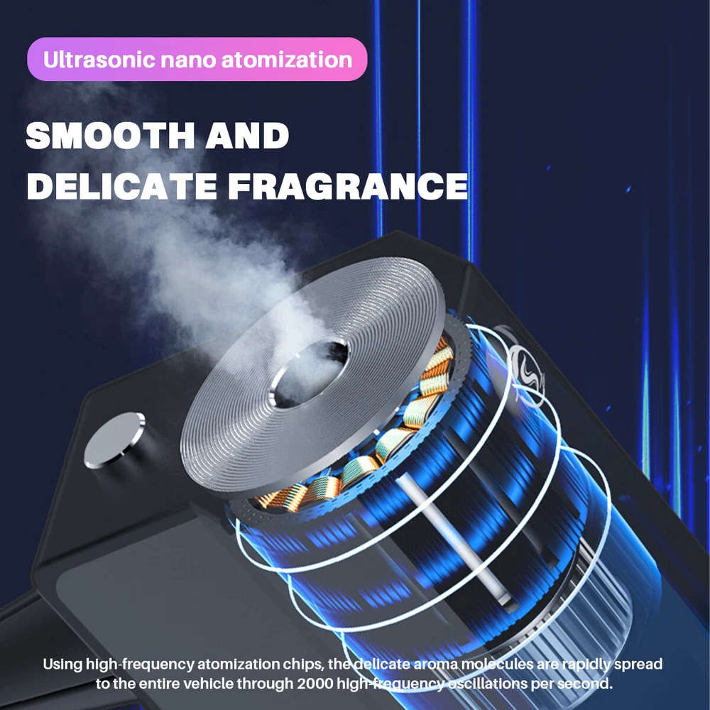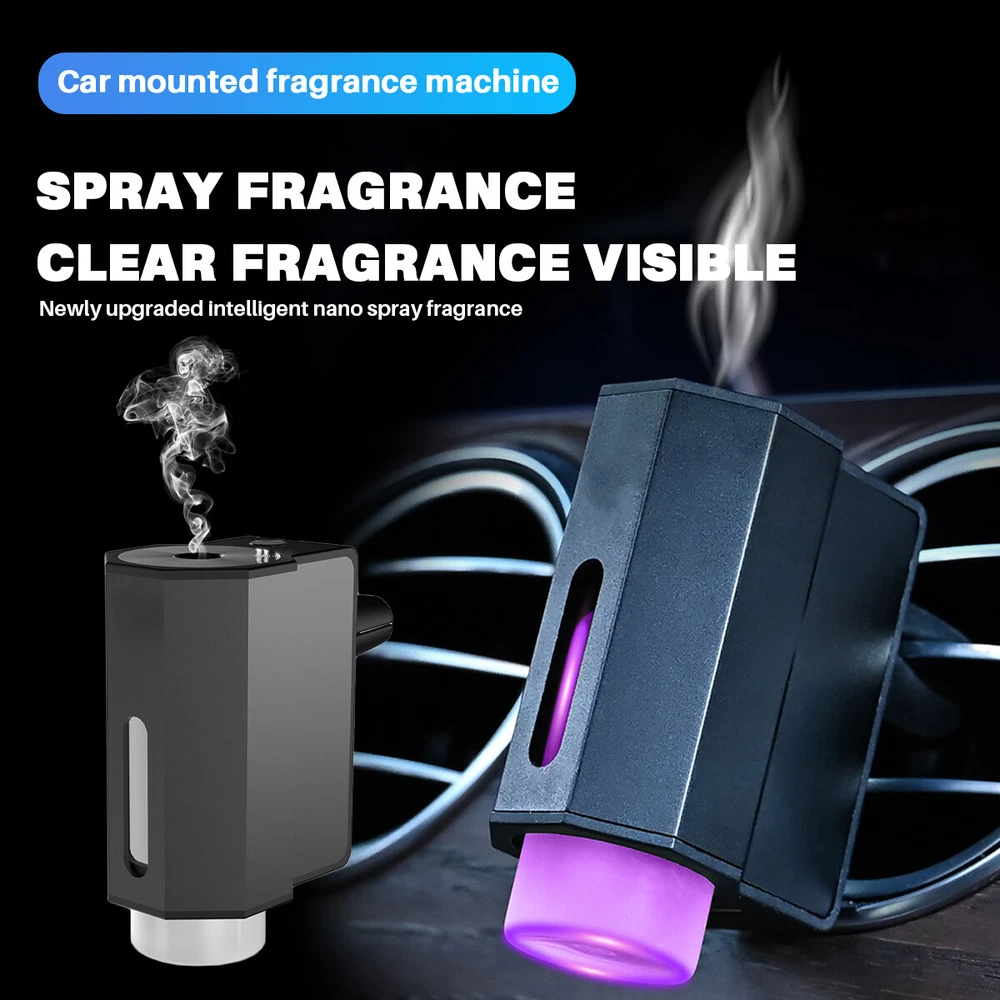 Car Air Fresheners - 3*10ML Natural French Perfume Lasts 45 Days, Portable Waterless Car Diffuser Air Freshener Car Aromatherapy Diffuser, Adjust Concentration Scent Features: 1. Intelligent car air freshener: Intelligent car air freshener with three adjustable modes: intelligent start, automatic shutdown, and intelligent fragrance adjustment. It can detect the condition of the air conditioning in the car and match it with the ambient light, automatically adjusting the duration of the fragrance. It provides three modes that can be freely adjusted. 2. Exquisite Design - This intelligent car air freshener has a fashionable design that can not only serve as a car diffuser, but also as a decorative accessory. It can be used in various environments, including inside cars, as well as in places such as bathrooms, bedrooms, or pet areas at home. 3. High quality: The intelligent car air freshener is made of durable aluminum alloy, with a long service life. Equipped with a 220mAh lithium battery, fully charged in 60 minutes, with a battery life of up to 45 days. 4. Three adjustable modes with projection lights: The intelligent car air freshener is equipped with projection lights and provides three injection modes: - Mild mode: Green light, spraying every 300 seconds for 0.2 seconds- Medium mode: Blue light, sprayed every 90 seconds for 0.2 seconds- Strong mode: Purple light, spraying for 0.2 seconds every 10 seconds. 5. Intelligent car air freshener: Easily eliminate various odors and provide a refreshing experience. Our waterless car diffuser ensures no clutter and requires minimal cleaning, making it the perfect choice for cars, bedrooms, living rooms, offices, and other spaces. Specifications: Battery capacity: 22mAh Spray mode: Green spray 0.2 seconds every 300 seconds, blue spray 0.2 seconds every 90 seconds, purple spray 0.2 seconds every 10 seconds Package List: Aromatherapy machine * 1 Charging cable * 1 Aromatherapy liquid * 3