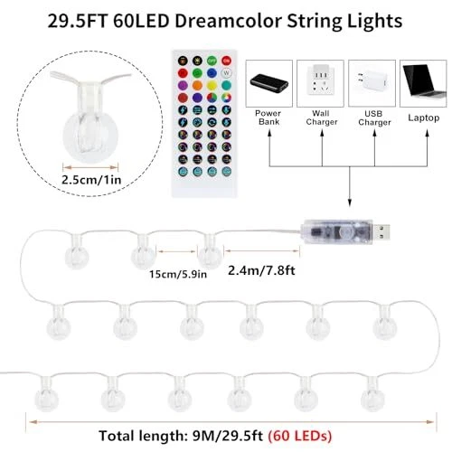 Return Policy Fast Delivery Trusted seller Smart Christmas String Lights Indoor, 29.5ft 213 Modes Crystal Fairy Lights, 60LED Color Changing Globe Decorative Hanging Lights with APP Remote Music for Bedroom Party Girl Gift Tent Wall Xmas Décor Product Description APP Remote Button Control: Control the crystal Christmas lights via App and 40-key remote, change million colors, choose 213 modes, adjust brightness and speed, create customized timers. Or button control colors and modes from the control box. Sync with Music & Voice:With built-in sensitive microphone, the color changing string lights sync to music and follow the voice rhythm, creating a romantic, carnival, or warm, relaxing atmosp and a dreamy world. Timer & schedule: Personalize your lighting schedule by the App according to family daily routine. No worries to manage the RGB string lights every day. IP65 Waterproof: The 29.5ft 60LEDs USB powered string lights are IP65 waterproof, perfect for indoor and outdoor use. They are the ideal choice for bedroom, living room, wall, and balcony, patio, garden decorations. (please note: the USB controller is not waterproof, which need to be well protected.) Perfect Gifts: Perfect for Christmas tree, garden, wall, balcony, Thanksgiving, Valentine's Day, Wedding, party, outdoor, indoor, yard decorations. It's a delicate gift for families, friends or yourself at festival or every memorable day. Tips:The remote control has 5-level speed settings, and multi-color can be kept stable by setting the speed to the lowest, and the color can also be set to be fixed in the DIY interface of the product‘s APP. If the remote control does not work properly, please replace the button cell batteries. Shipping Returns Payment Shipping Shipping is FREE to all addresses other than APO/PO boxes in the lower 48 states. All our stock ships from US-based warehouses. Shipped via USPS or UPS (depending on location and package weight) Unless stated otherwise, all orders will ship within 24-72 hours of your payment being processed. Check our feedback to see the great reviews of FAST shipping we offer. Returns Seller does not accept returns Payment We currently accept payment via eBay managed payments only. Once payment is cleared, we will dispatch your shipment within 1-3 business days. Please refer to the "Shipping" tab for more information regarding shipping speed to your destination.