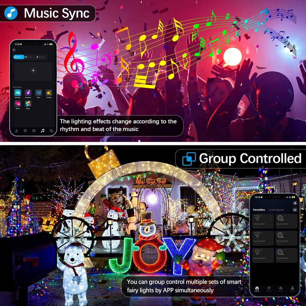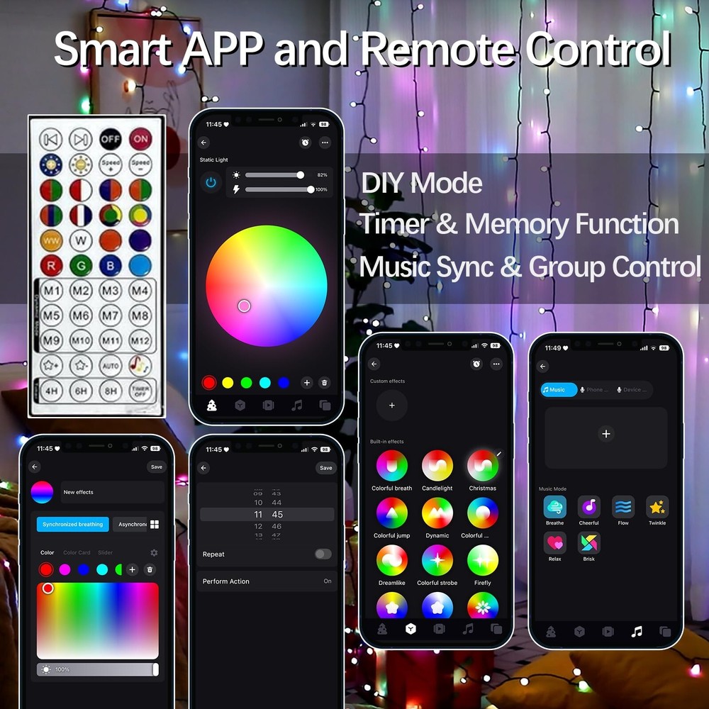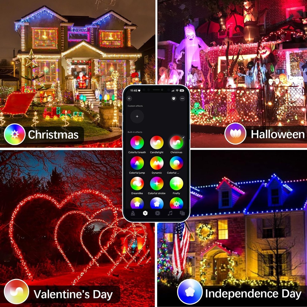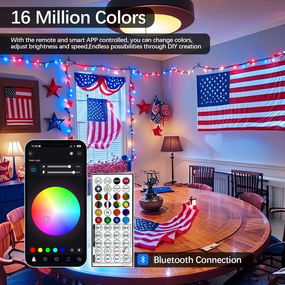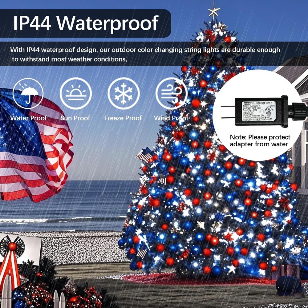 Smart Color Changing Patriotic Lights with Remote & APP, 66FT 200LED RGB Dimmable Red White and Blue Lights, Waterproof Fairy Twinkle Light for Indoor Outdoor Independence Day 4th of July Decorations Product Details Size: 200LED Brand: EEW MPN: JT-DC300V0300-D UPC: Does not apply EAN: Does not apply Color: rgb200 Brand: EEW Indoor/Outdoor Usage: Outdoor, Indoor Special Feature: Dimmable, Timer, Waterproof, Music Synn, Color Changing Light Source Type: LED Power Source: Corded Electric Light Color: RGB Theme: Easter, Christmas, Birthday, Halloween, Thanksgiving Occasion: Easter, Christmas, Halloween, Thanksgiving, Valentine's Day Style: Modern Package Dimensions : 6.3 x 4.06 x 3.43 inches; 1.04 Pounds Item model number : JT-DC300V0300-D Date First Available : September 29, 2024 Manufacturer : CHANGZHOU JUTAI ELECTRONIC CO., LTD. Country of Origin : China Customer Reviews: 4.4 4.4 out of 5 stars 344 ratings Color: rgb200 Brand: EEW Indoor/Outdoor Usage: Outdoor, Indoor Special Feature: Dimmable, Timer, Waterproof, Music Synn, Color Changing Light Source Type: LED Power Source: Corded Electric Light Color: RGB Theme: Easter, Christmas, Birthday, Halloween, Thanksgiving Occasion: Easter, Christmas, Halloween, Thanksgiving, Valentine's Day Style: Modern Material: Plastic, Metal Controller Type: Remote Control, App Control Connectivity Protocol: Bluetooth Connectivity Technology: Bluetooth, Infrared Number of Light Sources: 200 Voltage: 29 Volts Bulb Shape Size: B9 Wattage: 6 watts Included Components: Remote, String Lights Number of Items: 1 Control Method: App, Remote Water Resistance Level: Waterproof Wireless Communication Technology: Bluetooth Seasons: All Seasons Form Factor: Linear Manufacturer: CHANGZHOU JUTAI ELECTRONIC CO., LTD. Part Number: JT-DC300V0300-D Item Weight: 1.04 pounds Package Dimensions: 6.3 x 4.06 x 3.43 inches Country of Origin: China Item model number: JT-DC300V0300-D Special Features: Dimmable, Timer, Waterproof, Music Synn, Color Changing Batteries Included?: No Batteries Required?: No Date First Available: September 29, 2024 Smart RGB Color Changing String Lights: Our green wire fairy string lights come with 16 million colors and 40 vibrant built-in scene modes to satisfy your diverse lighting needs. Made with 99ft durable green wire and 200 ultra-bright LED, the twinkle lights will be an ideal choice for your home decor to create the perfect atmosphere. Whether you want to create a fanatical party scene or a charming holiday atmosphere, our colorful lights have your preferences covered Remote and APP Control: The smart LED string lights can be controlled by remote and Surplife APP. Download the "Surplife" app from the App Store, Google Play Store or scan the QR code on the link image or instruction, and connect the outdoor string lights with it through Bluetooth. With the remote and smart APP controlled, you can change colors, adjust brightness and speed, set scene modes and timer function. Much more convenient and efficient Timer and Memory Function: With built-in timer, you can set "4H" "6H" or 8H by remote, the Christmas lights will be automatically on for 4/6/8 hours and off for 20/18/16 hours per day. To cancel the timer, simply press the "TIMER OFF". You can also conveniently schedule your color changing lights to turn on and off through the APP. Just like setting an alarm clock, you can turn it on and off at any time without restrictions. The string light has a memory function, whenever you restart it, it will return to the color and lighting mode before you turn off the power. No need to reset every time DIY Mode: Our Christmas string lights provide an extensive color palette for you. You can choose from 16 million colors and 34 lighting modes to customize various lighting scene effects to meet your different needs. In customization mode, you can also adjust the running direction, reset the brightness and playback speed of the bulb, edit colors and set the number of lights to be controlled Music Sync and Group Control: This RGB string lights not only dance to the beat of the music, but also react to the sounds you make. The lighting effects change according to the rhythm and beat of the music, creating a lively and dynamic atmosphere. Perfect for parties, get-togethers or moments of relaxation to enjoy visual and auditory feasts. With the group control feature, you can connect multiple sets of smart fairy lights and control them simultaneously, allowing you to easily synchronize the color, brightness, speed, and schedules of the lighting in this group Perfect Holiday and Scene Decorations: This color changing decorative string lights are perfect for all kinds of festivals and scenes. With built-in multiple holiday color and dynamic scene modes, you can easily adjust it to red white and blue of Independence Day, orange and purple of Halloween, red and green of Christmas, and other color effects suitable for Thanksgiving, parties, weddings, festivals or any holiday and harvest ceremony. The outdoor Christmas lights waterproof can also add fairy charming atmosphere to Christmas trees, roofs, fireplaces, bars, gardens, courtyards, balconies, etc. UL Certified Adapter and IP44 Waterproof: The adapter of the twinkle lights plug in is UL certified and meets all safety standards. With IP44 waterproof design, our outdoor color changing string lights are durable enough to withstand most weather conditions, such as rain, snow, and sleet. Please protect the plug from water or rain when use for outdoor decor