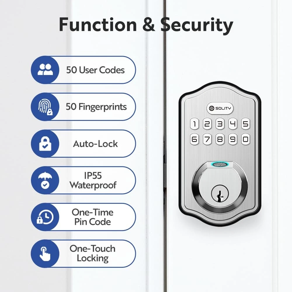 The AT10 Biometric Fingerprint Door Lock ushers in a new era of home security, where convenience meets cutting-edge technology. This sophisticated ANSI Grade 3 certified lock not only offers traditional keyless entry with up to 50 customizable password codes but also introduces biometric access, accommodating up to 50 fingerprint scans. This dual-access system ensures quick, secure entry with a one-time password option for guests, enhancing security without sacrificing convenience. The AT10's robust design is validated by its IP55 certification, showcasing resistance to environmental challenges and the ability to withstand significant force, up to 3000N. Installation is straightforward, designed to fit any standard American door, and the lock is equipped with a C-type USB port for emergency power, ensuring you always have access to your home. Backed by a lifetime mechanical warranty and a 1-year electronic warranty, along with 24/7 customer support, the AT10 offers unparalleled security and peace of mind, making it the ultimate choice for those looking to upgrade their home security system. Advanced Keyless Entry & Biometric Guest Access: Our Fingerprint Smart Deadbolt elevates security with dual access options, accommodating up to 50 fingerprint scans and 50 customizable password codes. Each entry method is designed for quick, secure access, with a one-time password feature for guests that enhances security by automatically erasing the code after use. This system meets the rigorous ANSI Grade 3 certification standards. Customizable Auto-Lock & Quick Fingerprint Recognition: Enhance your home's safety with an auto-lock feature that can be set from 10 to 99 seconds, ensuring your door is securely locked after you enter or exit. The deadbolt's cutting-edge fingerprint technology provides access in just 0.3 seconds, combining convenience with high-level security. Environmental Resilience with IP55 Certification: Built to withstand the elements, our fingerprint deadbolt is IP55 rated, proving its ability to resist dust and water exposure. It has passed a 240-hour salt spray test and can endure up to 3000N of force, making it a robust protector against environmental and physical challenges. Effortless DIY Installation: This fingerprint deadbolt is engineered for straightforward installation on any standard American door, adaptable for both left and right-handed orientations. With simple tools, you can secure your home effectively without professional help. Reliable Emergency Charging: Equipped with a C-type USB port, our deadbolt ensures you're prepared for any situation, offering an emergency charging option that guarantees you'll always have access to your property, even when the power is low. Unmatched Warranties for Peace of Mind: Trust in our commitment to your security with a lifetime warranty on mechanical parts and a 1-year warranty on the electronic components of the deadbolt. Your investment in safety is protected for the long haul.