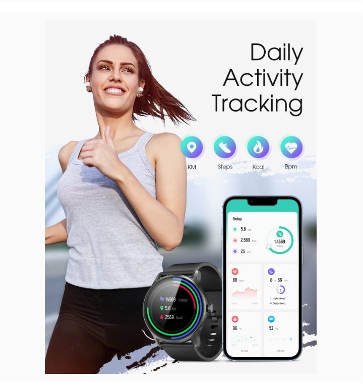 This fitness smartwatch is a game-changer! It keeps me motivated with accurate step, distance, and calorie tracking across 12 sports modes. The 24/7 heart rate, blood oxygen, and sleep monitoring help me understand my health better. It’s waterproof, works with iOS/Android, and the battery lasts long. Perfect for staying active and healthy!