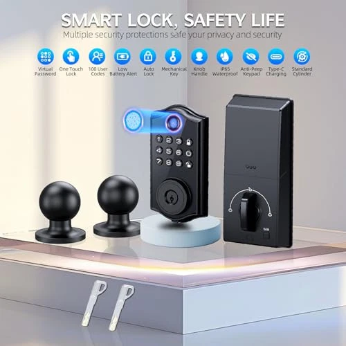 Return Policy Fast Delivery Trusted seller Smart Locks for Front Door,APP Control Keyless Entry Fingerprint Door Lock,Keypad Deadbolt Set with Handle,Easy Installation,Auto-Lock,(Matte Black) Product Description Advanced Fingerprint Recognition: Our state of the art fingerprint door lock can store up to 50 unique fingerprint codes and 50 digital codes, including three manager codes for heightened security. Unlock your door in just 1 second with seamless fingerprint identification. Plus, generate and share permanent, temporary, or one-time passwords remotely via the app for guests and babysitters Smart Security Features: Enhance your home security with an adjustable auto-lock feature that activates in 1 second to 30 minutes. Effortlessly lock the door using the exterior keypad with a simple “one-touch lock.”interior, easily lock and unlock with the knob in a split second—perfect for quick entries and exits Versatile Access Options: Experience the ultimate convenience with multiple access methods—fingerprint recognition, smartphone app, customizable codes, e-key sharing, or a traditional mechanical key. This smart lock is perfect for various settings, including homes, commercial,properties, apartments, offices, and hotels Hassle-Free Installation: Our smart lock installs quickly with just a screwdriver. Compatible with 1-3/8" to 2 (35mm to 50mm) thick doors, it's suitable for all standard American left and right-handed doors. The lock runs on 4 AA batteries for up to 12 months, features a low battery alert, and includes an external Type-C emergency power supply. Even when the batteries are depleted, your access codes remain stored securely, ensuring hassle-free entry. Durable Keypad Door Lock:Our smart lock for front doors comes complete with 2 knob handles and a user friendly keypad deadbolt featuring backlighting, adjustable volume, and a convenient vacation mode. Built to last, it boasts an IP65 weatherproof rating, effortlessly withstanding temperatures from -4°F to 122°F Touch & Go Fingerprint Lock: lock's fingerprint scanner boasts high security against spoofing, leveraging advanced biometric technology and a multi-layer security approach. It employs live data detection to effectively reject counterfeit prints made from materials like silicone or clay, ensuring robust protection against unauthorized access.Experience seamless usability with our lock's 360-degree fingerprint recognition capability, allowing for quick and effortless access from any angle. Security Anti-Peep Electronic Keypad:For added security and to prevent snooping, our system utilizes an anti-snooping password feature. This feature allows the user to add random numbers (up to 20 digits) before and after the password when entering the correct password. Shipping Returns Payment Shipping Shipping is FREE to all addresses other than APO/PO boxes in the lower 48 states. All our stock ships from US-based warehouses. Shipped via USPS or UPS (depending on location and package weight) Unless stated otherwise, all orders will ship within 24-72 hours of your payment being processed. Check our feedback to see the great reviews of FAST shipping we offer. Returns Seller does not accept returns Payment We currently accept payment via eBay managed payments only. Once payment is cleared, we will dispatch your shipment within 1-3 business days. Please refer to the "Shipping" tab for more information regarding shipping speed to your destination.