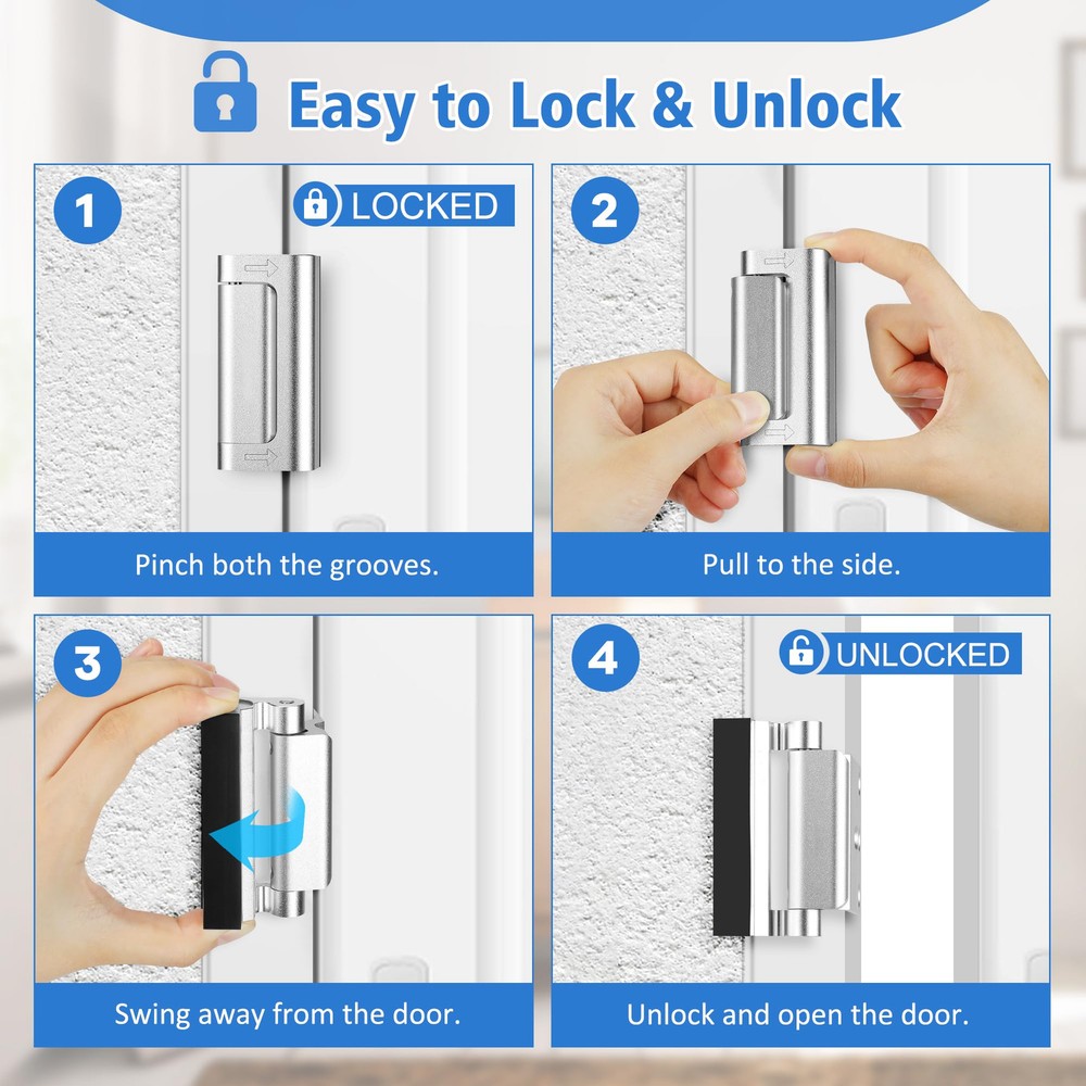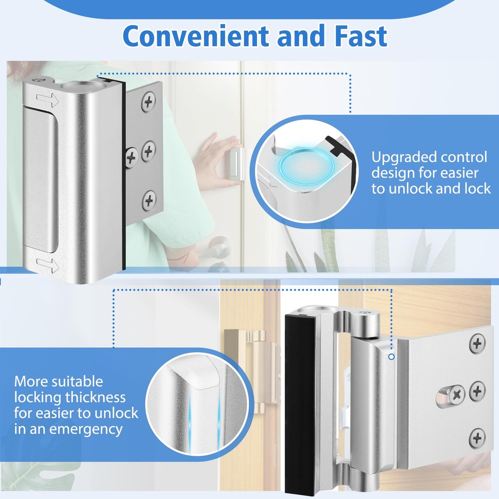 Prevent Forced Entry - Made of all-aluminum alloy, the sturdy home security door locks can withstand 800 lbs of force, 12 times stronger than a normal deadbolt, It can prevent the door from being kicked in, and ensure any door cannot be opened from the outside. This reinforcement safety door lock guards your home safe. Optimal Adaptability - It is suitable for front doors, door inside, bedroom doors, side and garage doors, and basement doors. Use this high-security door reinforcement lock to prevent breaking in. You will be much more confident in your doors being able to sustain any sort of forced entry. Home Security - This reinforcement lock has a spring-loaded design to prevent children from opening the door on their own. While locked, this reinforcement door latch protects against the door being kicked in, lock picking, and bumping and it is designed for women living alone, the elderly. Easy to Install - Each metal door reinforcement lock is equipped with a total of 8 screws including 4 long and 4 short ones, select the appropriate screws, and use an electric drill to install them within 5 minutes. Easily add an extra lock to your door, and match any inward swinging door. Easy to Use - Groove design for easy opening of the door safety locks from the inside, especially in an emergency. Unlocking and locking can be completed within a second. No tools are required to open it, just a little practice. The most convenient and fast door security device. We offer a one-year free warranty on our products.