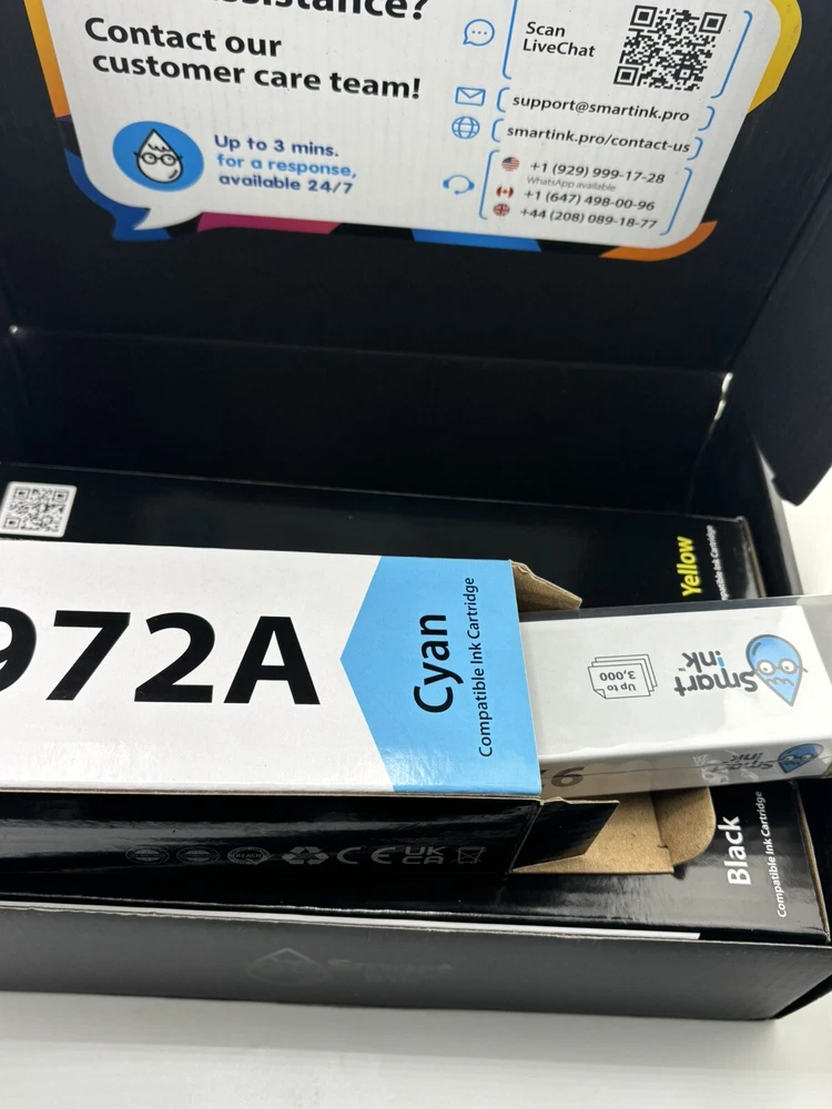 The "Smart Ink Compatible Ink Cartridge Replacement for HP 972A - 4 Pack" offers a convenient solution for HP printer users seeking high-quality ink replacements. The pack includes cyan, yellow, magenta, and black cartridges, ensuring a complete set for various printing needs. With Smart Ink as the brand, users can expect reliable compatibility and performance comparable to original HP cartridges. Each cartridge is sealed to maintain freshness and prolong shelf life, providing a cost-effective alternative for those looking to maintain print quality without compromising on results.