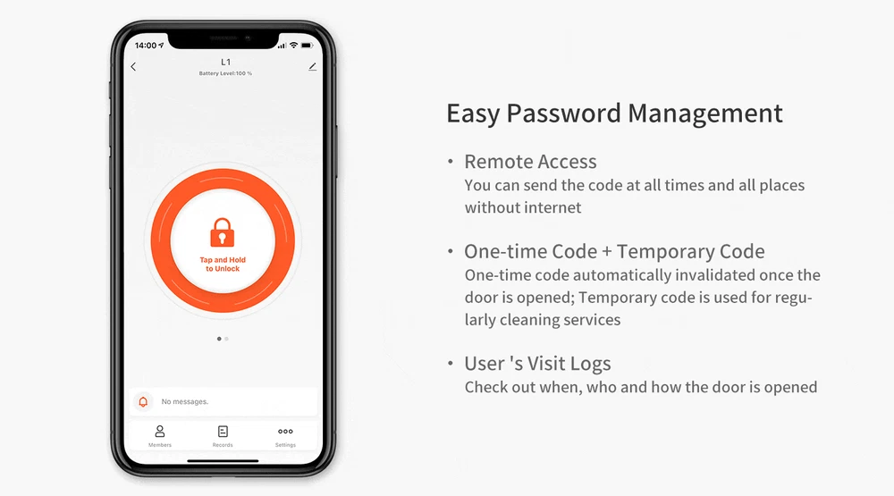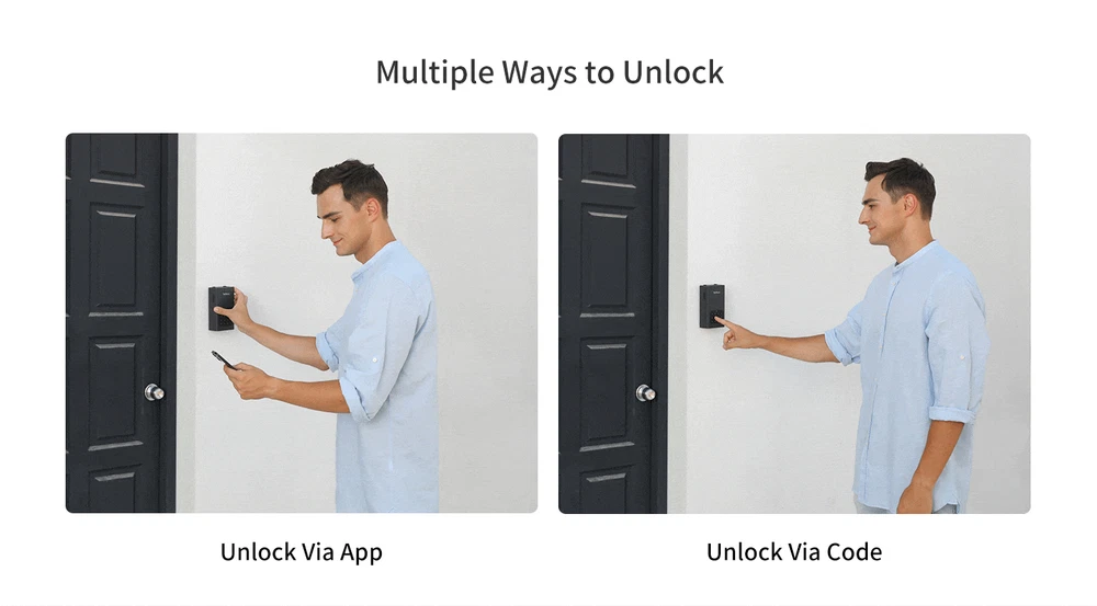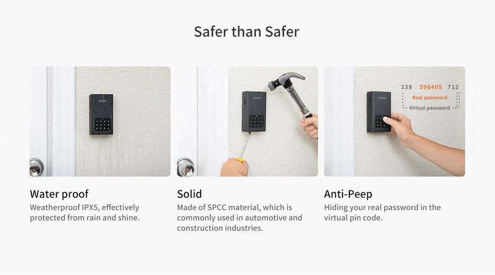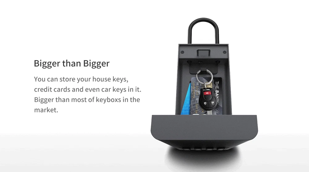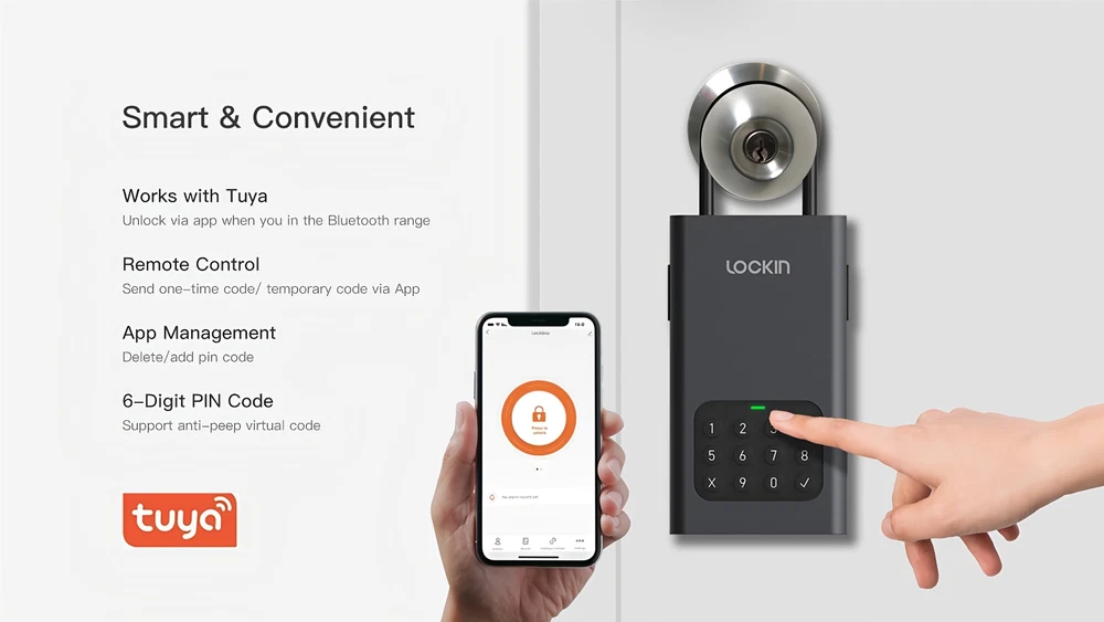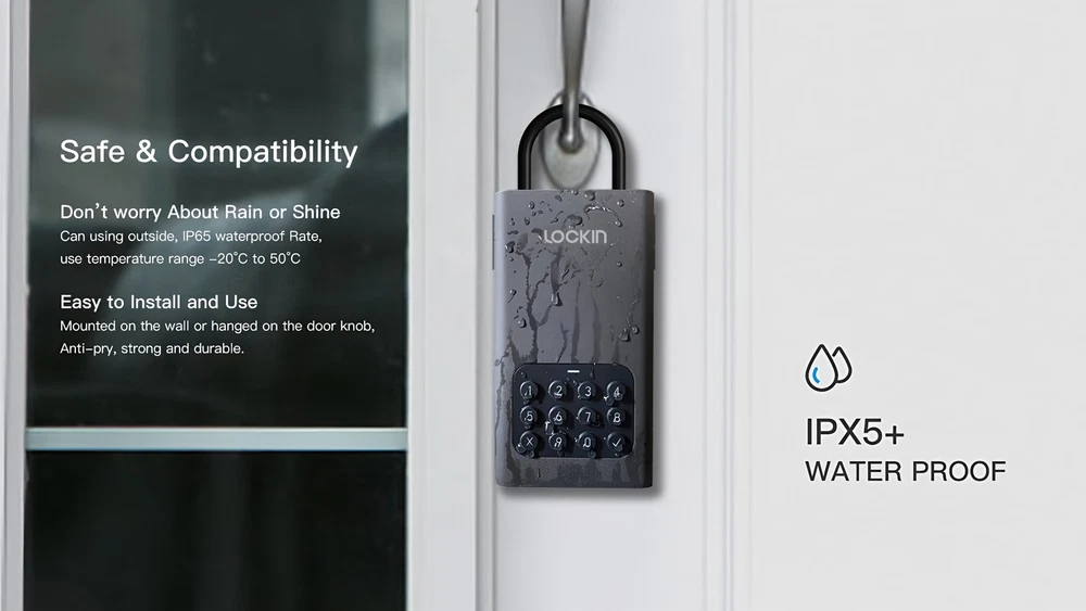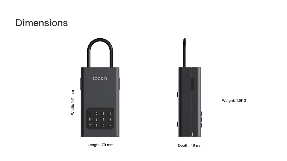Specifcations: Product Model: Lockin Smart Lock Box L1 Unlock Ways: For Bluetooth,PIN Code Installation Ways: Wall mount /Shackle Body Material : Sheet Metal Shackle Material: Stainless Steel Password Length: 6 digits,support 16-digits Password Capacity: 30 Groups Bluetooth Distance: 1 Meter Net Weight: about 1KG Working Temperature: -20℃ - 50℃ Certifications: CE,FCC, ROHS Emergency Power: Type-c Battery: 2AA Batteries (not include) Standby Time: 12 Months Package List: Lock Box L1*1 Shackle *1 Screw Driver *1 Battery Cover *1 Quick Start Guide *1 Wall Anchor Screws *4 Battery Cover Screws *6
