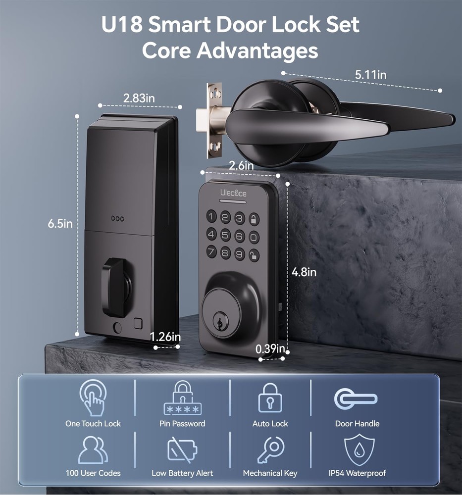 Keyless Entry Door Lock Deadbolt with Handle Set, Keypad Door Lock with Handle Smart Door Locks for Front Door with Set Code Door Lock with Easy Installation, Auto Lock, Matte Black Keyless Entry Deadbolt with Handle Set: smart keyless entry door lock supports multiple ways to access, 100 user codes (97 users and 3 admin passcodes), one- time code, 2 backup keys. Everything you need in 1 safe and secure smart lock. Smart Access Management: Front door lock set keyless entry with handle are 3 administrators and 97 user codes. Generate and share one-time, permanent and scheduled codes with your family,house sitters, guests. Perfect for homes, Airbnb, apartments, offices, and hotel. Auto-Lock Convenience: Digital door locks for front door is designed with a smart one-touch switch. Keypad door lock offers one-touch lock feature to control the door easily. You can enable the auto-lock feature and set the timer from 10s-30s! Besides, there is a “one-touch lock” function on the rear lock body, making it convenient for you to lock and unlock in a timely manner. Now you don't need to worry about forgetting to lock the door. Safeguard Home Security: Keypad door lock with handle equipped with auto-lock, one-touch locking, anti-peeping code, low battery alert to enhance your home security. Additionally, the lock is powered with 4 AA batteries (not included) could be used for around 180 days without frequent battery replacement. Our door lock is built to withstand extreme temperatures (-4℉ to 140℉) and is IP54 waterproof. It's an essential tool for your home. Easy to Install: The door locks for front door no extra drilling and costly locksmith required, just use a screwdriver to easily install and program the door lock in 15 minutes. It is compatible with left and right-hand doors.