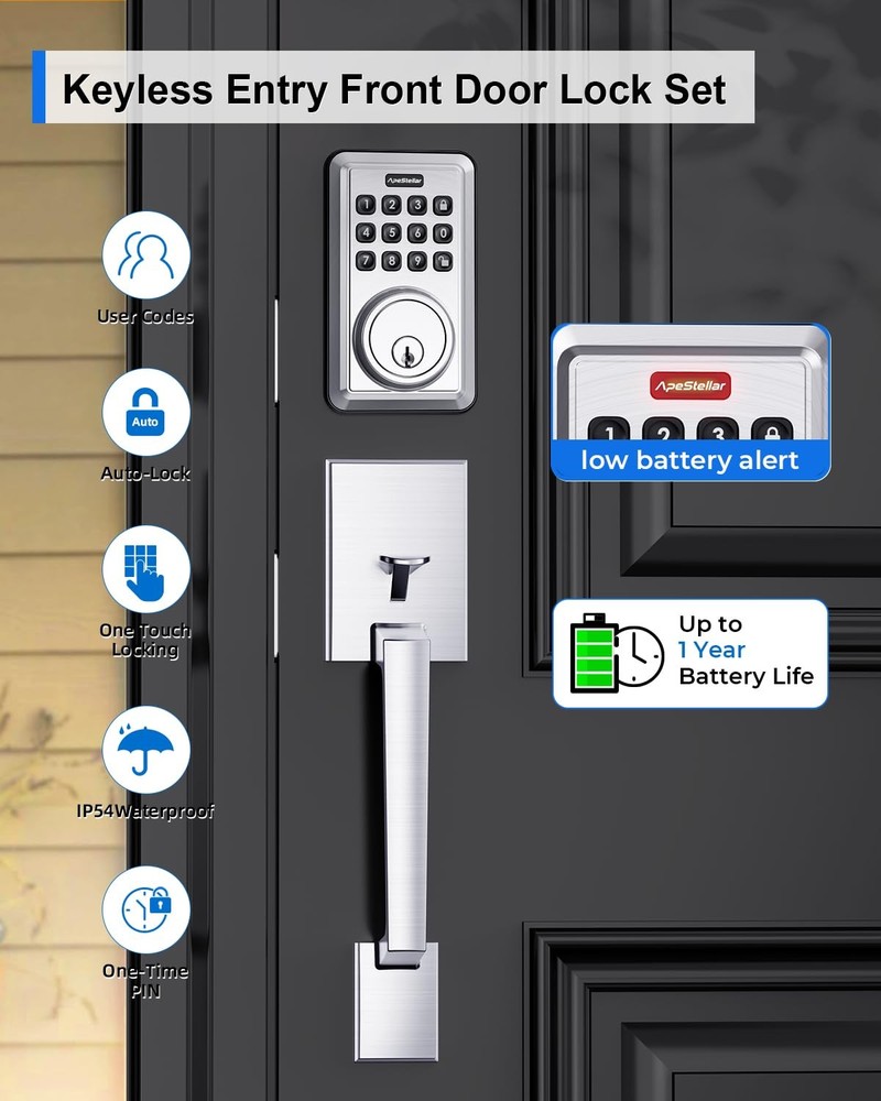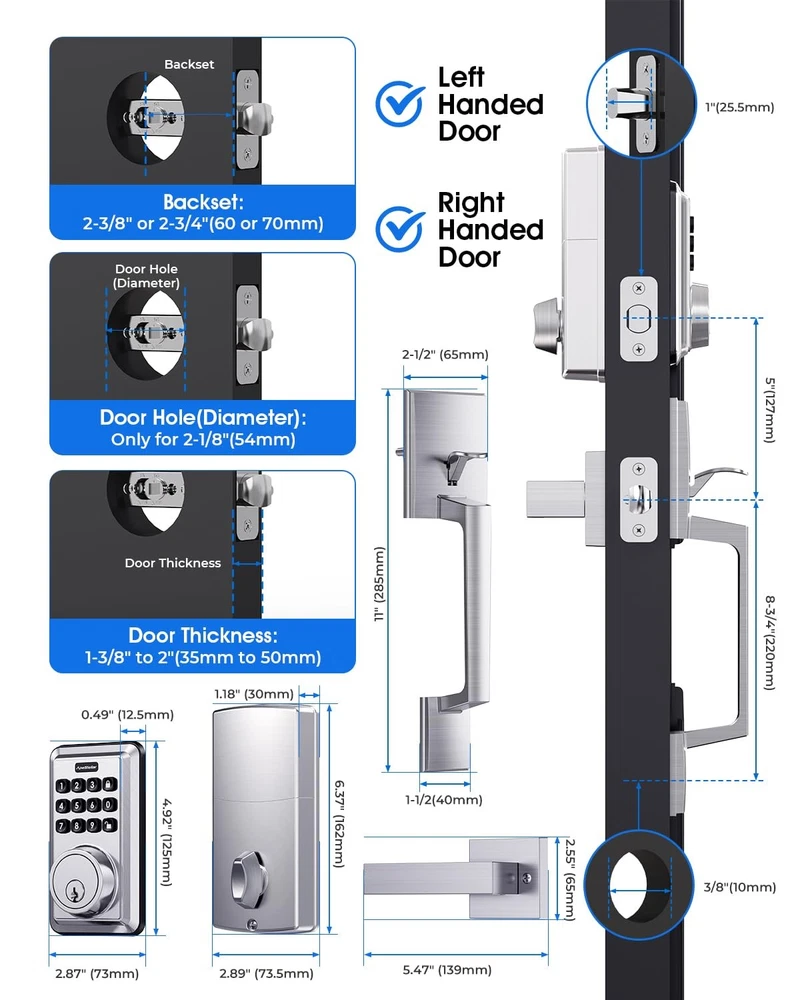 keyless door lock Keyless Entry Door Lock Deadbolt with Handle Set: smart door lock can create 50 passcodes for family daily use along with temporary one-time passcodes, for visitors, service personnel or other single-use entry. Security Front Door Lock Set: This electronic door lock with code is made of heavy zinc alloy instead of light weigh aluminum alloy, with strong motor, stable structure, sturdy cylinder, IP54 weather resistance, keypad deadbolt and handle with high-quality is certified ANSI Grade 3, for use on exterior door lock set where keyed entry and security is needed. Auto Lock & One Touch Lock: Featured anti-peep code protection and backlit keypad, our front door lock set with keypad can customizable automatic door locking after 5-900 seconds. Also a dedicated lock button can be one-touch lock. Friendly for elderly and kids. Keypad Door Lock with Handle: A deadbolt combined with front door handle and lever, featuring wrong code attempt limit, vacation mode, mute mode, low battery warning and excellent style design, perfect for your home or rental, traditional or modern decoration style. Easy Installation:keyless entry door lock deadbolt with handle set includes all necessary hardware, adjustable latch to fit 2-3/8" or 2-3/4" backset.You can replace your existing deadbolt handle set in about 15 minutes with just a screwdriver for just men and women. Compatible with all American standard left and right handed doors.