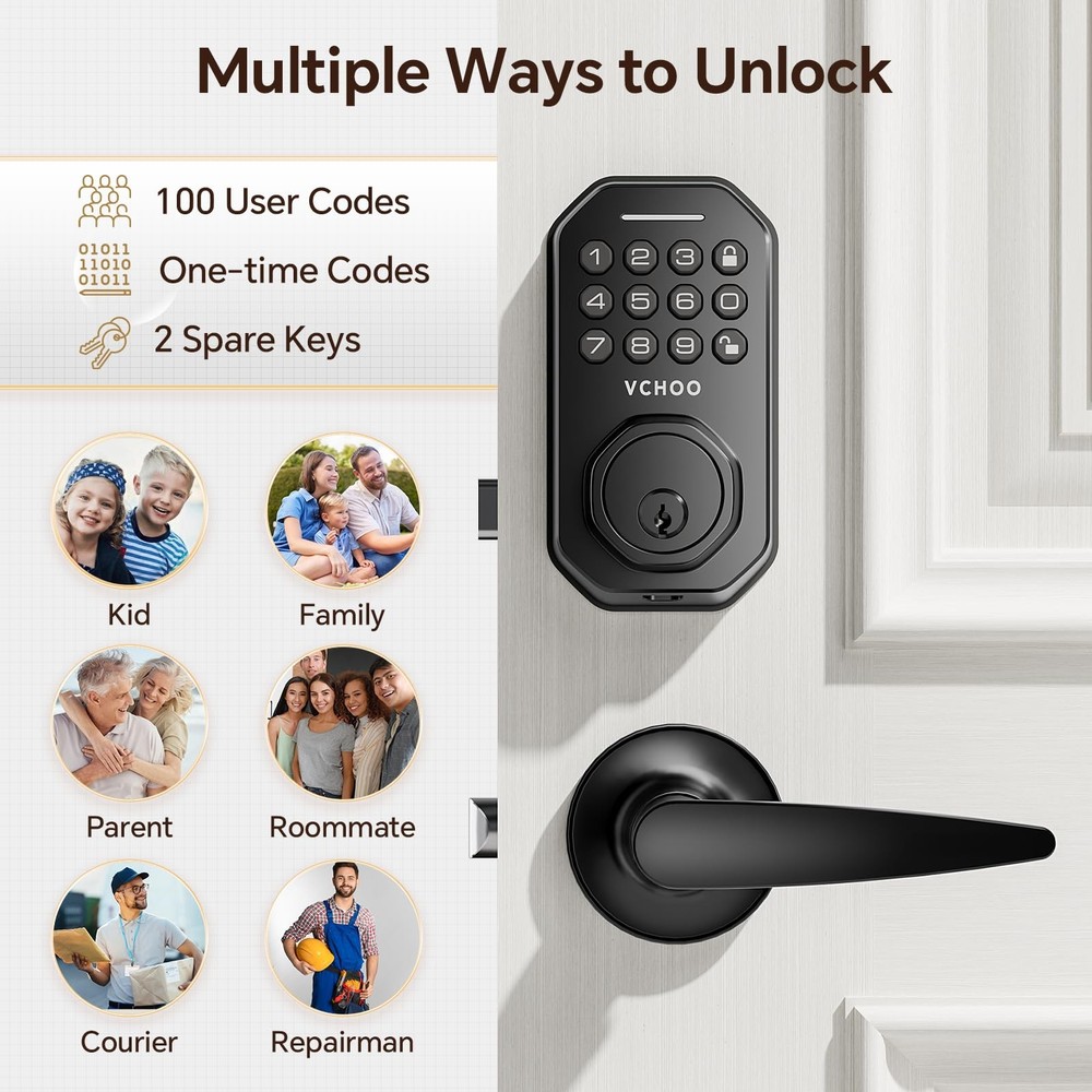 keyless entry door lock deadbolt with handle set keyless entry door lock with handle front door lock set keyless entry Multiple Ways To Access Keyless Entry Door Lock: keyless entry door lock deadbolt with handle set supports multiple ways to unlock, 100 user codes, one-time code, 2 physics keys. Door locks for front door was widely used in self-housing, hosts,offices,rental property management, school, hotels. Effortless Door Locks for Front Door: Smart keyless entry door lock has an automatic door lock function that can be set to auto-lock in 10-30 seconds and one-touch auto-lock by pressing, there's also a one-click button on the back of the lock, making life easier. Durable Front Door Lock Set, Secure Living Assistant: The smart locks for front door not only meets ANSI level 3 smart door lock core, lock body made of zinc alloy, IP54 waterproof (protect your home, rain or wind), but also specially set anti-snooping user password protection, all-round protection of your security. Convenience Door Locks: We have designed low battery alert function, once the smart door lock appears green light, please replace the low 4 AA batteries in time, in special cases, you can borrow the emergency TYPE-C charging port of the door lock to unlock. (Notice: 4 AA batteries are not included in the package). Easy to Install: The keypad door lock with handle has 2 matching Lever handles. No locksmith is needed. Replace existing locks in minutes with a screwdriver, compatible with left and right-hand doors. (Door thickness range 1.31 "-2.16"). door locks equally at home in both time-honored and cutting-edge residential designs. Profession Sales Team: is committed to providing quality products and customer service. We strictly check and control every link of the product. If you have any questions about our front door lock, please get in touch with us, we are at your service.