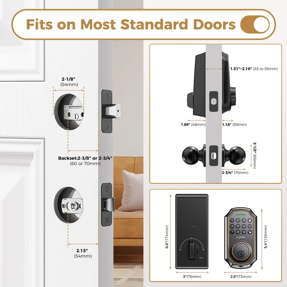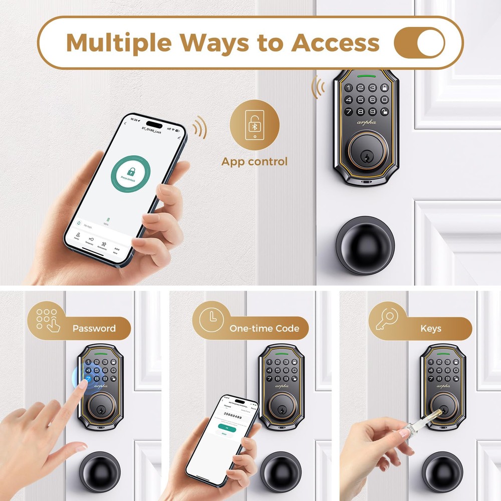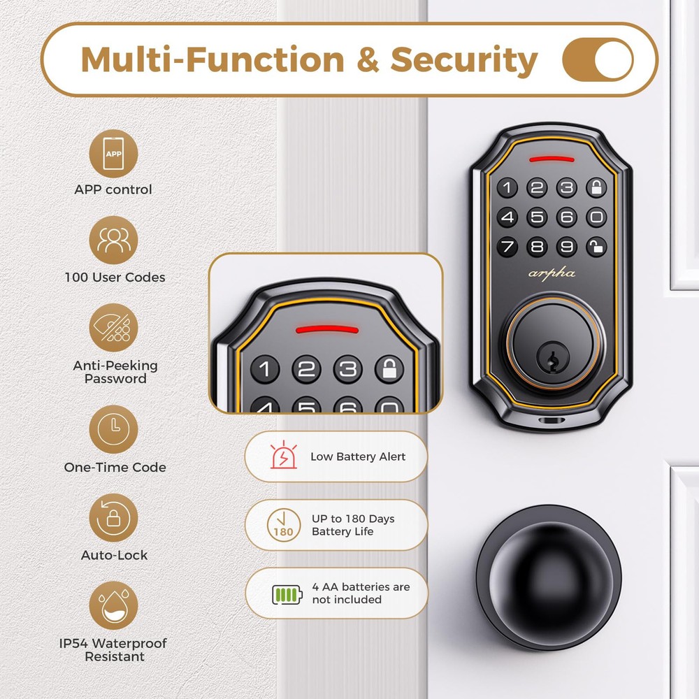 Keyless Entry Door Lock: keyless entry door lock could be unlocked via App + Password + EKey + Mechanical key. Smart deadbolt supports 100 groups of access codes for the front door, including 97 users and 3 admin passcodes. Everything you need in 1 safe and secure smart lock. App Control: User could generate and share -time, permanent, scheduled, and recurring code with your family, house sitters and guests. Manage users, and view access records in the app management system. The App is no additional charge and can be used forever. App remote unlocking requires the use of a gateway : B09YHFG933 Auto Lock and Touch Lock: Electronic keypad door lock is designed with a smart -touch switch. Keypad door lock offers -touch lock feature to control the door easily. You can enable the auto-lock feature and set the timer from 10s-30min! Now you don't need to worry about forgetting to lock the door. Anti Peeping Password: keyless entry door lock deadbolt with handle set supports 16-digit virtual password unlocking method. Users could unlock by entering 10 to 8 digits before or after setting a 6 to 8 digit password. Add random numbers before or after your correct passcode to protect it from prying eyes. Long Battery Life: Keypad door lock supports 4 AA batteries. **Batteries would not be included in the package.** Digital door lock could be used for around 180 days without frequent battery . Easy to Install and Programme: keypad code door lock fits for most US standard left and right hand doors. You can easily install it in a few minutes without drilling. VIDEO GUIDE will walk you through the whole setting process. ๐๐ฑ๐๐๐ฉ๐ญ๐ข๐จ๐ง๐๐ฅ ๐๐ฎ๐ฉ๐ฉ๐จ๐ซ๐ญ & ๐๐ฌ๐ฌ๐ฎ๐ซ๐๐ง๐๐: Our dedicated support team is available 24/7 after-sales service to assist you.offers a 30-day money-back and 18 monthassurance and technical support, Please do not hesitate to tell us if you need ourhelp.